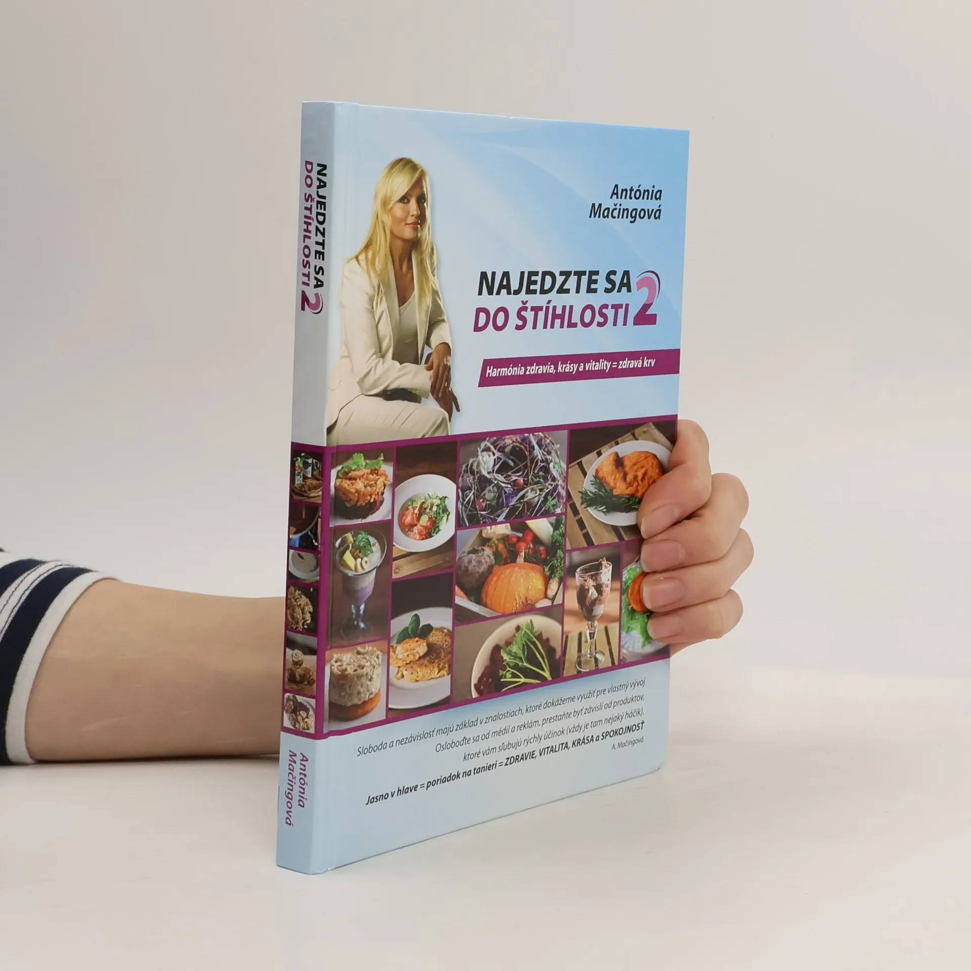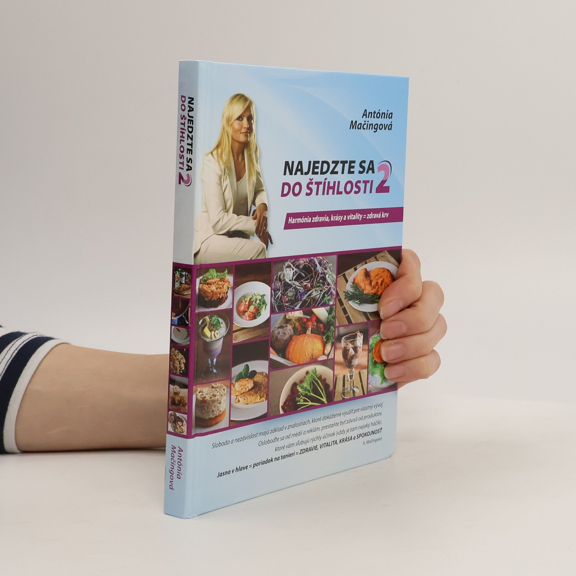Harmónia zdravia, krásy a vitality = zdravá krv Voľné pokračovanie knihy Najedzte sa do štíhlosti V ruke držíte pokračovanie bestselleru Najedzte sa do štíhlosti. Autorka v tejto novej knihe vysvetľuje jednoduchý princíp prechodu od bežného stravovania k stravovaniu, ktoré je správne a prospešné. Bežné stravovanie a nevhodný spôsob zmýšľania o sebe, majú za následok, že sme ľahkou korisťou farmaceutického priemyslu a drahých, často neúčinných výživových doplnkov. Nájdete tu aj veľké množstvo receptov pre ľudí, ktorí nekonzumujú mäso. Takisto tu nájdete ukážku netradičného vianočnéhomenu a príbeh Simonky, žiačky AntónieMačingovej. Simonka je jednou z vás.Uvidíte premenu jej fyzického tela, a tiež to, ako sa zmenila na kreatívnu mladú ženu, tým, že sa zbavila zdedených i získaných návykov. Pochopila, že jedinou prekážkou, ktorá námbráni byť spokojnými a šťastnými ľuďmi, smemy sami. Jo-jo efekt se neprejaví, pokiaľ sa nevrátite k pôvodnýmstravovacímamyšlienkovýmnávykom. AntóniaMačingová