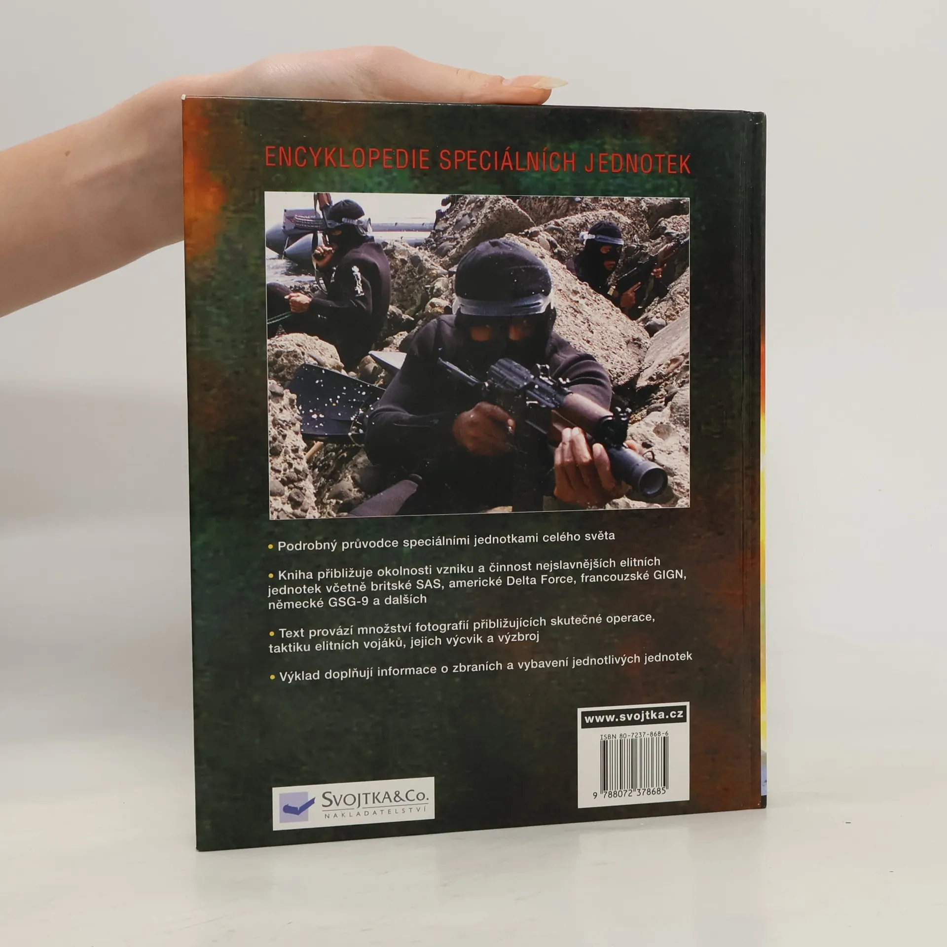 Taktika / historie / strategie / zbraně. Zelené barety / SEAL / SPECNAZ / SAS / GIGN / GSG-9. OBSAHUJE VÁLKU V IRÁKU 2003 Mnohé jednotky se poprvé představují veřejnosti na stránkách této knihy, která tak svým čtenářům poskytuje jedinečný pohled do zákulisí jejich činnosti, výběru nových vojáků, výcviku, dovedností a nástrojů. S pomocí této encyklopedie speciálních jednotek poznáte, co to znamená být členem těchto elitních sil.