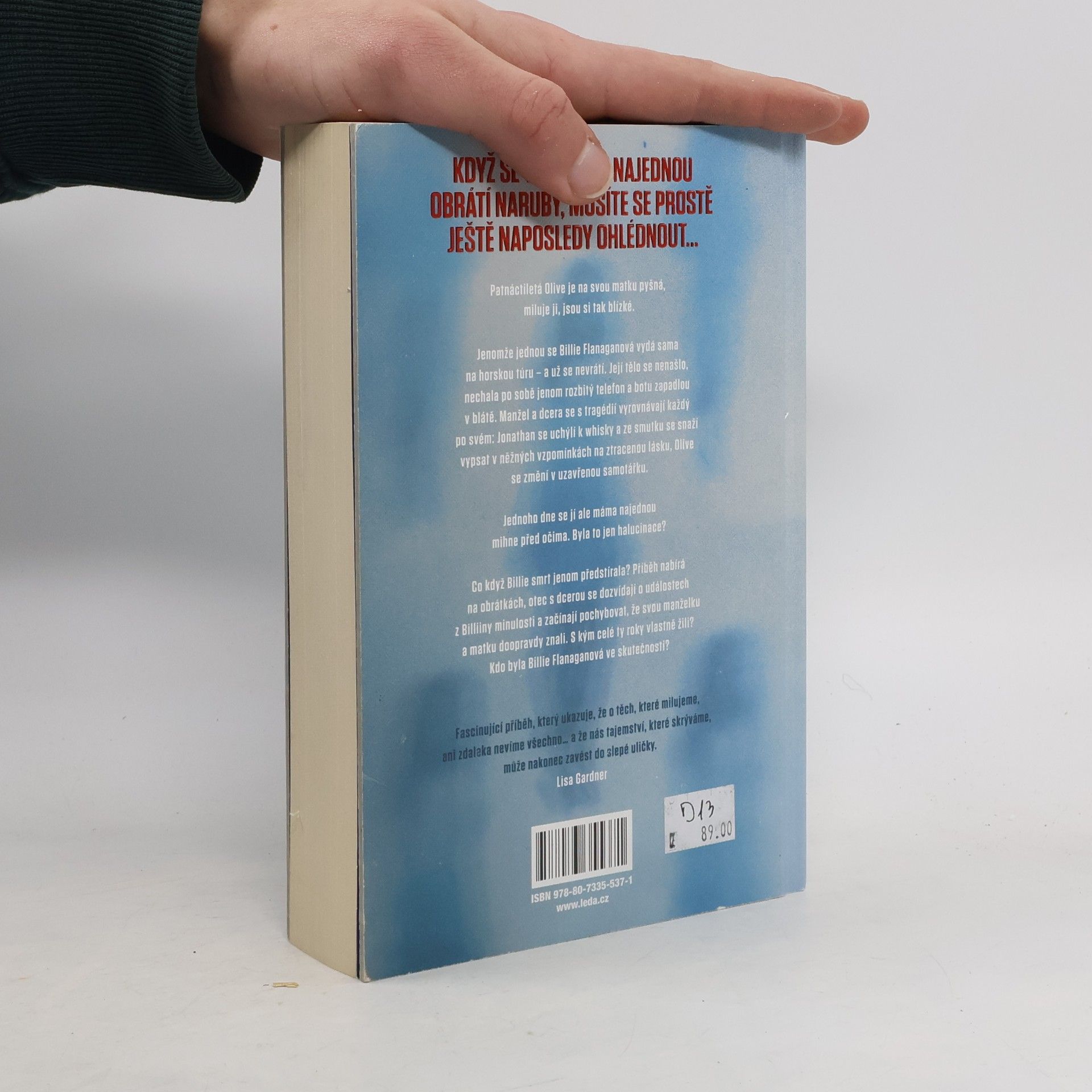 Před rokem se Billie Flanaganová vydala sama na horskou túru – a od té doby ji nikdo nespatřil. Záchranáři našli jen její rozbitý mobil a jednu pohorku, tělo ale ne. Manžela a dospívající dceru tragédie těžce zasáhne – Jonathan hledá útěchu v občasném pití, Olive se propadá do osamělosti a pronásledují ji podivné vidiny a halucinace, jako by její matka byla stále naživu. Její otec má o trápení víc… a vtom náhodou narazí na tajemství z minulosti, které před ním Billie dokázala skrýt. Jeho představy o vlastní ženě se zhroutí. Nakolik ji doopravdy znal? Kdo vlastně Billie Flanaganová byla? Olive se spolu s otcem snaží vypátrat pravdu, a to nejenom o Billie, ale také o sobě samých. Láska je někdy opravdu slepá a to, co nechceme vidět, prostě nevidíme. Zamysleli jsme se někdy nad rozdílem mezi dojmem, který jsme si utvořili o člověku, kterého milujeme, a tím, jaký ve skutečnosti je?