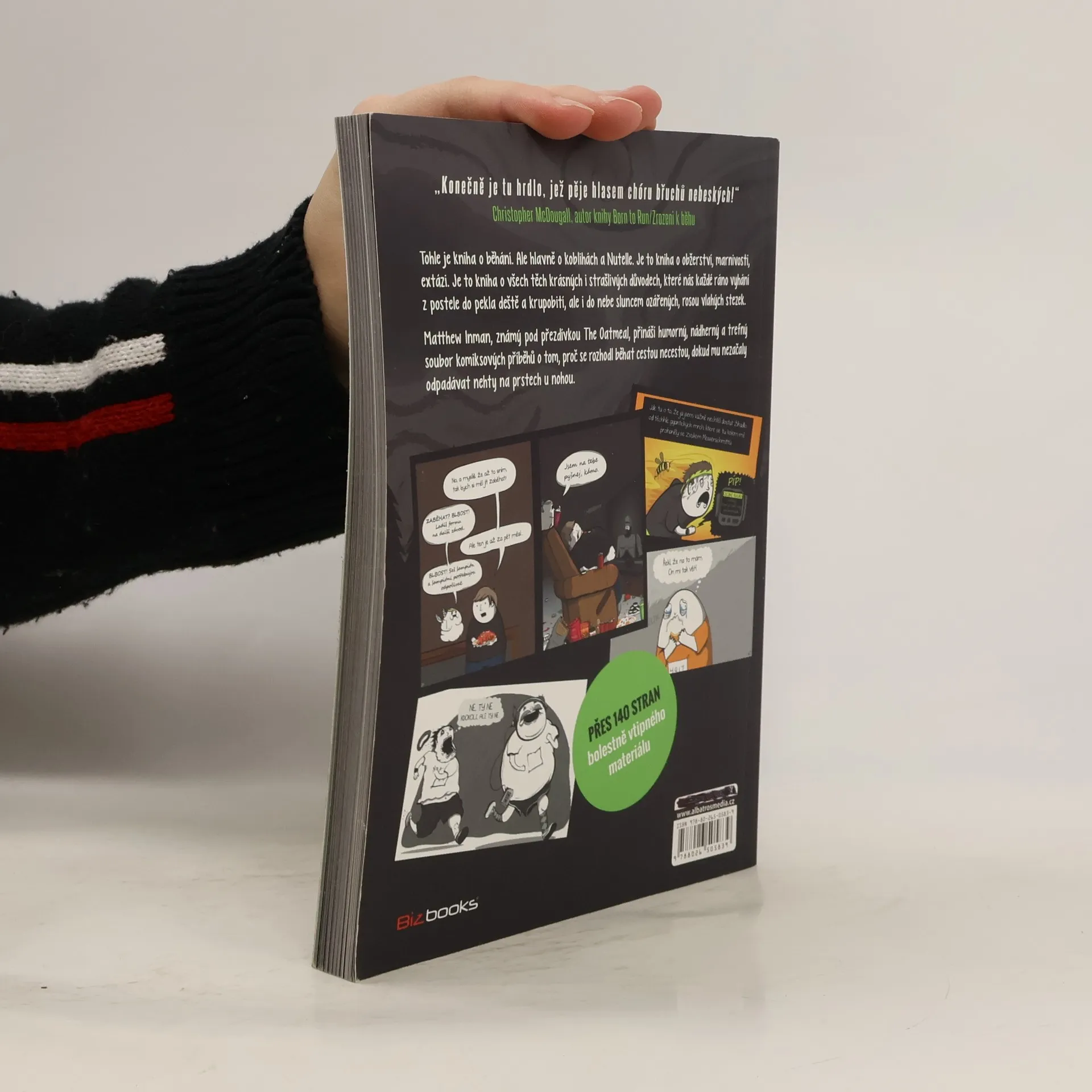 Tohle je kniha o běhání. Ale hlavně o koblihách a Nutelle. Je to kniha o obžerství, marnivosti, extázi. Je to kniha o všech těch krásných i strašlivých důvodech, které nás každé ráno vyhání z postele do pekla deště a krupobití, ale i do nebe sluncem ozářených, rosou vlahých stezek. Matthew Inman, známý pod přezdívkou The Oatmeal, přináší humorný, nádherný a trefný soubor komiksových příběhů o tom, proč se rozhodl běhat cestou necestou, dokud mu nezačaly odpadávat nehty na prstech u nohou. Přes 140 stran bolestně vtipného materiálu! „Konečně je tu hrdlo, jež pěje hlasem chóru břuchů nebeských!“ -Christopher McDougall, autor knihy Born to Run/Zrozeni k běhu „Všichni běžci si dříve nebo později začnou klást otázku, proč to vlastně dělají. Vysvětlení, které tu předkládá Matthew Inman je jedno z nejvýstižnějších, na které jsem kdy narazil. A také nejzábavnější. Zřejmě to bude tím, že je asi tak trochu duševně chorý.“ -Mark Remy, šéfredaktor magazínu Runner's World, autor knihy The Runner's Rule Book