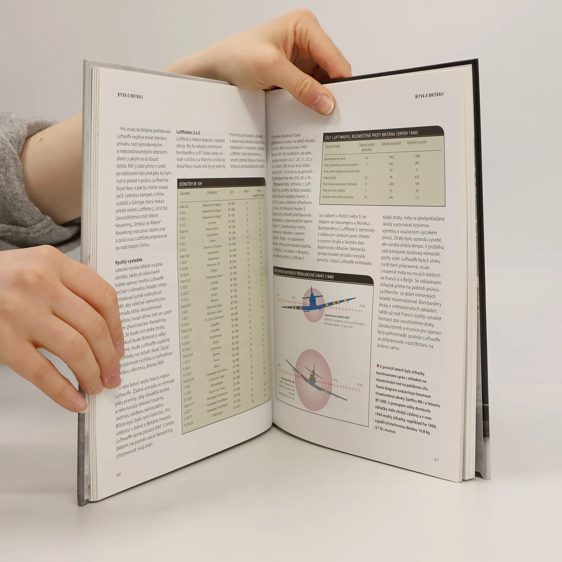 Důležitá data o Luftwaffe jsou rozdělena podle témat a kampaní, včetně předválečné historie německých leteckých sil, o výrobě letadel, pozemních silách, tažení do Polska, Francie, Nizozemí, o Bitvě o Británii, středomořských bojištích, východní frontě a o obraně Říše. Dozvíte se o efektivitě taktických bombardérů - letounů He -111 a Ju-87, jak se stíhačka Bf-109 potýkala s nejlepší spojeneckou technologií, jakou představoval například Spitfire, o esech Luftwaffe s nejvyšším skóre na východní frontě a o vývoji letounů X a zbraních odvety. Údaje a počty najdete v přehledných tabulkách, diagramech, grafech a mapách.