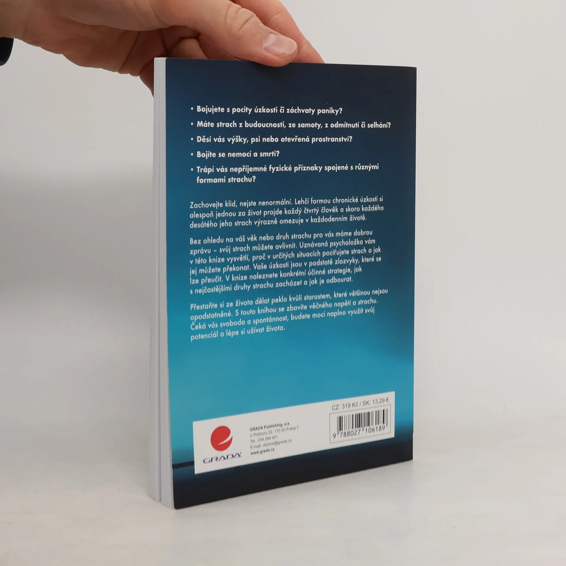 Bojujete s pocity úzkosti či záchvaty paniky? Máte strach z budoucnosti, ze samoty, z odmítnutí či selhání? Děsí vás výšky, psi nebo otevřená prostranství? Bojíte se nemocí a smrti? Trápí vás nepříjemné fyzické příznaky spojené s různými formami strachu? Zachovejte klid, nejste nenormální. Lehčí formou chronické úzkosti si alespoň jednou za život projde každý čtvrtý člověk a skoro každého desátého jeho strach výrazně omezuje v každodenním životě. Bez ohledu na váš věk nebo druh strachu pro vás máme dobrou zprávu – svůj strach můžete ovlivnit. Uznávaná psycholožka vám v této knize vysvětlí, proč v určitých situacích pociťujete strach a jak jej můžete překonat. Vaše úzkosti jsou v podstatě zlozvyky, které se lze přeučit. V knize naleznete konkrétní účinné strategie, jak s nejčastějšími druhy strachu zacházet a jak je odbourat. Přestaňte si ze života dělat peklo kvůli starostem, které většinou nejsou opodstatněné. S touto knihou se zbavíte věčného napětí a strachu. Čeká vás svoboda a spontánnost, budete moci naplno využít svůj potenciál a lépe si užívat života.