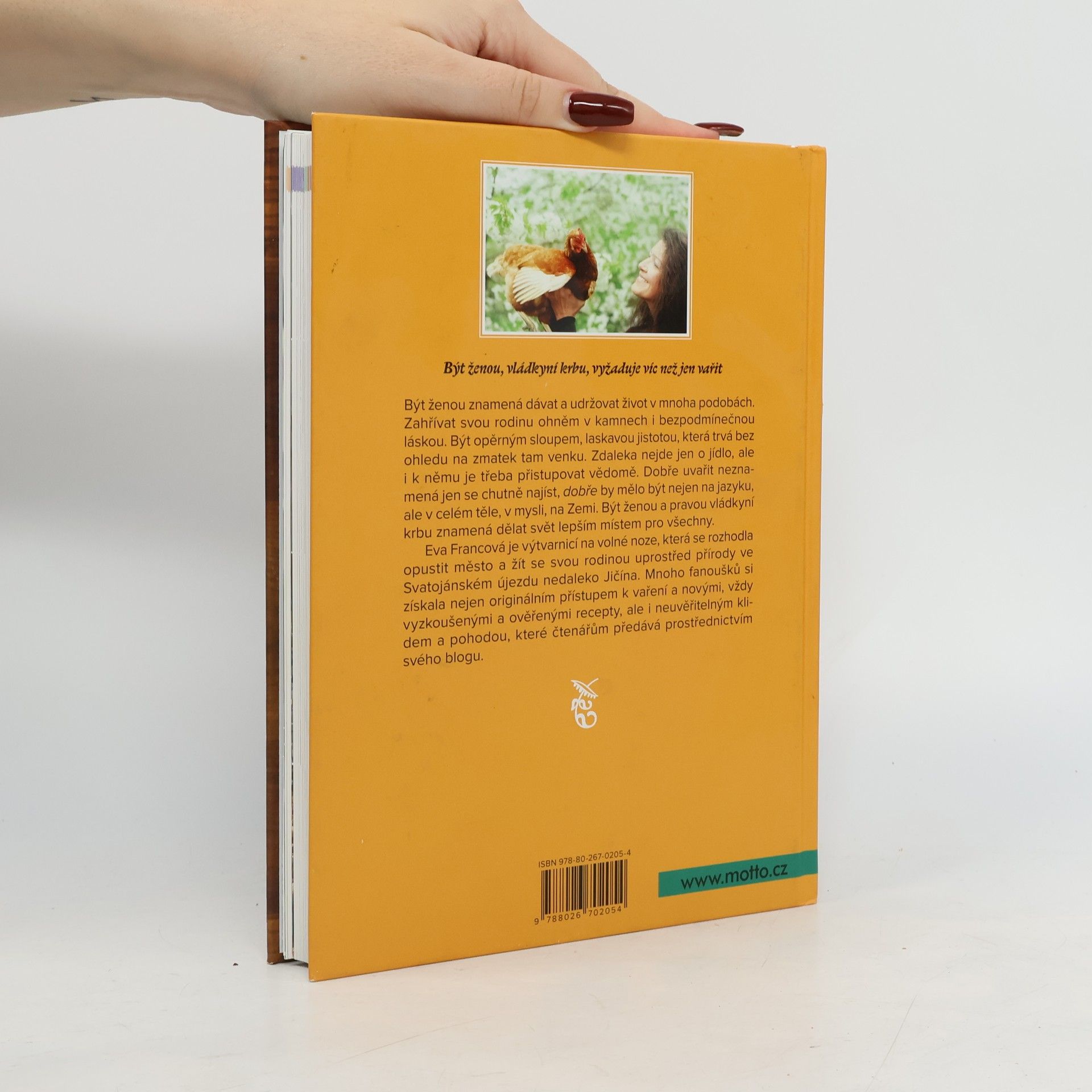 Být ženou, vládkyní krbu, vyžaduje víc než jen vařit. Být ženou znamená dávat a udržovat život v mnoha podobách. Zahřívat svou rodinu ohněm v kamnech i bezpodmínečnou láskou. Být opěrným sloupem, laskavou jistotou, která trvá bez ohledu na zmatek tam venku. Zdaleka nejde jen o jídlo, ale i k němu je třeba přistupovat vědomě. Dobře uvařit neznamená jen se chutně najíst, „dobře“ by mělo být nejen na jazyku, ale v celém těle, v mysli, na Zemi. Být ženou a pravou vládkyní krbu znamená dělat svět lepším místem pro všechny. Eva Francová je výtvarnicí na volné noze, která se rozhodla opustit město a žít se svou rodinou uprostřed přírody ve Svatojánském újezdu nedaleko Jičína. Mnoho fanoušků si získala nejen originálním přístupem k vaření a novými, vždy vyzkoušenými a ověřenými recepty, ale i neuvěřitelným klidem a pohodou, které čtenářům předává prostřednictvím svého blogu.