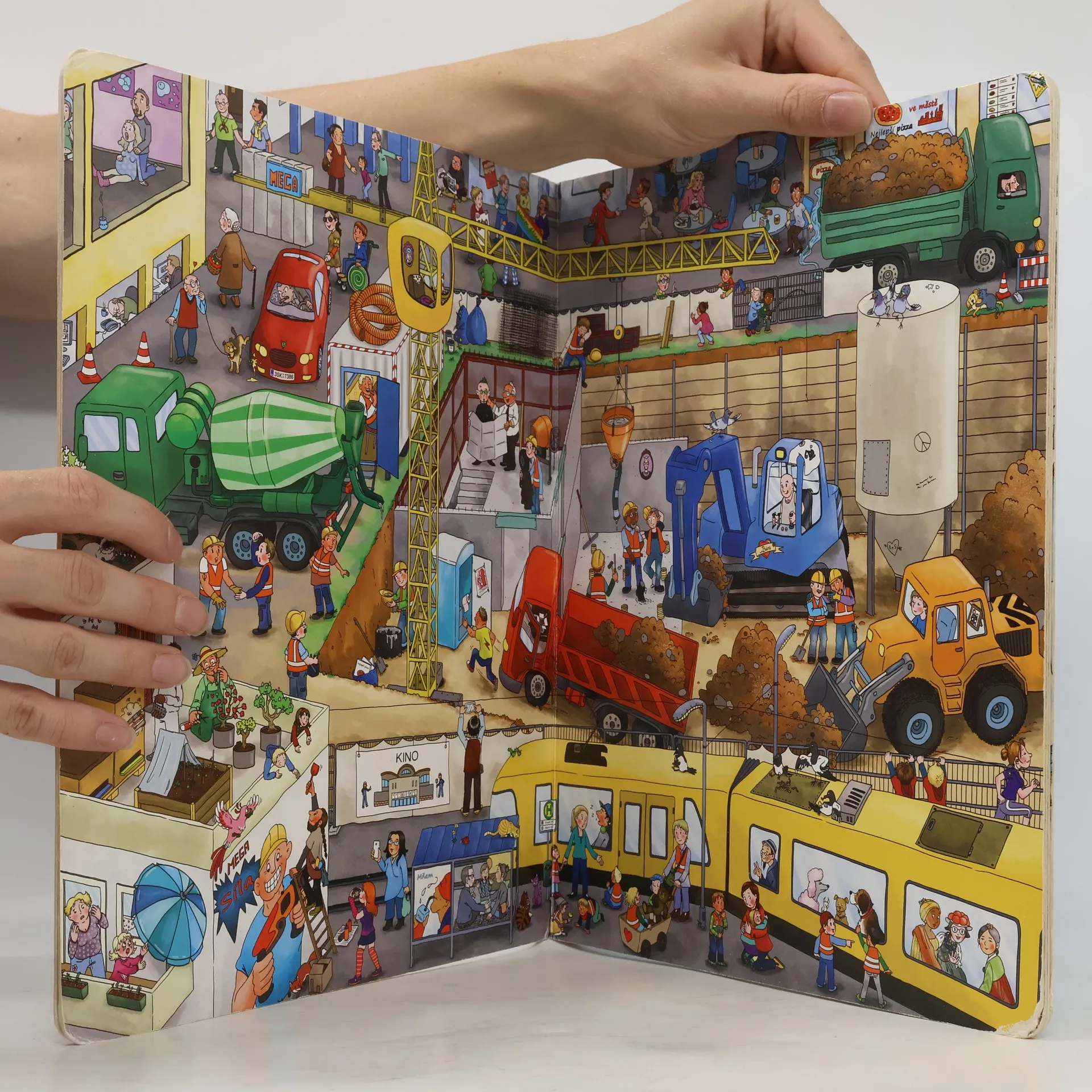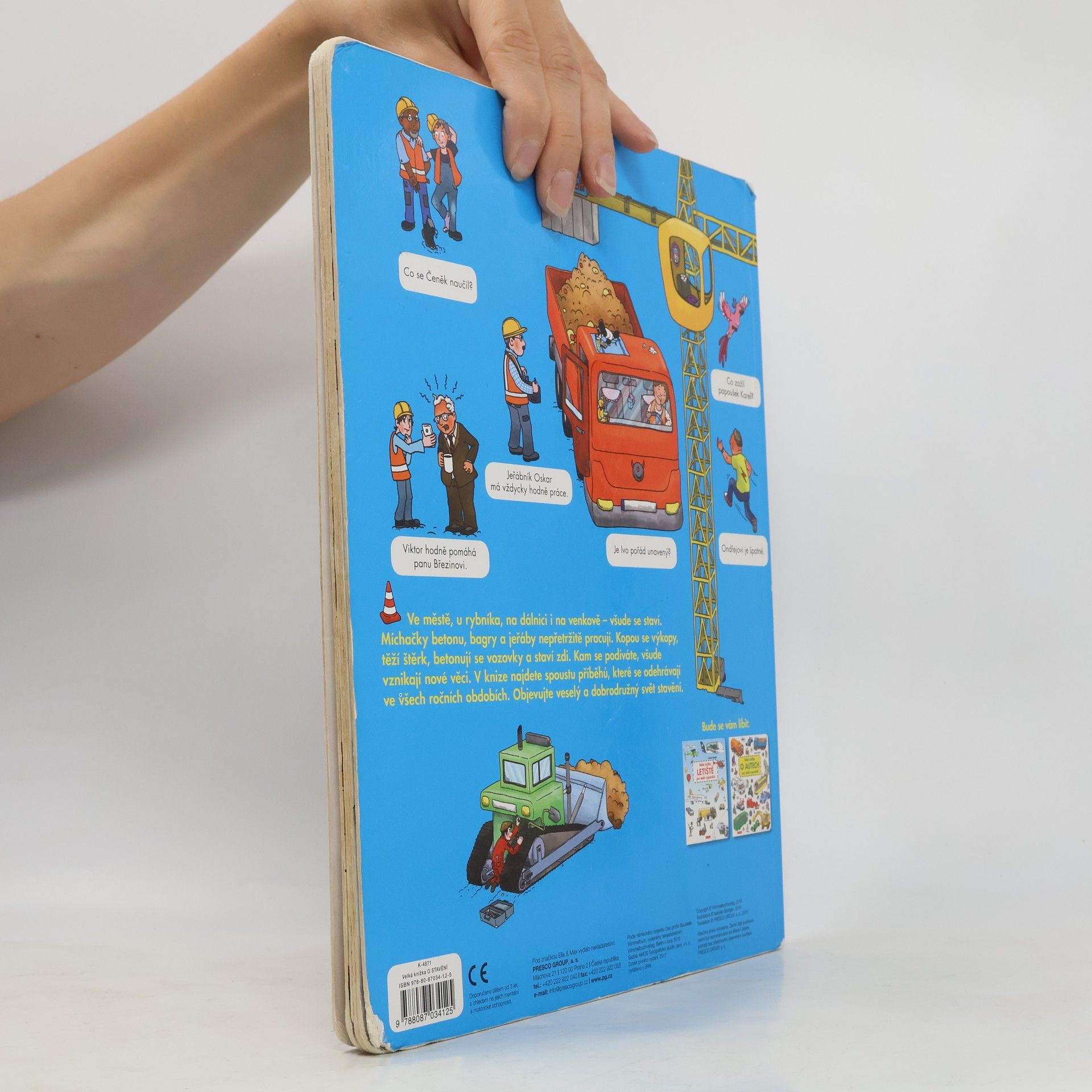 Ve městě, na venkově, na dálnici, u rybníka – všude je rušno, všude se staví. Míchačky, bagry a jeřáby nepřetržitě pracují… Ať je jaro, nebo zima, lidi nejrůznějších povolání zaměstnává práce na stavbě a další každodenní činnosti – a malí čtenáři se s touto knihou mohou stát aktivními tvůrci jejich příběhů! Tato velkoformátová kniha přináší panoramatické obrazové vhledy do prostředí silnic, staveb, ale i jiných. Bohatě propracované názorné ilustrace jsou pro děti velkým lákadlem, bezednou studnicí inspirace a zároveň obrovskou výzvou – množství detailů je přitahuje, podněcuje jejich představivost a fantazii. Malý vypravěč v interakci s dospělým nejen popisuje, co vidí na obrázcích, ale také v nich hledá, a hlavně kreativně a hravě rozplétá a opět spojuje nekonečné nitky možných příběhů. Knihy tak velmi účinně napomáhají budování slovní zásoby, komunikačních schopností i logického myšlení. Dítě tříbí svůj postřeh, zrakovou a sluchovou paměť, a činí tak první krůčky na své cestě k rozvoji aktivního čtenářství.