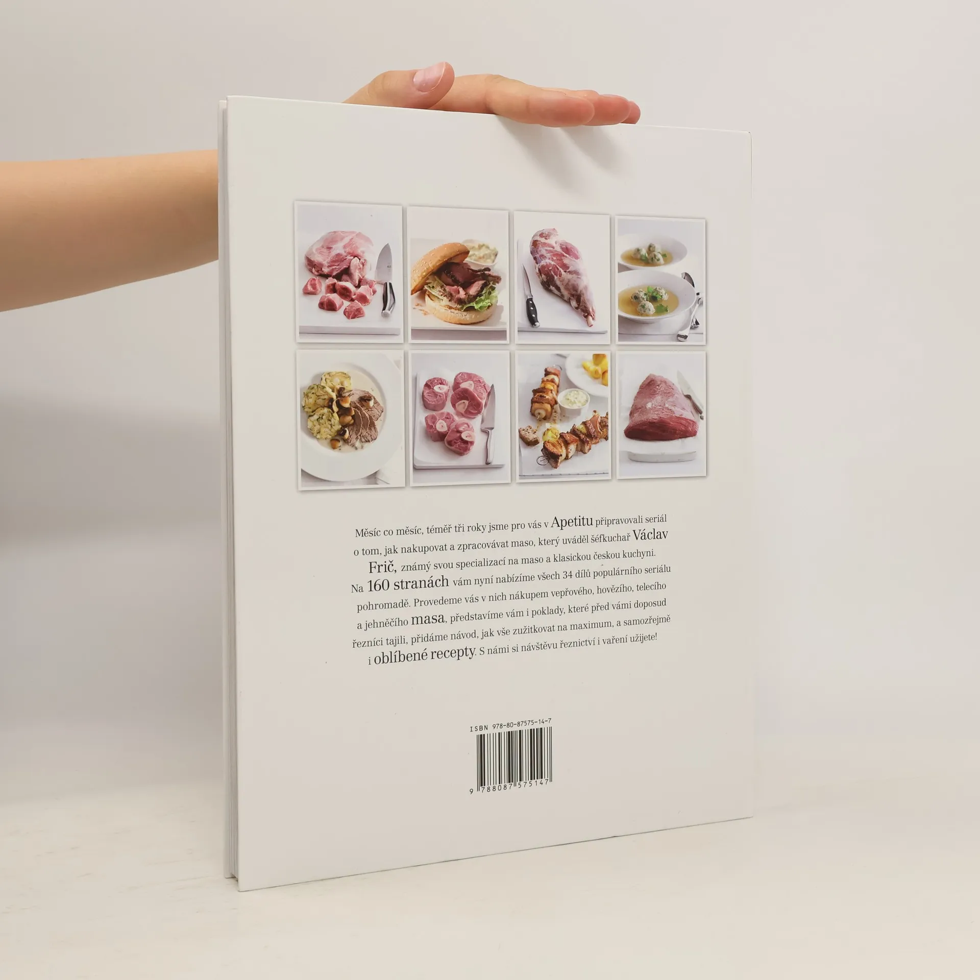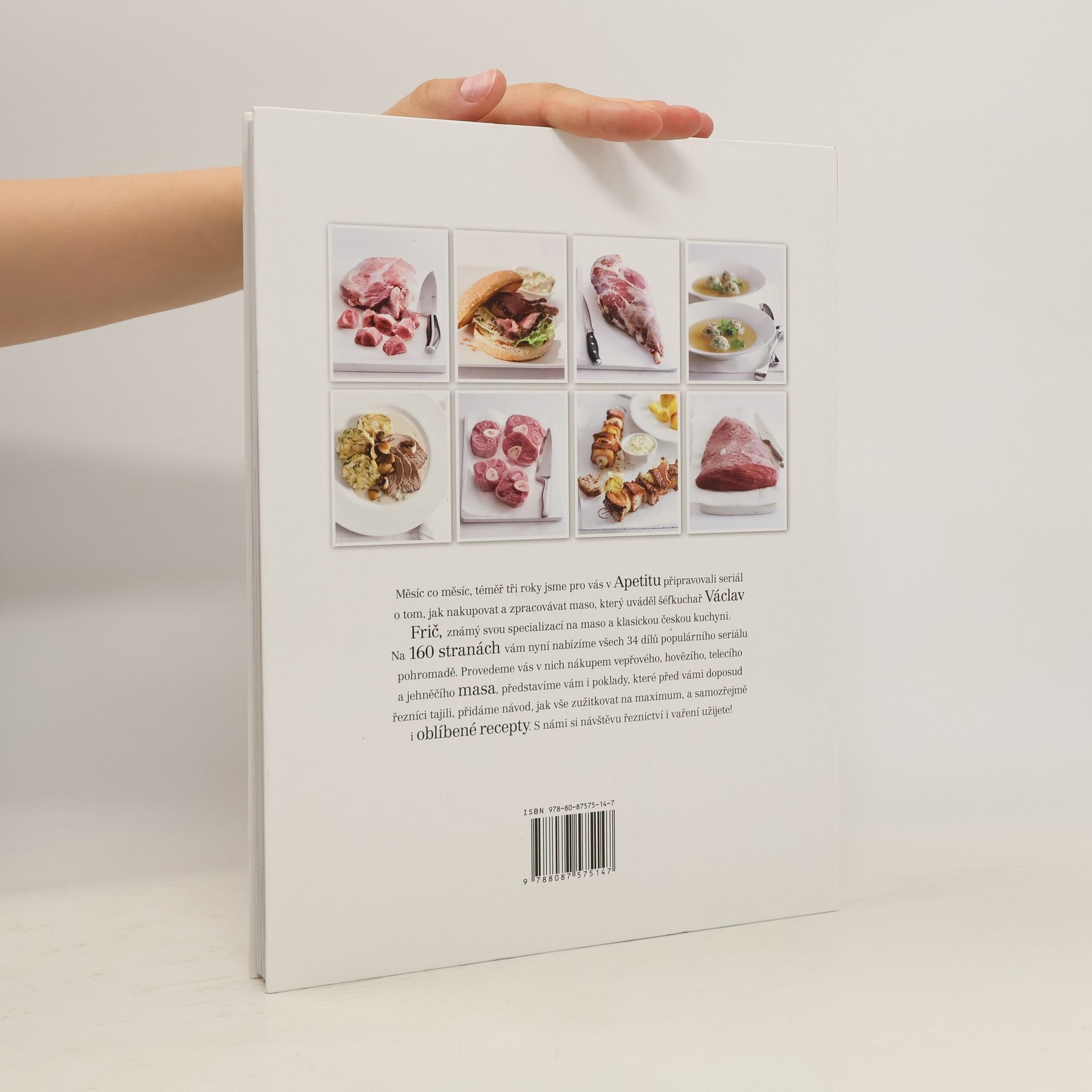 Všechno, co musíte vědět o nakupování a přípravě masa. Ověřené recepty a tipy šéfkuchaře Václava Friče. Všechny díly oblíbeného seriálu o mase, který vycházel po 3 roky v časopisu Apetit, vychází konečně pohromadě! Na 160 stránkách najdete všechno, co potřebujete vědět o nakupování a zpracování masa. Kniha je rozdělena do čtyř kapitol - hovězí maso, vepřové maso, telecí a jehněčí maso. V každém dílu se dozvíte, proč daný kus masa (květová špička, vepřové ocásky atd.) chtít, jak a kde ho koupit, na co si dát při nákupu pozor, k čemu se daný kus hodí a přidáme i podrobný návod, jak jej v kuchyni zpracovat a upravit (každý díl obsahuje 2 recepty s celostránkovou fotkou). Seriál o mase připravovali Apetit tři roky ve spolupráci s Václavem Fričem, kuchařem, majitelem vyhlášené restaurace Na Pekárně a machrem na českou kuchyni. Kromě receptů na naši klasiku (svíčková, dušená roštěnky, dršťkovka), v knize najdete i recepty světové kuchyně (rostbeef, rib-eye steak, telecí saltimboca…). Kniha je doplněna o adresy ověřených řeznictví a farem, kde se dá sehnat to nejlepší maso. S námi už se nebudete bát vkročit do řeznictví, říct si o správný kus masa - na guláš, steaky, vývar… a doma ho připravit. S Apetitem zvládnete uvařit všechno napoprvé!