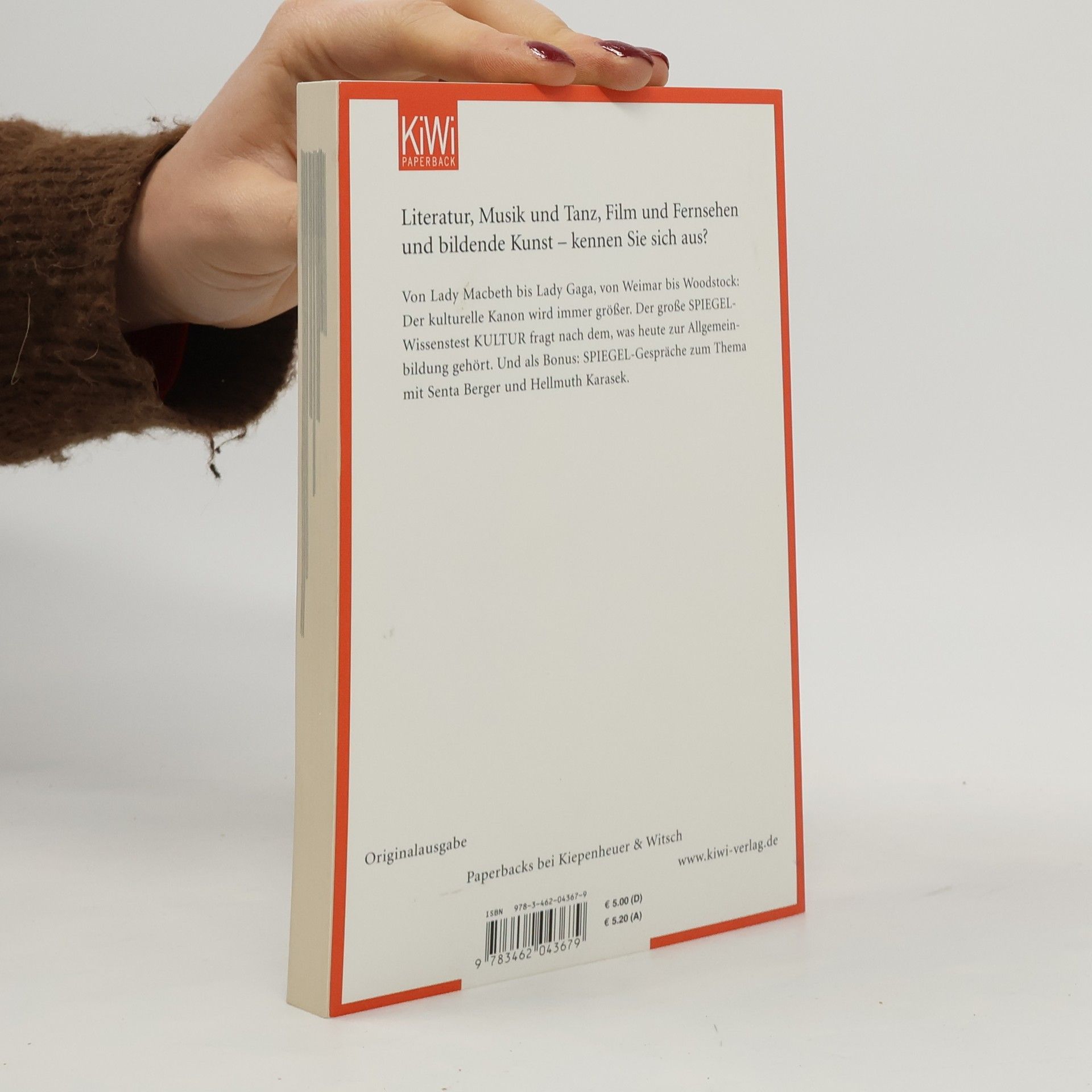 Von Madame Bovary bis Lady Gaga Aus welchem Roman stammt die Zeile »Big Brother is watching you«? Welche Kirche malte Claude Monet mindestens 30 Mal? Welchen Shakespeare-Stoff greift Leonard Bernsteins Musical »West Side Story« auf? Der kulturelle Kanon ist heute weiter gefasst denn je: In Literatur, Kunst, Musik, Theater, Film und Fernsehen scheint die Zahl der Werke, die man kennen sollte, immer schnel-ler zu wachsen. Der SPIEGEL-Wissenstest KULTUR fragt nach dem, was wirklich wichtig ist – in Deutschland und der Welt. Die Autoren analysieren das kulturelle Wissen der Deutschen. Und sie führen ausführliche Interviews zum Thema: mit der Schauspielerin Senta Berger und dem Bestsellerautor Hellmuth Karasek.