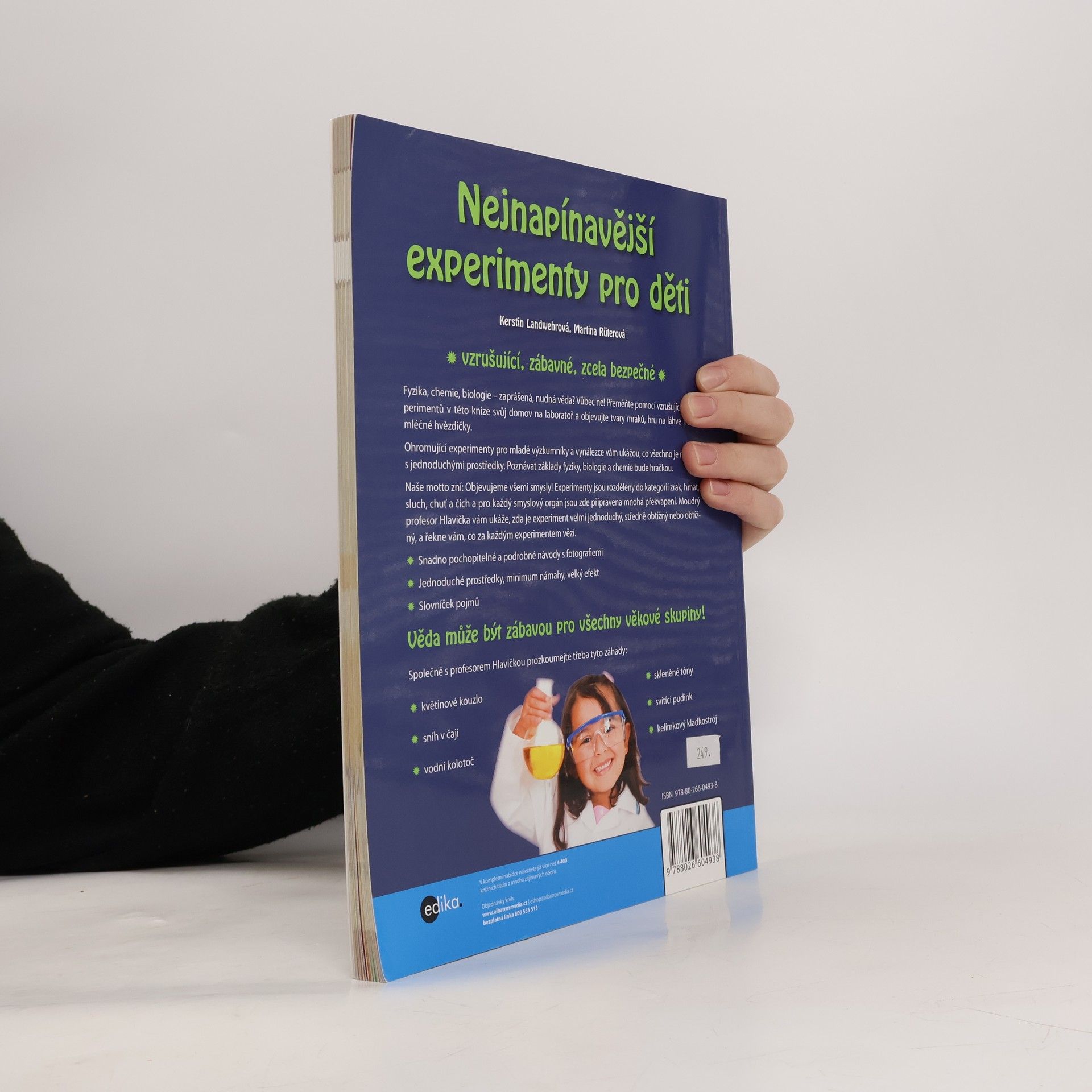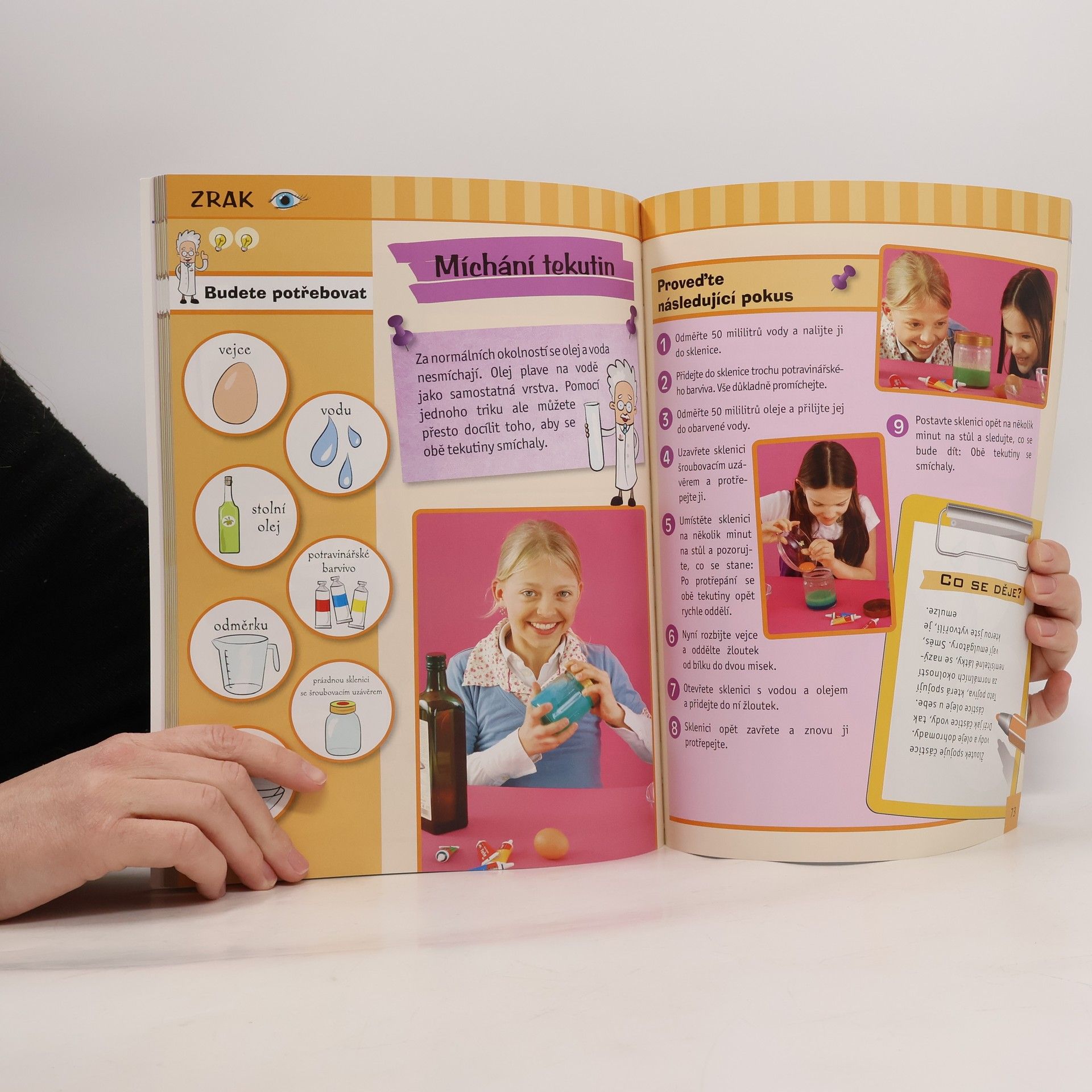 Více než 60 experimentů představí zvídavým badatelům fascinující jevy z oblasti biologie, chemie a fyziky. Ke každému experimentu jsou rozepsány podrobné návody s fotografiemi a vysvětlení, co za každým pokusem vězí. Děti se dozví spoustu informací o rostlinách, chemických prvcích, povětrnostních jevech, tlaku vzduchu a vody... K pokusům budou děti potřebovat běžné věci, které mají všichni doma.
