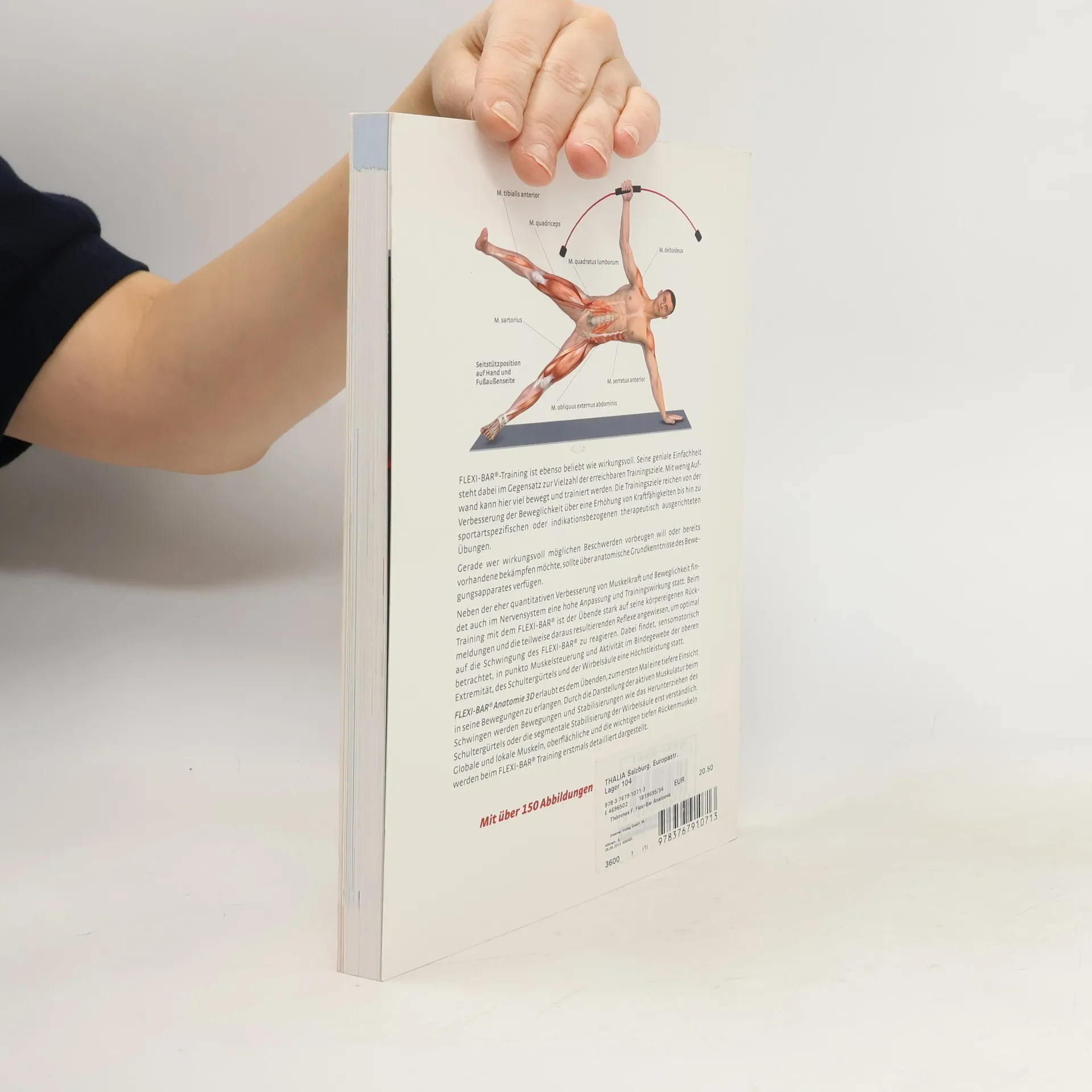 Der FLEXI-BAR, eine etwa 1,50 Meter lange, flexible Stange mit einem Griff in der Mitte, ist ein multifunktionales Trainingsgerät, das alle Körperpartien aktivieren kann. Kleine, rhythmische Bewegungen versetzen den Stab in Schwingungen und übertragen diese auf unterschiedlichste Muskelgruppen, Sehnen und Gelenke, vor allem aber die Tiefenmuskulatur. 'FLEXI-BAR Anatomie 3D' bietet anhand der innovativen Computerillustrationen einen Blick unter die Haut, zeigt wie und wo das FLEXI-BARTraining wirkt und liefert wertvolle anatomische Informationen über die beim Üben beteiligten Muskeln.