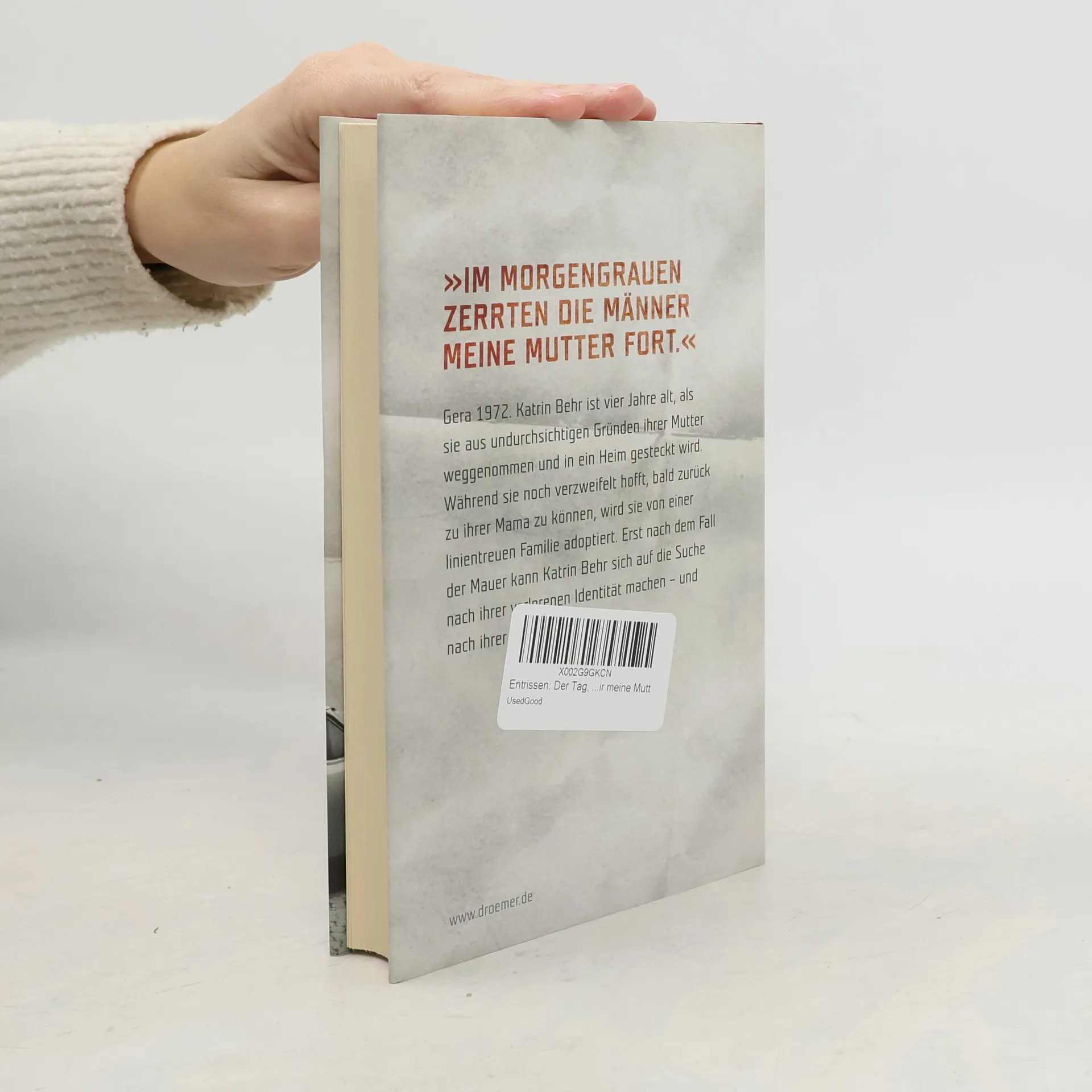 »Im Morgengrauen zerrten die Männer meine Mutter fort« Gera 1972. Katrin Behr ist vier Jahre alt, als sie aus undurchsichtigen Gründen ihrer Mutter weggenommen und in ein Heim gesteckt wird. Während sie noch verzweifelt hofft, bald zurück zu ihrer Mama zu können, wird sie von einer linientreuen Familie adoptiert. Erst nach dem Fall der Mauer kann Katrin Behr sich auf die Suche nach ihrer verlorenen Identität machen – und nach ihrer echten Familie.