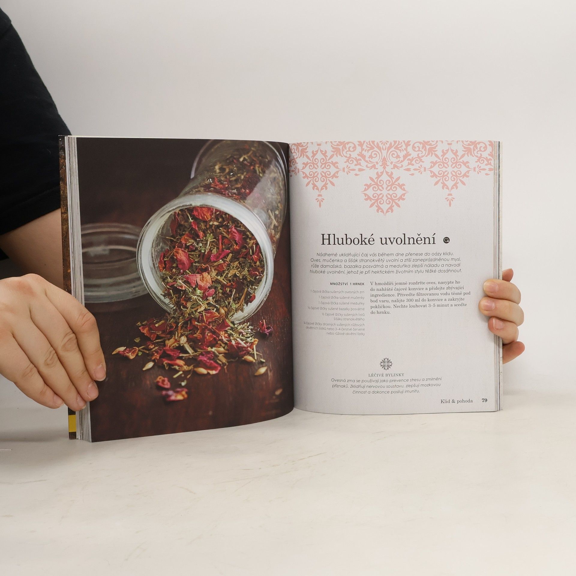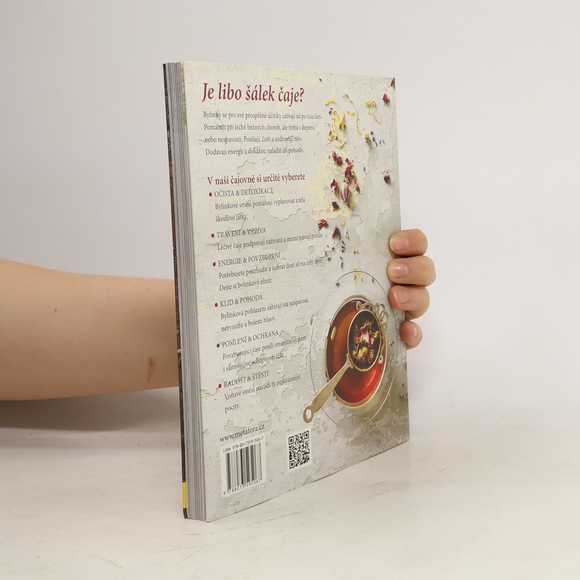 V téhle „čajové krabičce“, sbírce dokonale sestavených receptů najdete bylinkové čaje na všechny možné neduhy těla i ducha. Čekají vás tu čaje proti nachlazení, na dobré spaní a správné trávení, na zahřátí v zimě i ochlazení v létě, elixír pro odvahu či energii, stejně jako odvar pro uklidnění a relaxaci. A to samozřejmě zdaleka není všechno. Potřebujete posílit imunitu? Žádný problém. Máme pro vás čaj plný antioxidantů a dalších prospěšných látek, který pomůže zvýšit odolnost proti nemocem. A co takhle čaj pro štěstí? Taky máme. Posaďte se s voňavým šálkem do pohodlného křesla a uvidíte, jak vám vyloudí úsměv na tváři. Chcete ráno plni energie vyskočit z postele? Tak to si nalistujte a uvařte čaj na dobré ráno. Všechno vám půjde pěkně od ruky. Nakonec kniha nabídne ještě přehledný Herbář se všemi bylinkami, které jsou ve všech receptech použité. Dozvíte se o jejich vlastnostech a účincích, takže vždycky budete vědět, na jaké problémy se která hodí a naučíte se míchat své vlastní směsi přímo na míru.