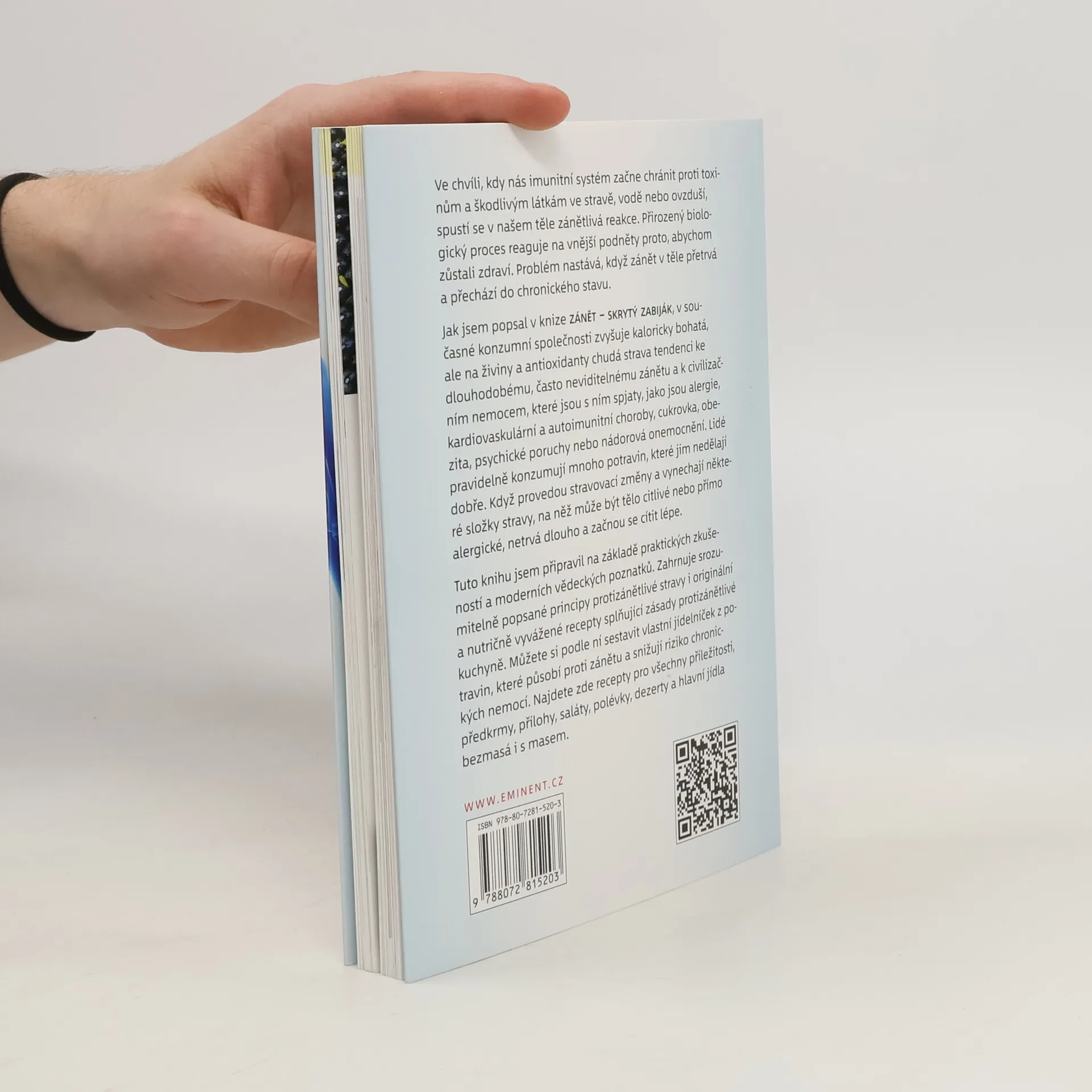 Ve chvíli, kdy nás imunitní systém začne chránit proti toxinům a škodlivým látkám ve stravě, vodě nebo ovzduší, spustí se v našem těle zánět. Jako přirozený biologický proces reaguje na vnější podněty proto, abychom zůstali zdraví. Problém nastává tehdy, když v těle přetrvává a přechází do chronického stavu. Jak autor popsal ve své knize Zánět - skrytý zabiják, zvyšuje kaloricky bohatá, na živiny a antioxidanty chudá strava v současné konzumní společnosti tendenci k dlouhodobému a často neviditelnému zánětu a s ním spojených civilizačních nemocí, jako jsou alergie, autoimunitní nemoci, cukrovka, obezita, srdečněcévní nemoci, psychické poruchy nebo nádorová onemocnění. Lidé pravidelně konzumují mnoho potravin, které jim nedělají dobře. Po provedení stravovacích změn a vynechání některých druhů, na které může tělo být citlivé nebo přímo alergické, zpravidla netrvá dlouho a začnou se cítit lépe. Tuto knihu jsem autor připravoval na základě praktických zkušeností a moderních vědeckých poznatků. Zahrnuje srozumitelně popsané principy protizánětlivé stravy i originální a nutričně vyvážené recepty splňující zásady protizánětlivé stravy. Je návodem, který vám pomůže sestavit si vlastní jídelníček z potravin, které působí protizánětlivě a snižují riziko chronických nemocí. Najdete zde recepty pro všechny příležitosti, předkrmy, přílohy, saláty, polévky, hlavní jídla bezmasá i s masem a dezerty.