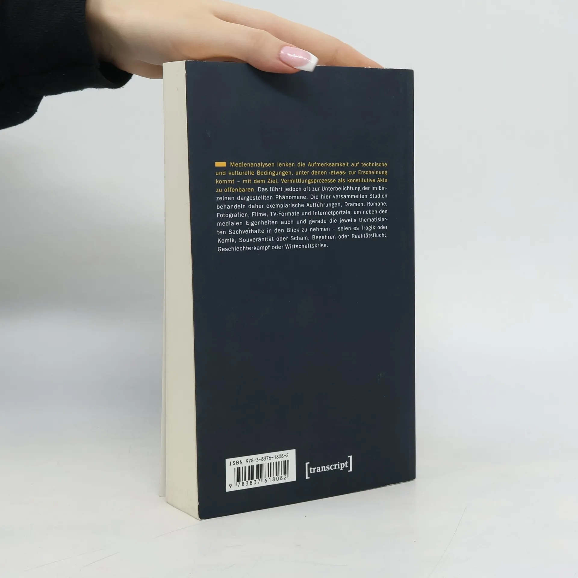 Medienanalysen lenken die Aufmerksamkeit auf technische und kulturelle Bedingungen, unter denen ›etwas‹ zur Erscheinung kommt - mit dem Ziel, Vermittlungsprozesse als konstitutive Akte zu offenbaren. Das führt jedoch oft zur Unterbelichtung der im Einzelnen dargestellten Phänomene. Die hier versammelten Studien behandeln daher exemplarische Aufführungen, Dramen, Romane, Fotografien, Filme, TV-Formate und Internetportale, um neben den medialen Eigenheiten auch und gerade die jeweils thematisierten Sachverhalte in den Blick zu nehmen - seien es Tragik oder Komik, Souveränität oder Scham, Begehren oder Realitätsflucht, Geschlechterkampf oder Wirtschaftskrise.