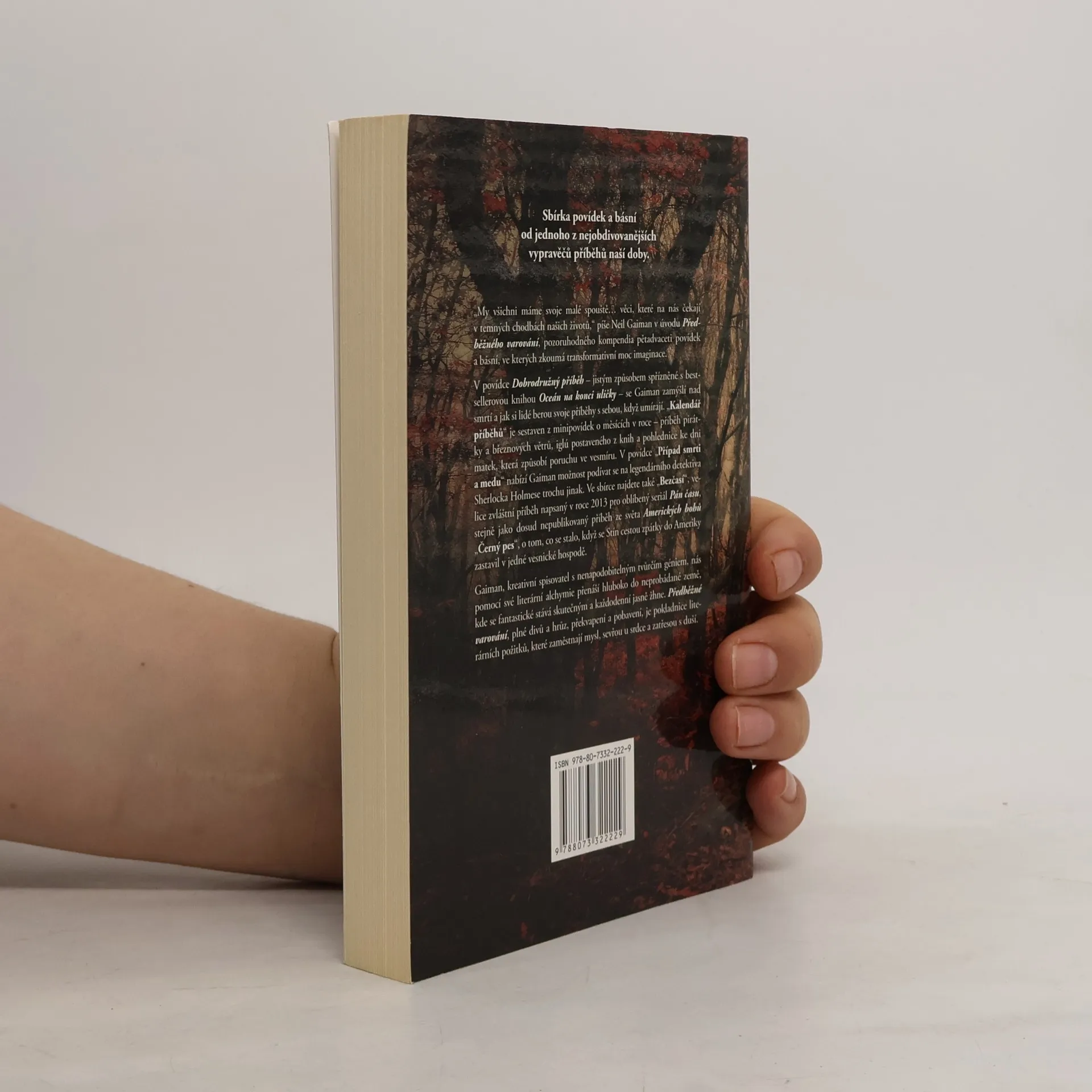 „My všichni máme svoje malé spouště… věci, které na nás čekají v temných chodbách našich životů,“ píše Neil Gaiman v úvodu Předběžného varování, pozoruhodného kompendia pětadvaceti povídek a básní, ve kterých zkoumá transformativní moc imaginace. V povídce "Dobrodružný příběh" – jistým způsobem spřízněné s knihou Oceán na konci uličky – se Gaiman zamýšlí nad smrtí a jak si lidé berou svoje příběhy s sebou, když umírají. „Kalendář příběhů“ je sestaven z minipovídek o měsících v roce – příběh pirátky a březnových větrů, iglú postaveného z knih a pohlednice ke Dni matek, která způsobí poruchu ve vesmíru. V povídce „Případ smrti a medu“ nabízí Gaiman možnost podívat se na legendárního detektiva Sherlocka Holmese trochu jinak. Ve sbírce najdete také „Bezčasí“, velice zvláštní příběh napsáný v roce 2013 pro oblíbený seriál Pán času, stejně jako dosud nepublikovaný příběh ze světa Amerických bohů „Černý pes“ o tom, co se stalo, když se Stín cestou zpátky do Ameriky zastavil v jedné vesnické hospodě. Gaiman, kreativní spisovatel s nenapodobitelným tvůrčím géniem, nás pomocí své literární alchymie přenáší hluboko do neprobádané země, kde se fantastické stává skutečným a každodenní jasně žhne. Předběžné varování, plné divů a hrůz, překvapení a pobavení, je pokladnice literárních požitků, které zaměstnají mysl, sevřou u srdce a zatřesou s duší.