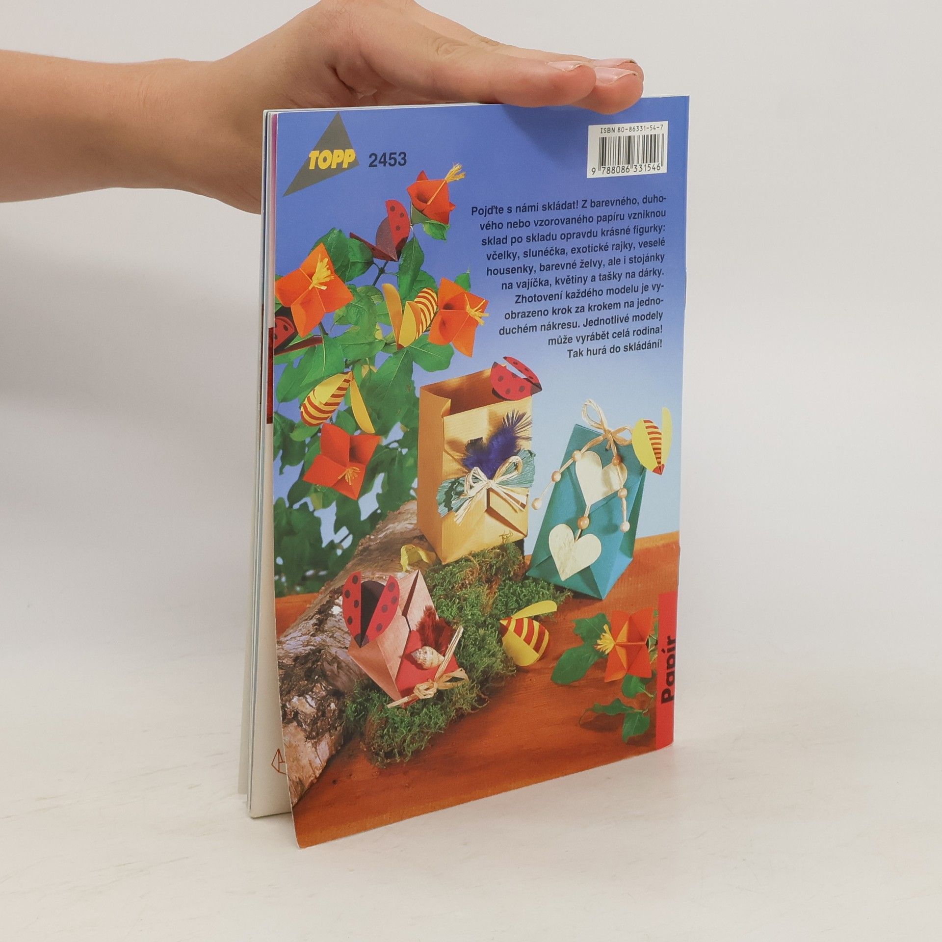 Z barevného, duhového nebo vzorovaného papíru vznikají podle této knížky sklad po skladu krásné figurky: včelky, slunéčka, exotické rajky, veselé housenky, barevné želvy, také ale stojánky na vajíčka, květiny a tašky na dárky. Zhotovení každého modelu je vyobrazeno krok za krokem na jednoduchém nákresu. Modely může vyrábět celá rodina. Pro všechny věkové kategorie.