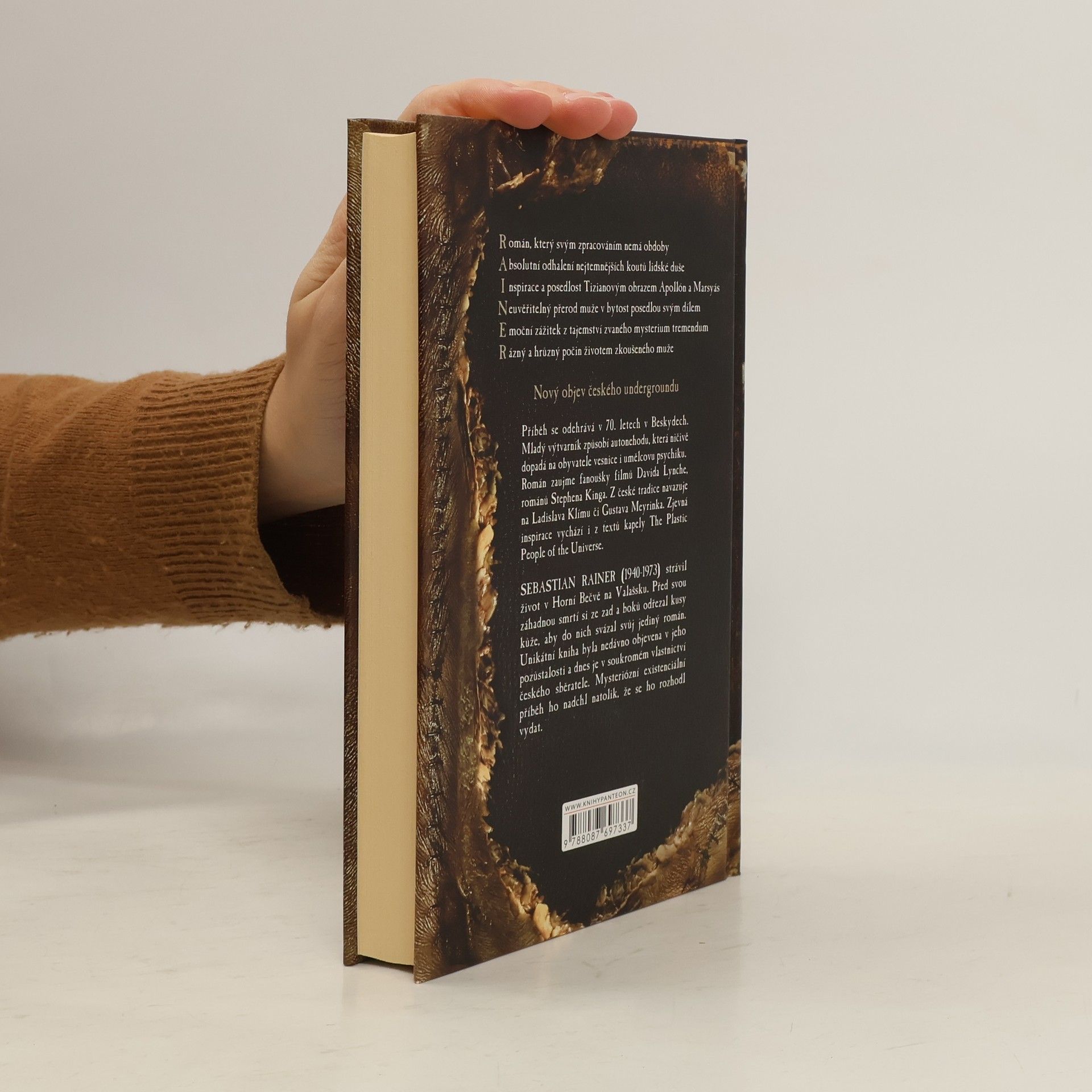 Román, který svým zpracováním nemá obdoby Absolutní odhalení nejtemnějších koutů lidské duše Inspirace a posedlost Tizianovým obrazem Apollón a Marsyás Neuvěřitelný přerod muže v bytost posedlou svým dílem Emoční zážitek z tajemství zvaného mysterium tremendum Rázný a hrůzný počin životem zkoušeného muže Příběh se odehrává v 70. letech v Beskydech. Mladý výtvarník způsobí autonehodu, která ničivě dopadá na obyvatele vesnice i umělcovu psychiku. Román zaujme fanoušky filmů Davida Lynche a románů Stephena Kinga.