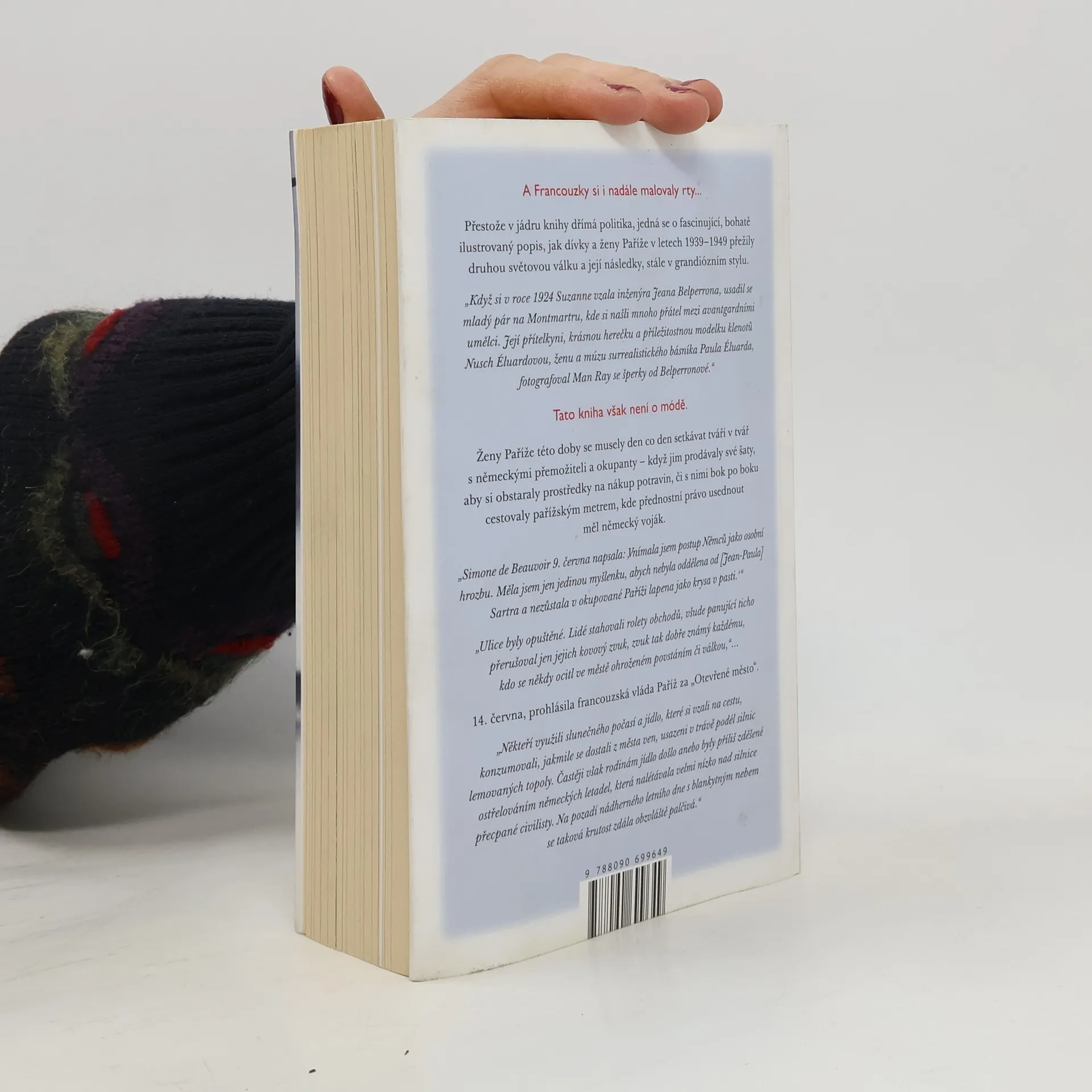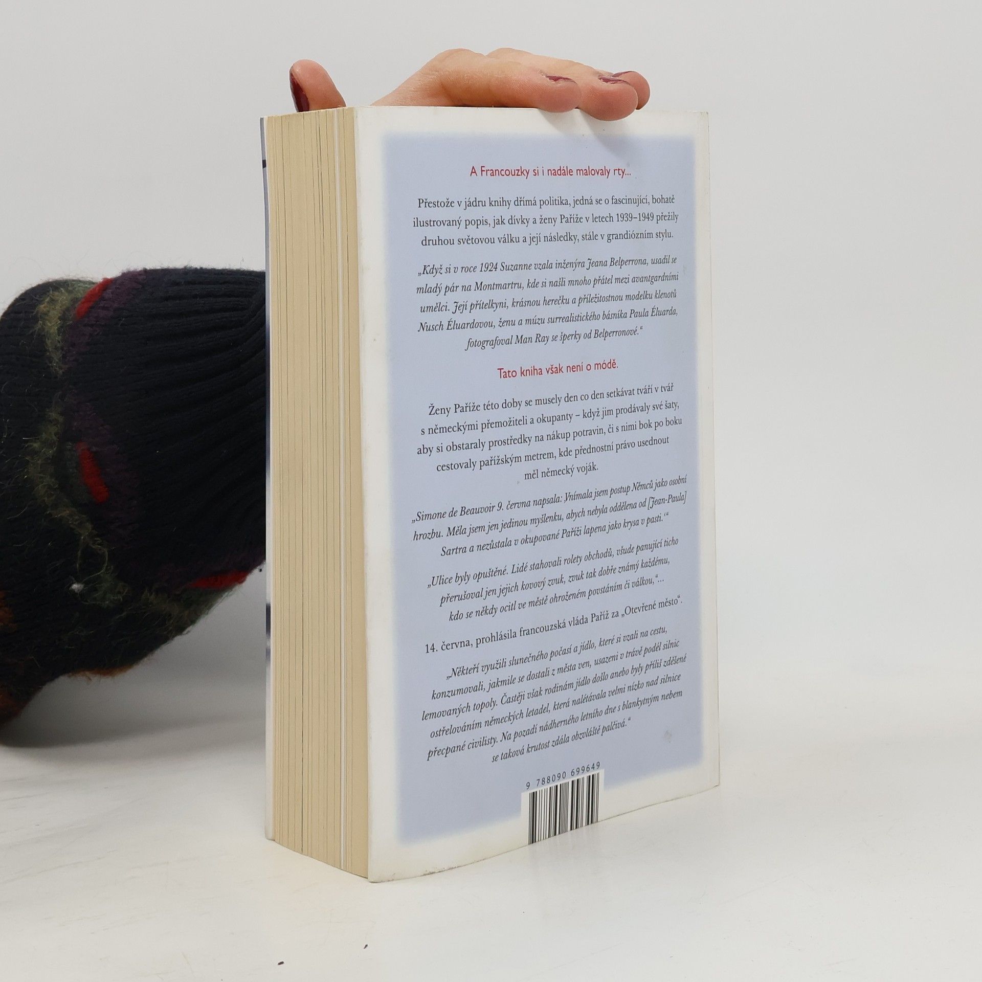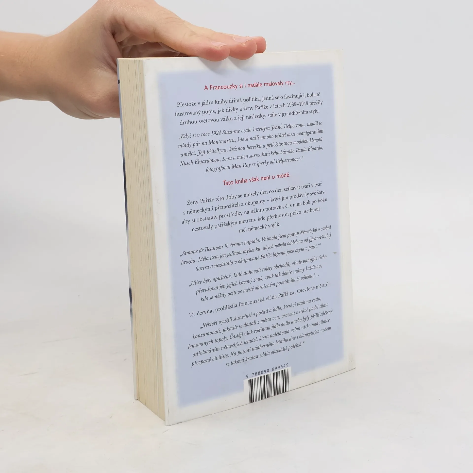Přestože v jádru knihy dřímá politika, je to fascinující, bohatě ilustrovaný popis, jak dívky a ženy Paříže v letech 1939–1949 přežily druhou světovou válku a její následky. Suzanne, která se v roce 1924 provdala za inženýra Jeana Belperrona, se usadila na Montmartre a navázala přátelství s avantgardními umělci, včetně krásné herečky Nusch Eluardové, múzy surrealistického básníka Paula Eluarda, kterou fotografoval Man Ray. Ženy Paříže se denně setkávaly s německými okupanty, prodávaly šaty, aby získaly peníze na jídlo, a cestovaly s nimi v metru, kde měli vojáci přednost. Simone de Beauvoir v jednom ze svých zápisů vyjádřila osobní hrozbu, kterou okupace představovala, a touhu nezůstat oddělena od Jean-Paula Sartra. Autorka Anna Sebba představuje širokou paletu ženských postav, od kolaborantek po účastnice odboje, učitelky, spisovatelky, herečky a prostitutky, a ukazuje, jak se rozhodnutí o životě a smrti stala jejich každodenností. Kniha nesnaží se vysvětlit, proč ženy volily určité cesty, ale sdílí příběhy jejich činů a životní osudy, doplněné pozoruhodným výběrem fotografií, které promlouvají samy za sebe.