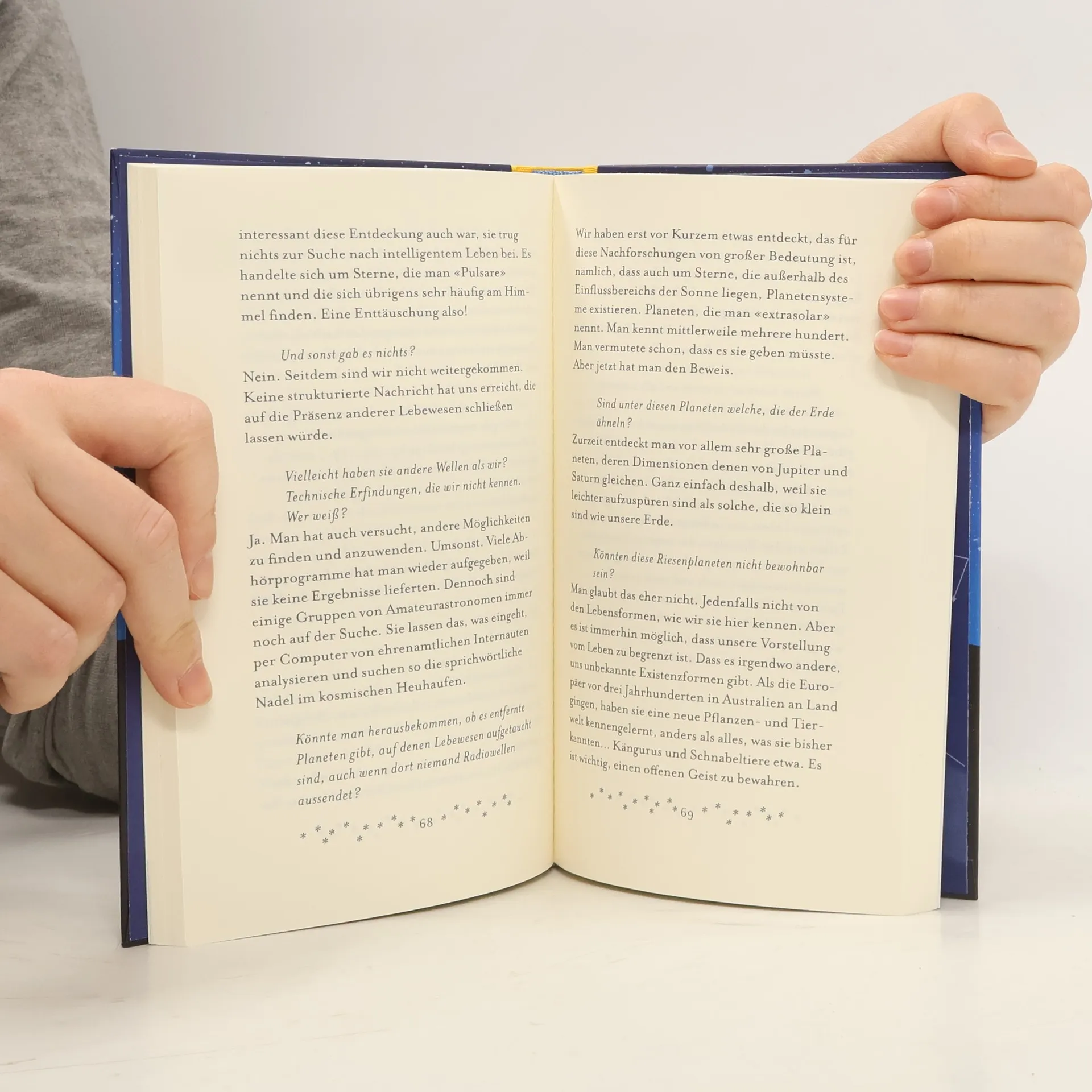 „Ich kann mir nicht vorstellen, dass die Sterne, die so weit entfernt am Himmel stehen, etwas mit meiner Existenz zu tun haben. Das ist wie ein Wunder! Wie kannst du das wissen?“ – „Wir werden darauf zu sprechen kommen. Aber vorher werde ich dir viele Dinge erklären.“ Hubert Reeves, der zu den renommiertesten Astrophysikern der Welt gehört, erklärt in diesem Buch seiner vierzehnjährigen Enkelin das Universum. Sie stellt ihm all jene Fragen, auf die auch wir Erwachsenen nicht immer gleich eine Antwort parat haben – zum Beispiel: Wo ist das Weltall zu Ende? Was war da vor dem Urknall? Gibt es noch andere bewohnbare Planeten? Glaubst du an Außerirdische? Und er beantwortet sie mit jener gelassenen und auf jeden Einwand eingehenden Liebenswürdigkeit, die Großvätern eigen ist. Ein zauberhaftes Buch und eine wunderbare, für jedermann verständliche Einführung in die Grundlagen des Universums.