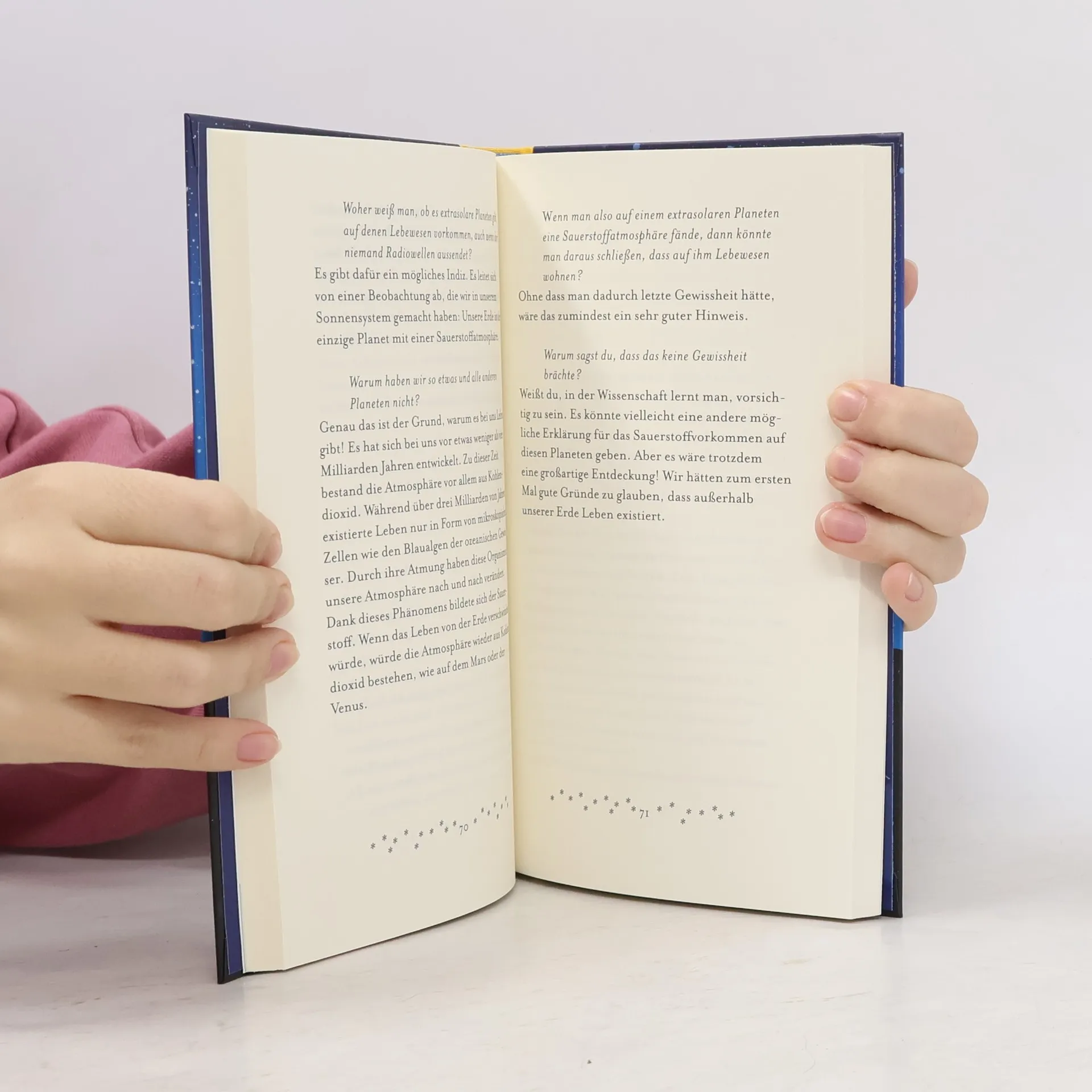 „Ich kann mir nicht vorstellen, dass die Sterne, die so weit entfernt am Himmel stehen, etwas mit meiner Existenz zu tun haben. Das ist wie ein Wunder! Wie kannst du das wissen?“ – „Wir werden darauf zu sprechen kommen. Aber vorher werde ich dir viele Dinge erklären.“ Hubert Reeves, der zu den renommiertesten Astrophysikern der Welt gehört, erklärt in diesem Buch seiner vierzehnjährigen Enkelin das Universum. Sie stellt ihm all jene Fragen, auf die auch wir Erwachsenen nicht immer gleich eine Antwort parat haben – zum Beispiel: Wo ist das Weltall zu Ende? Was war da vor dem Urknall? Gibt es noch andere bewohnbare Planeten? Glaubst du an Außerirdische? Und er beantwortet sie mit jener gelassenen und auf jeden Einwand eingehenden Liebenswürdigkeit, die Großvätern eigen ist. Ein zauberhaftes Buch und eine wunderbare, für jedermann verständliche Einführung in die Grundlagen des Universums.