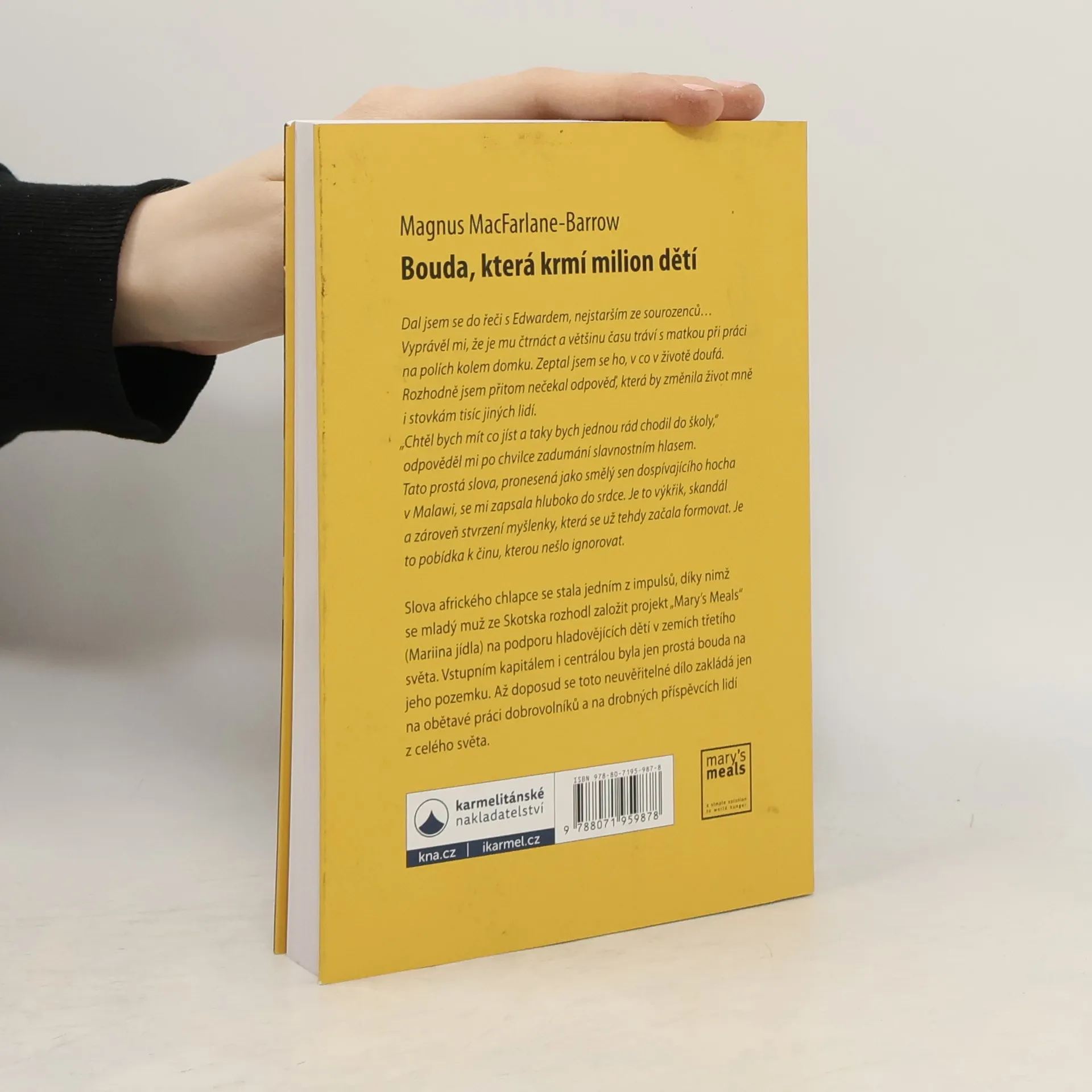 Dal jsem se do řeči s Edwardem, nejstarším ze sourozenců. Jeho černé tričko bylo o několik čísel větší, než by potřeboval, ale na rozdíl od umazaných a potrhaných hadrů, do kterých byli zahaleni jeho sourozenci, bylo čisté. Vyprávěl mi, že je mu čtrnáct a většinu času tráví s matkou při práci na polích kolem domku. Zeptal jsem se ho, v co v životě doufá. Rozhodně jsem přitom nečekal odpověď, která by změnila život mně i stovkám tisíc jiných lidí. „Chtěl bych mít co jíst a taky bych jednou rád chodil do školy,“ odpověděl mi po chvilce zadumání slavnostním hlasem. Tato prostá slova, pronesená jako smělý sen dospívajícího hocha v Malawi, se mi zapsala hluboko do srdce. Je to výkřik, skandál a zároveň stvrzení myšlenky, která se už tehdy začala formovat, je to pobídka k činu, kterou nešlo ignorovat. Slova čtrnáctiletého afrického chlapce se stala jedním z impulsů, po nichž se introvertní chovatel ryb ze skotské vysočiny rozhodl založit „Mariino jídlo“: organizaci, která stojí na drobných příspěvcích deseti tisíců lidí a dobrovolnické službě, díky nimž krmí každý den přes milion dětí ve více než tisícovce škol čtrnácti zemí rozvojového světa. Tento nesmírně poutavý příběh, jak z počátečního nadšení hrstky dobrovolníků vyrostlo dílo mezinárodních rozměrů, vypráví o obětavosti a o vynalézavé pomoci lidí, jimž není lhostejný osud těch, kteří hladoví a prožívají utrpení.