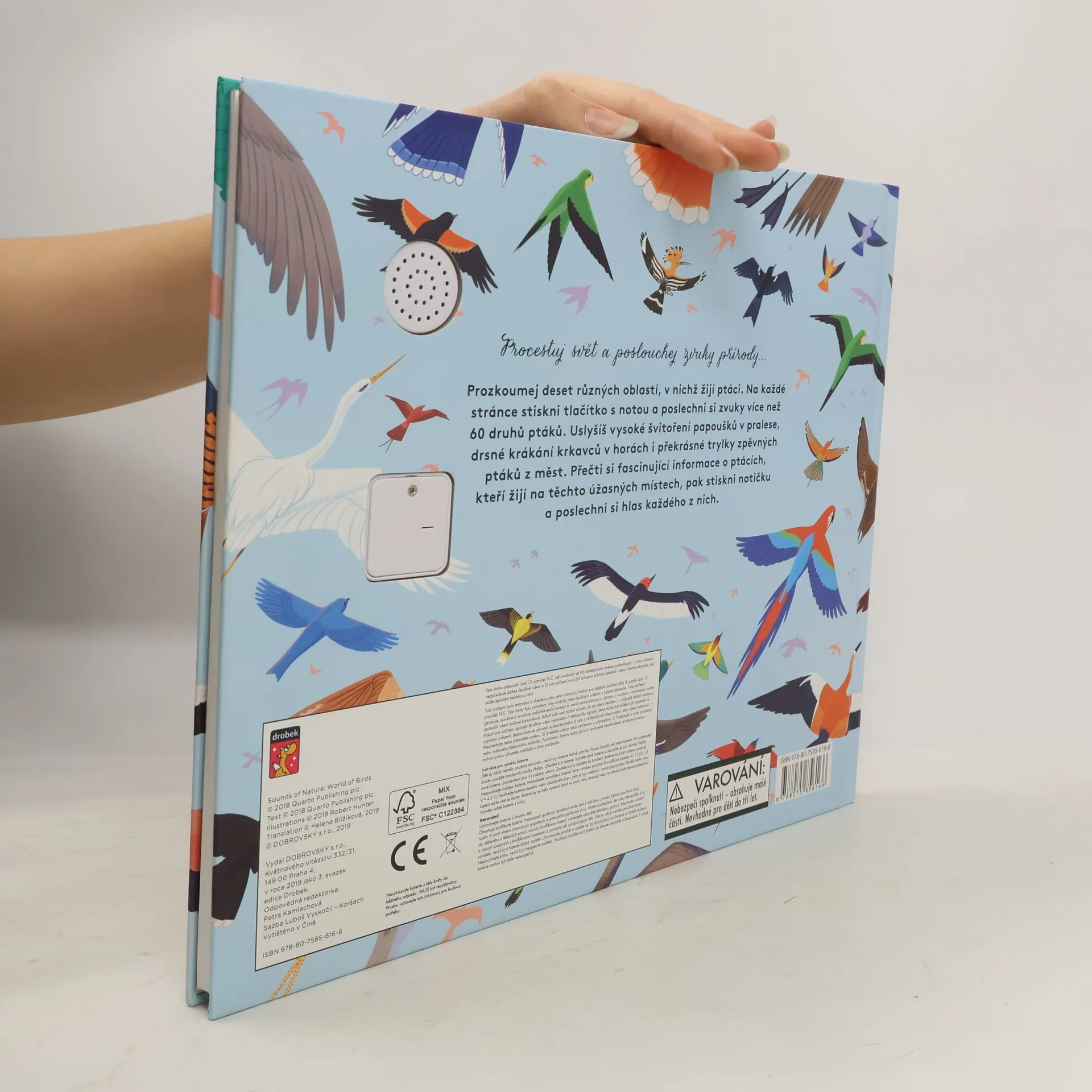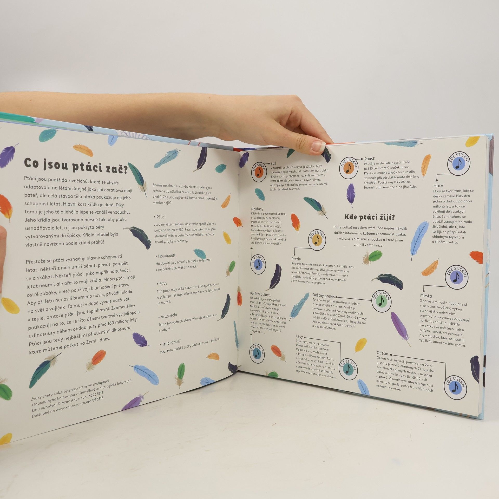 Prozkoumej deset různých oblastí, v nichž žijí ptáci. Na každé stránce stiskni tlačítko s notou a poslechni si zvuky více než 60 druhů ptáků. Uslyšíš vysoké švitoření papoušků v pralese, drsné krákání krkavců v horách i překrásné trylky zpěvných ptáku z měst. Přečti si fascinující informace o ptácích, kteří žijí na těchto úžasných místech, pak stiskni notičku a poslechni si hlas každého z nich.