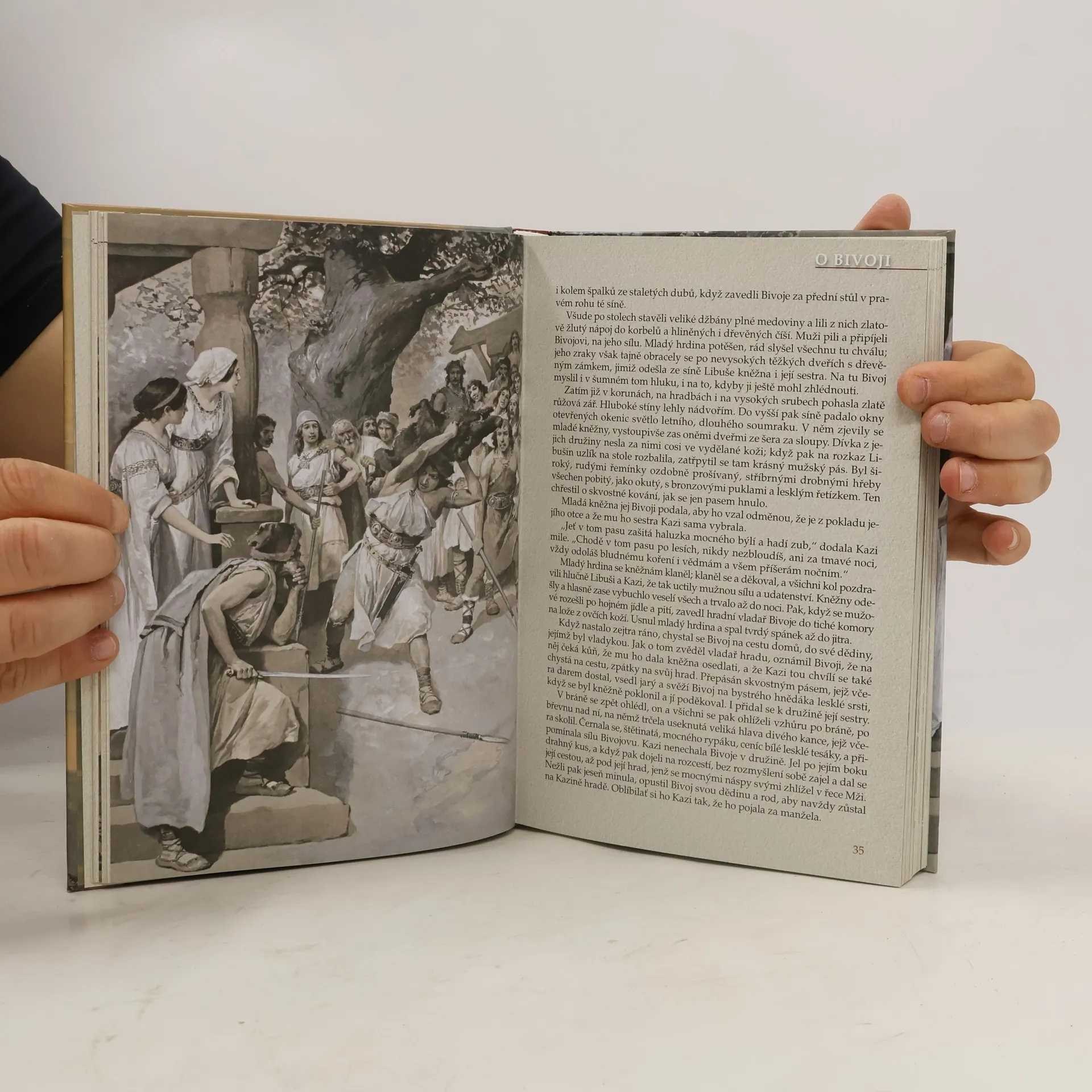 Poslyšte o našem praotci, o předcích, jak přišli do končin naší vlasti a usadili se po Labi a po Vltavě i po jiných řekách této země. Slyšte i, co více dochovalo se z temnoty věků, co zůstalo z báječných vypravování přešlých pokolení, jež klaněla se bohům v šeru starých hájů a jež obětovala studánkám v tichých ouvalech, jezerům i řekám i svatému, živému ohni ... Pojďte a poslyšte pověsti dávných časů...