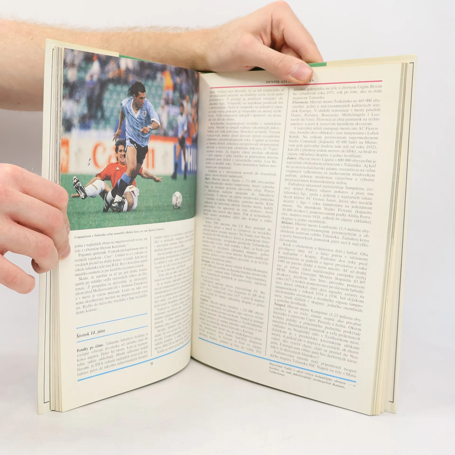 Tá koža naplnená vzduchom dnes rozviruje emócie vo všetkých kútoch našej planéty. Bezmála tridsať miliárd párov očí bolo zvedavých na päťdesiatdva zápasov záverečného turnaja štrnástych majstrovstiev sveta vo futbale v Taliansku. Svetový rekord. Nijaké iné podujatie na zemeguli zatiaľ nepritiahlo väčšiu pozornosť. V čestných lóžach futbalových chrámov sedávali králi, premiéri, ministri i hviezdy kultúrneho neba. Po víťazstvách prezidenti vyhlasovali štátne sviatky. Na počesť futbalových hrdinov pesničkári komponovali oslavné piesne a radní páni premenúvali ulice a štadióny. Počas zápasov na šampionáte v Taliansku, ako hlásila americká agentúra UPI, zavládlo prímerie aj v ťažko skúšanom Libanone. To všetko je futbal. Hádam nikde na svete mu nemohlo byť tak príjemne ako pod azúrovou klenbou talianskej čižmy. Keď v našom vydavateľstve Šport vyšla prvá knižka o majstrovstvách sveta vo futbale, písal sa rok 1958. Odvtedy pravidelne, každé štyri roky, prichádzame za svojimi čitateľmi s knihami o svetových futbalových festivaloch. Táto je už deviata. Tradícia zaväzuje aj inšpiruje. V rukách máte prvú celofarebnú knižku o futbalových majstrovstvách sveta, aká v slovenčine ani v češtine ešte nevyšla. Živým slovom, rečou faktov a najmä 111 farebnými fotografiami vám v nej približujeme spolu s kvalifikáciou všetkých tridsaťjeden talianskych dní, prežiarených slnkom a predovšetkým futbalom.