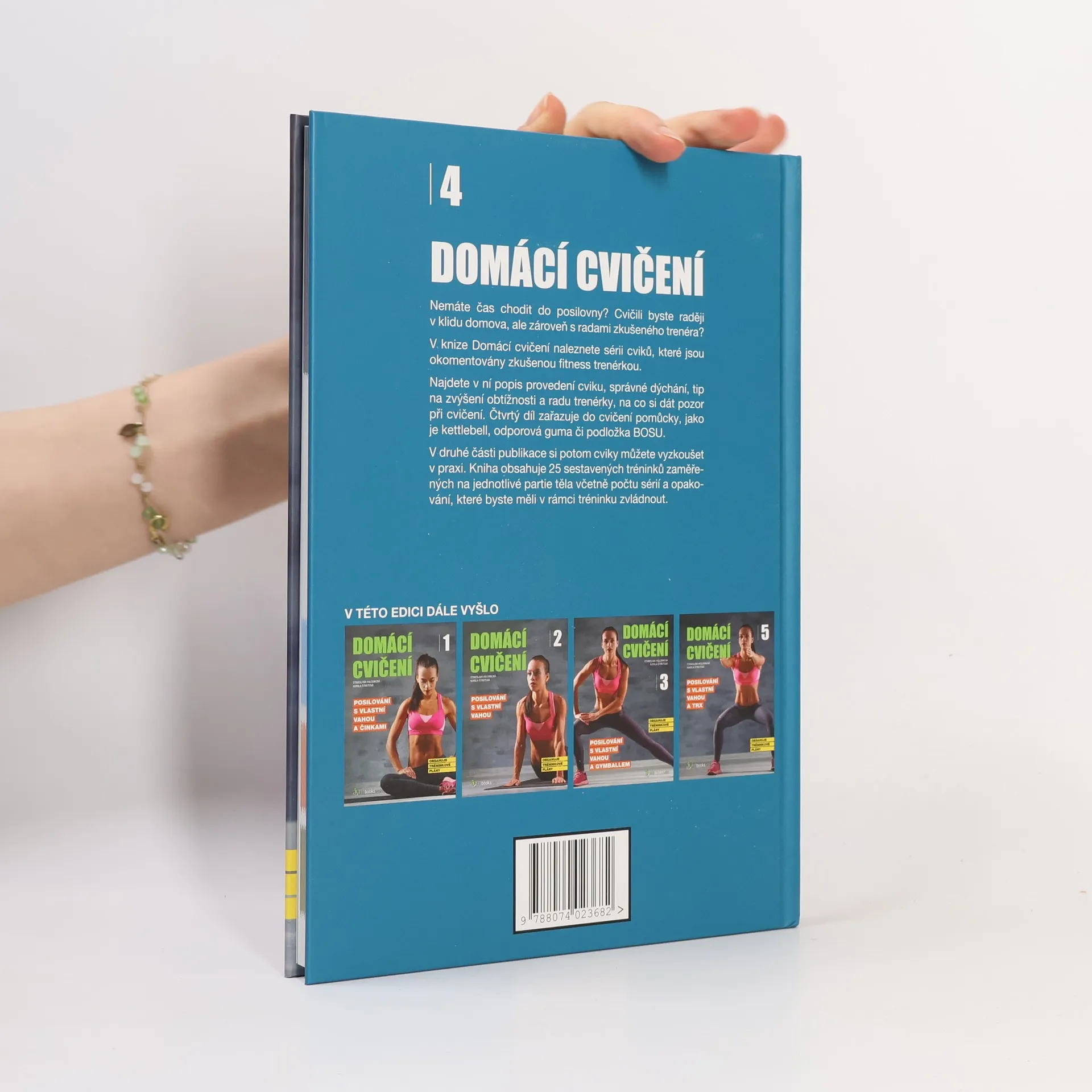 Nemáte čas chodit do posilovny? Cvičili byste raději v klidu domova, ale zároveň s radami zkušeného trenéra? V knize Domácí cvičení naleznete sérii cviků, které jsou okomentovány zkušenou fitness trenérkou. Najdete v ní popis provedení cviku, správné dýchání, tip na zvýšení obtížnosti a radu trenérky, na co si dát pozor při cvičení. Čtvrtý díl zařazuje do cvičení pomůcky, jako je kettlebell, odporová guma či podložka BOSU. V druhé části publikace si potom cviky můžete vyzkoušet v praxi. Kniha obsahuje 25 sestavených tréninků zaměřených na jednotlivé partie těla včetně počtu sérií a opakování, které byste měli v rámci tréninku zvládnout.