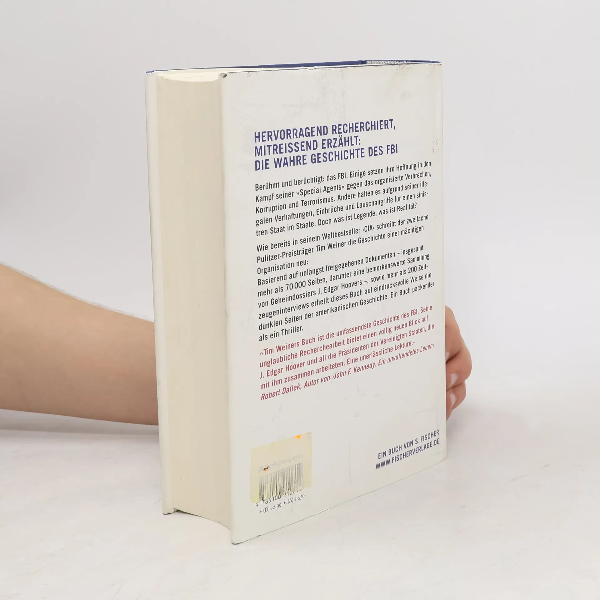Berühmt und berüchtigt: das FBI. Einige setzen ihre Hoffnung in den Kampf seiner „Special Agents“ gegen das organisierte Verbrechen, Korruption und Terrorismus. Andere halten es aufgrund seiner illegalen Verhaftungen, Einbrüche und Lauschangriffe für einen sinistren Staat im Staate. Doch was ist Legende, was ist Realität? Wie bereits in seinem Weltbestseller ›CIA‹ schreibt der zweifache Pulitzer-Preisträger Tim Weiner die Geschichte dieser mächtigen Organisation neu. Sein glänzend recherchiertes und spannend geschriebenes Buch, das u. a. auf bislang unbekannten Quellen basiert, erhellt auf eindrucksvolle Weise dunkle Seiten der amerikanischen Geschichte und stellt die Machenschaften des FBI in einen profunden politischen Kontext. Ein Buch packender als ein Thriller. „Tim Weiners Buch ist die umfassendste Geschichte des FBI. Seine unglaubliche Recherchearbeit bietet einen völlig neuen Blick auf J. Edgar Hoover und all die Präsidenten der Vereinigten Staaten die mit ihm zusammen arbeiteten. Eine unerlässliche Lektüre für jeden, dem Bürgerrechte wichtig sind.“ Robert Dallek, Autor von „John F. Kennedy. Ein unvollendetes Leben“