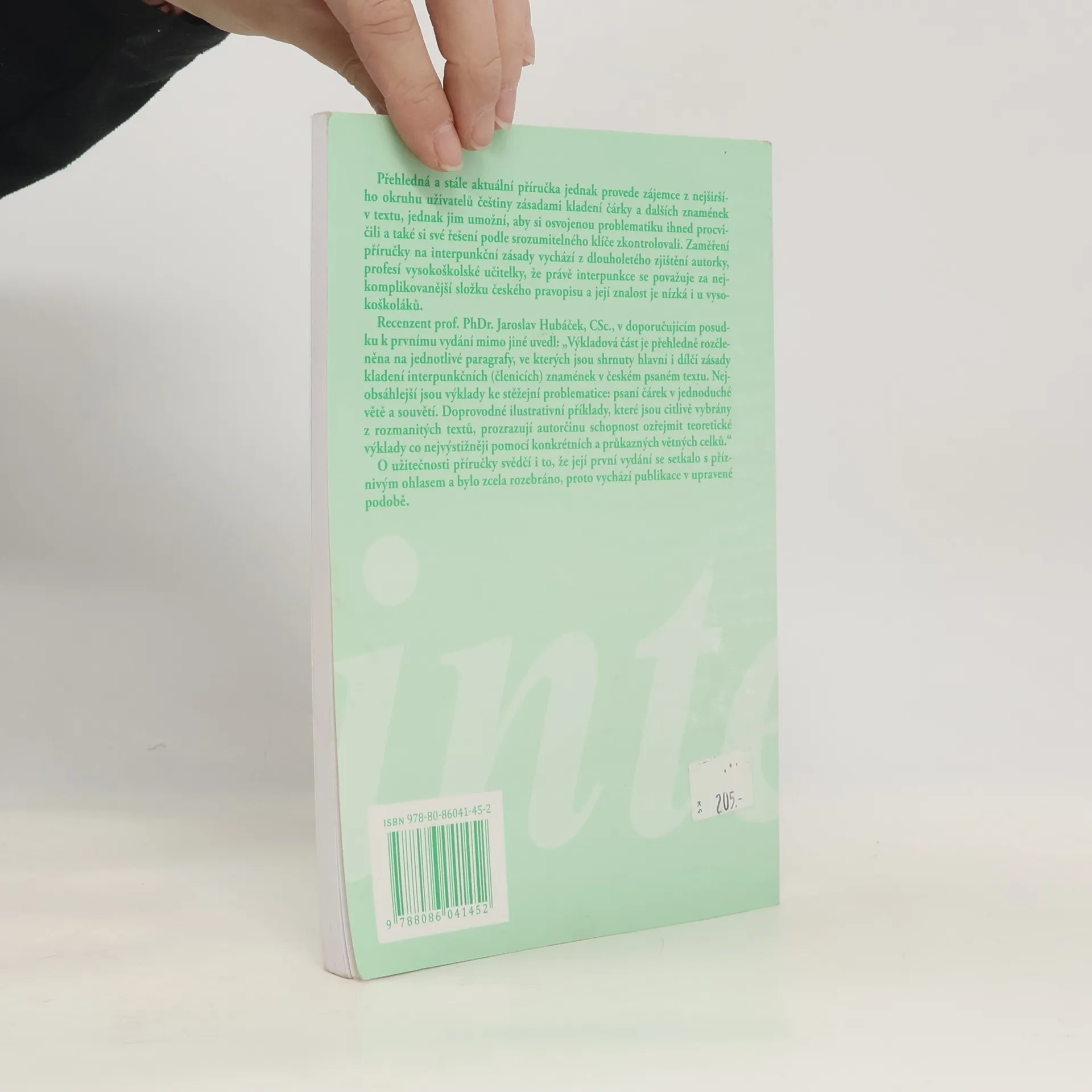 Potřebná a nanejvýš aktuální příručka jednak provede zájemce z nejširšího okruhu uživatelů češtiny zásadami kladení čárky a dalších znamének v textu, jednak jim umožní, aby si osvojenou prolematiku procvičili a ihned také své řešení zkontrolovali podle srozumitelného klíče. Zaměření příručky na interpunkční zásady vychází z dlouholetého zjištění autorky, profesí vysokoškolské učitelky, že právě interpunkce se často jeví jako nejkomplikovanější složka českého pravopisu a že co do užití interpunkčních znamének nemají jasno mnohdy ani vysokoškoláci.
