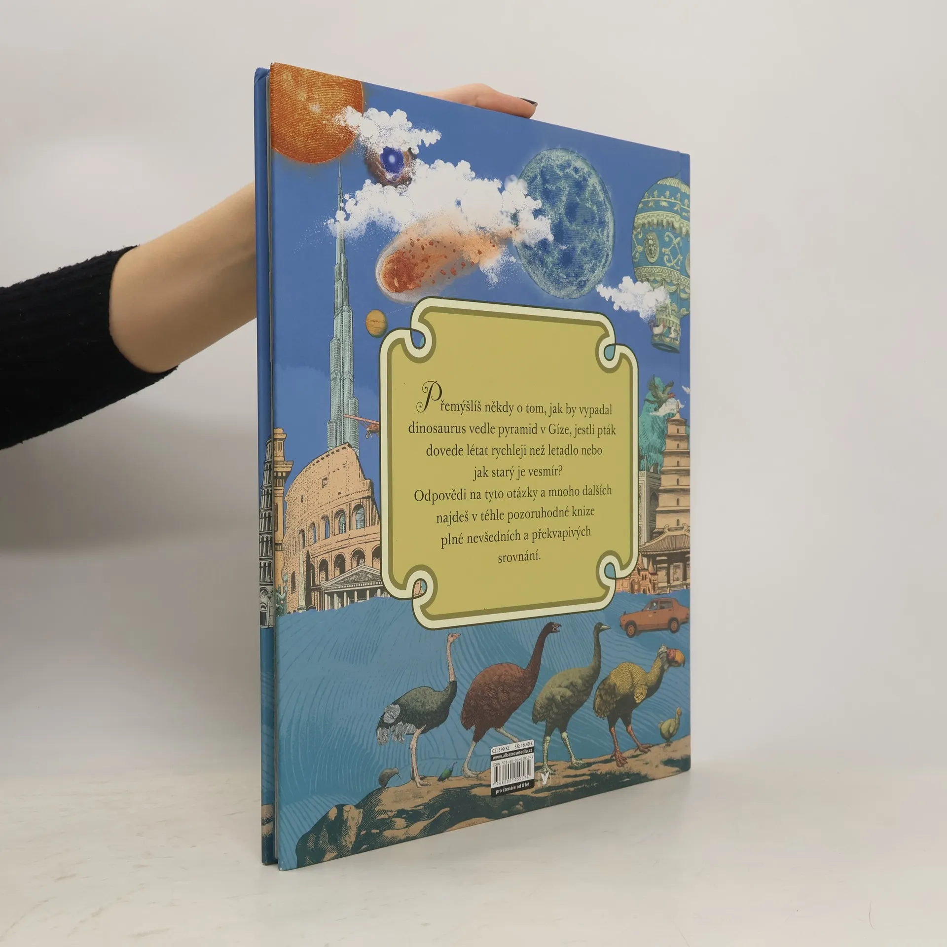 Spousta zajímavých informací a překvapivých srovnání! Přemýšlíš někdy o tom, jak by vypadal dinosaurus vedle pyramid v Gíze, jestli pták dovede létat rychleji než letadlo nebo jak starý je vesmír? Odpovědi na tyto otázky a mnoho dalších najdeš v téhle pozoruhodné knize plné nevšedních a překvapivých srovnání.