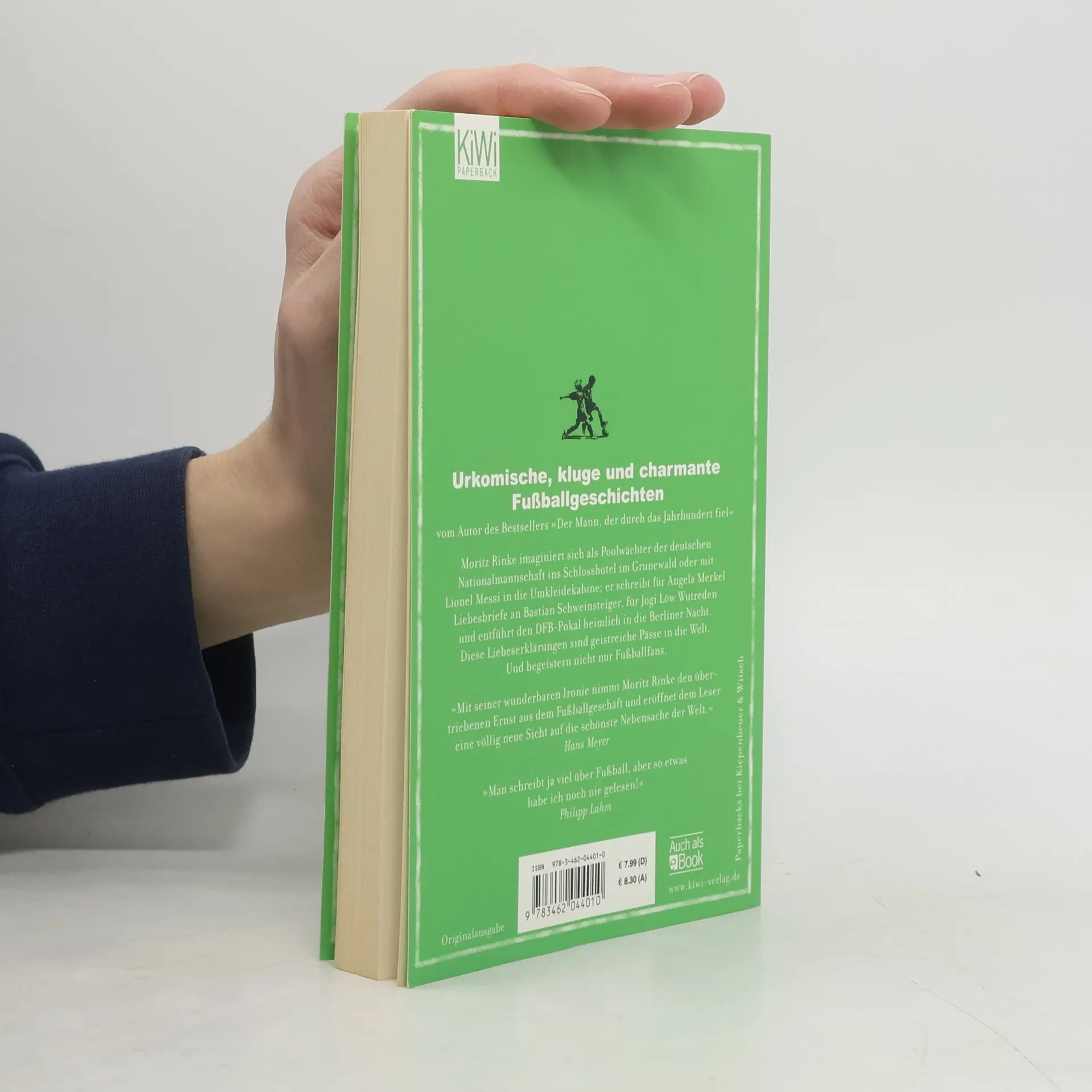 Literatur und Fußball: Beides ist zunächst ein Spiel, doch es geht immer um alles, ums Letzte, ums Ganze. Moritz Rinke, bekannter Dramatiker und Romancier, widmet seine Leidenschaft dem Fußball und imaginiert sich als Poolwächter der deutschen Nationalmannschaft im Schlosshotel Grunewald oder mit Beckenbauer auf der Toilette. Er verfasst Liebesbriefe für Angela Merkel an Bastian Schweinsteiger, Wutreden für Jogi Löw und Dramolette über Kloses Torkrisen, während er den DFB-Pokal heimlich in die Berliner Nacht entführt. Mit Witz, Scharfsinn und Charme beleuchtet Rinke die Fußballerseele, die Facetten des Sports und die damit verbundenen Emotionen. Diese Liebeserklärungen sind geistreiche Pässe in eine faszinierende Welt und begeistern nicht nur Fußballfans! Hans Meyer, ehemaliger Bundesligatrainer, lobt Rinkes Ironie, die den Ernst des Fußballgeschäfts relativiert und neue Perspektiven eröffnet. Philipp Lahm, Kapitän der deutschen Nationalmannschaft, äußert, dass er so etwas noch nie gelesen habe. Thomas Schaaf, Trainer beim SV Werder Bremen, würde Rinke gerne beim nächsten Spiel einwechseln, wenn er so spielt, wie er schreibt.