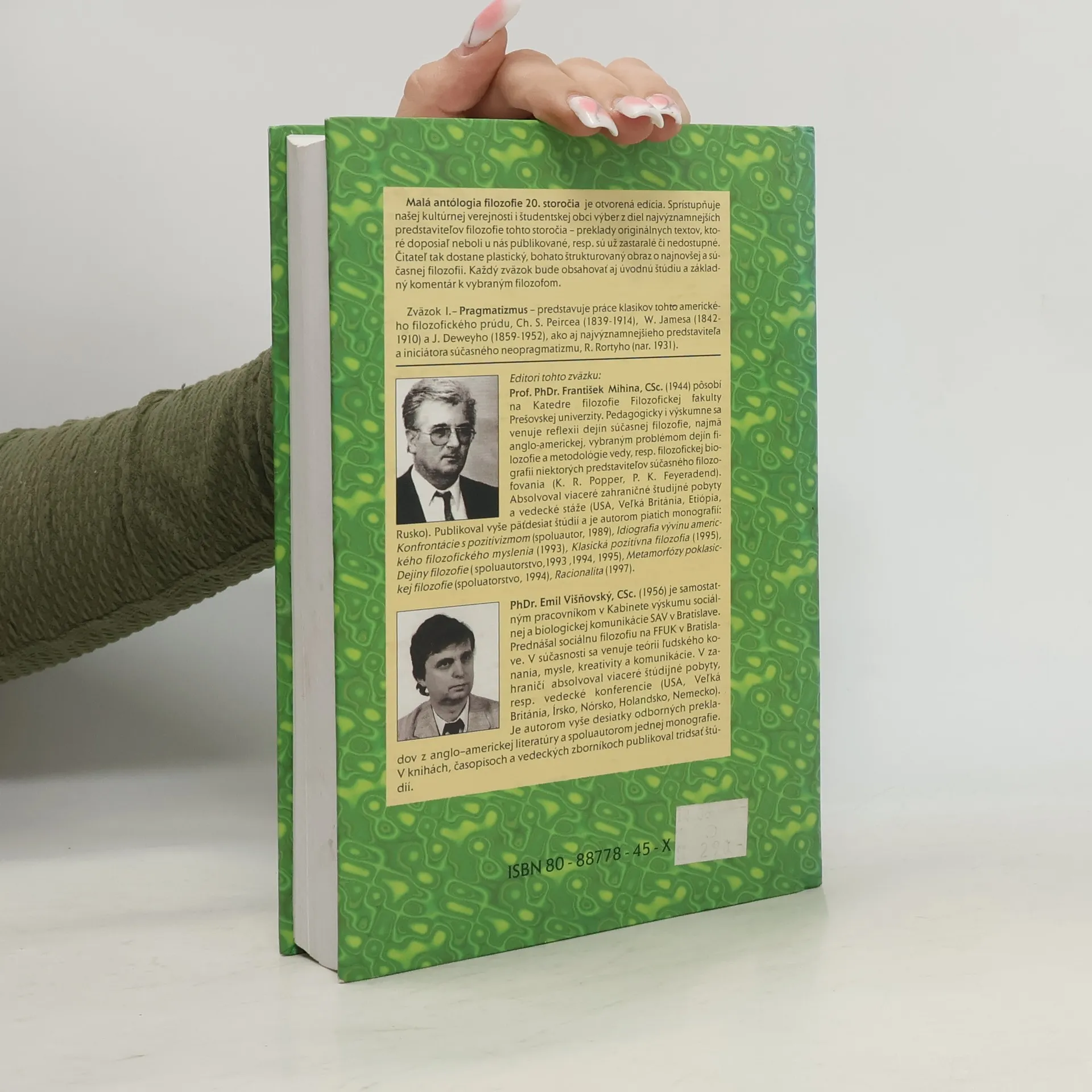Obsah: Predhovor k Malej antológii filozofie 20. storočia (František Mihina - Emil Višňovský) PRAGMATIZMUS VČERA A DNES (Emil Višňovský — František Mihina) Klasický pragmatizmus CHARLES SANDERS PEIRCE (František Mihina) — Upevňovanie viery — Ako vyjasniť naše idey — Princípy fenomenológie — Základy pragmatizmu — Logika ako semiotika: teória znakov — Filozofia a vedy: klasifikácia — Uniformita WILLIAM JAMES (František Mihina) — Prúd myslenia — Existuje „vedomie“? — Radikálny empirizmus — Pragmatizmus a radikálny empirizmus — Pragmatizmus a zdravý rozum — Pragmatistická koncepcia pravdy — Pragmatistický výklad pravdy a jeho nesprávne pochopenia — Pragmatizmus a humanizmus — Pragmatizmus a náboženstvo — Vôľa veriť JOHN DEWEY (Emil Višňovský) — Prečo študovať filozofiu? — Filozofia a americký národný život — Vplyv darvinizmu na filozofiu — Vplyv pragmatizmu na výchovu — Filozofia výchovy — Potreba obnovy filozofie — Skúsenosť a filozofická metóda — Súkromné a verejné — Indivíduum v kultúrnej kríze — Únik z ohrozenia — Model skúmania — Budúcnosť filozofie v nalej ére vedy (Jej rola nikdy nebola väčšia) Neopragmatizmus RICHARD RORTY (Emil Višňovský) — Čo je pragmatizmus — Pragmatizmus a filozofia — Pragmatizmus je politický skrz-naskrz Vybraná bibliografia k štúdiu filozofie pragmatizmu Edičná poznámka Menný register... celý text