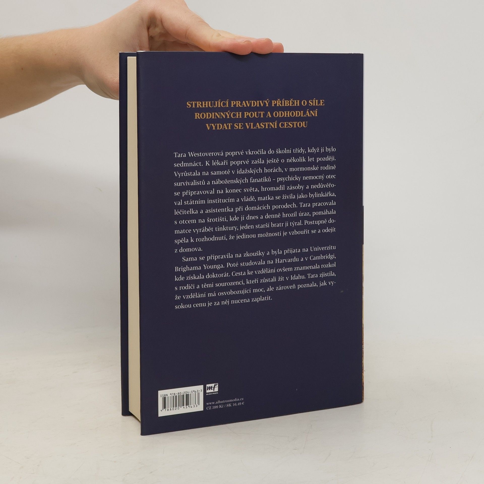 Strhující pravdivý příběh o síle rodinných pout a odhodlání vydat se vlastní cestou. Tara Westoverová poprvé vkročila do školy, když jí bylo sedmnáct. Vyrůstala na samotě v rodině survivalistů a náboženských fanatiků a až v dospívání našla odvahu hledat si vlastní cestu. Studovala na Harvardu a v Cambridgi a zjistila, že vzdělání má osvobozující moc, ale že za něj bude muset zaplatit vysokou cenu.