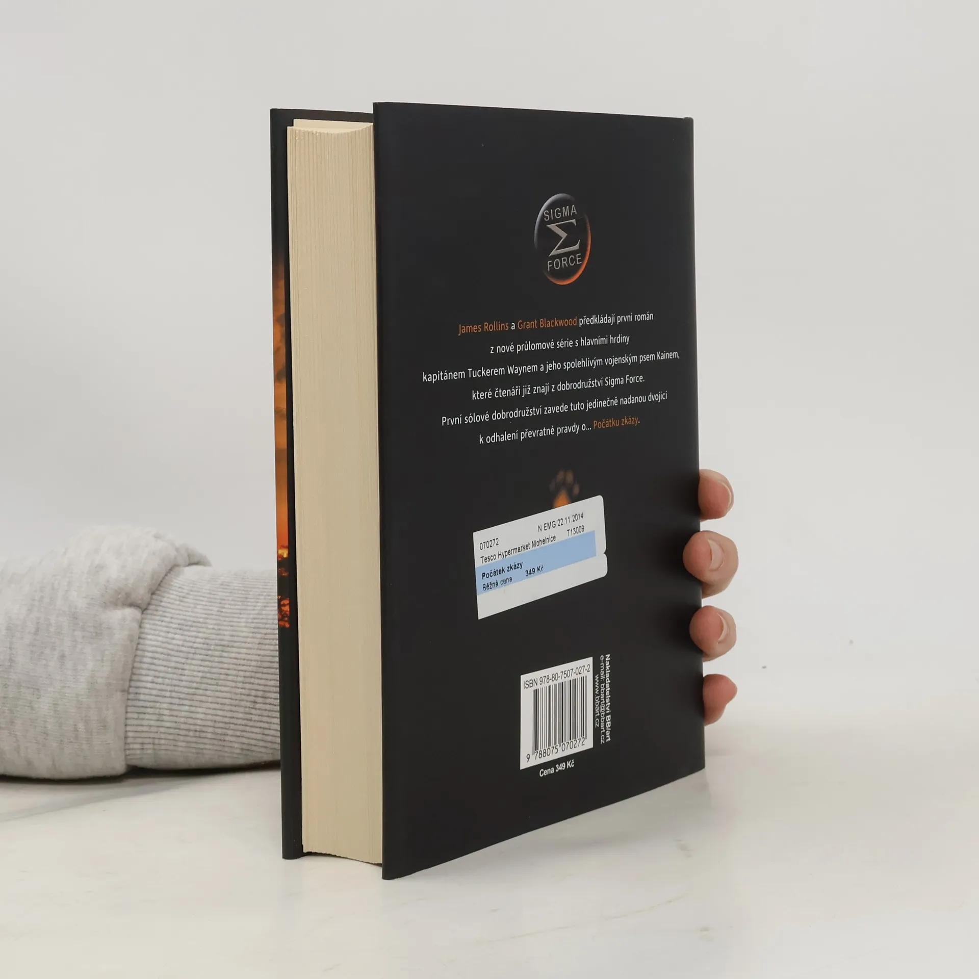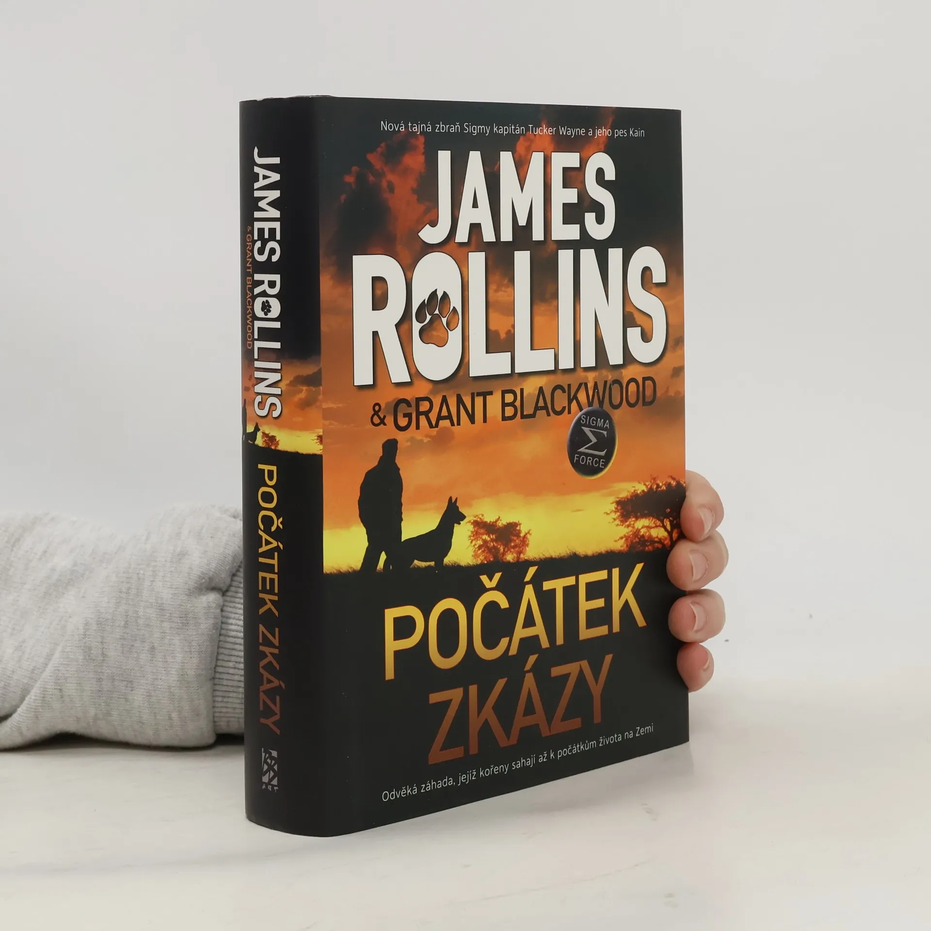 James Rollins a Grant Blackwood předkládají první román z nové průlomové série s hlavními hrdiny kapitánem Tuckerem Waynem a jeho spolehlivým vojenským psem Kainem, které čtenáři již znají z dobrodružství Sigma Force. První sólové dobrodružství zavede tuto jedinečně nadanou dvojici k odhalení převratné pravdy o… Počátku zkázy. Nejnovější člen Sigmy kapitán Tucker Wayne dostane od ředitele Crowea za úkol, aby se svým vycvičeným psem Kainem odvezl ze Sibiře ruského farmaceutického magnáta a vědeckého génia Abrama Bukolova, který má v rukou klíč k nové biologické zbrani, jež ohrožuje život na celé planetě. Při zběsilé honičce od zamrzlých ruských stepí po žhavé jihoafrické savany, od válkou zmítaných hor Namibie po zasněžená Velká jezera ve Spojených státech, musejí Tucker s Kainem společně vyřešit odvěkou záhadu, jejíž kořeny sahají až k počátkům života na Zemi, a ještě k tomu unikat před nástrahami zkušených nájemných zabijáků a ruského generála toužícího po pomstě a moci. Pevné pouto mezi člověkem a psem bude podrobeno extrémní zatěžkávací zkoušce. Nalezení řešení a odvrácení globální apokalypsy bude vyžadovat jejich veškeré dovednosti, talent a především vzájemnou důvěru.
