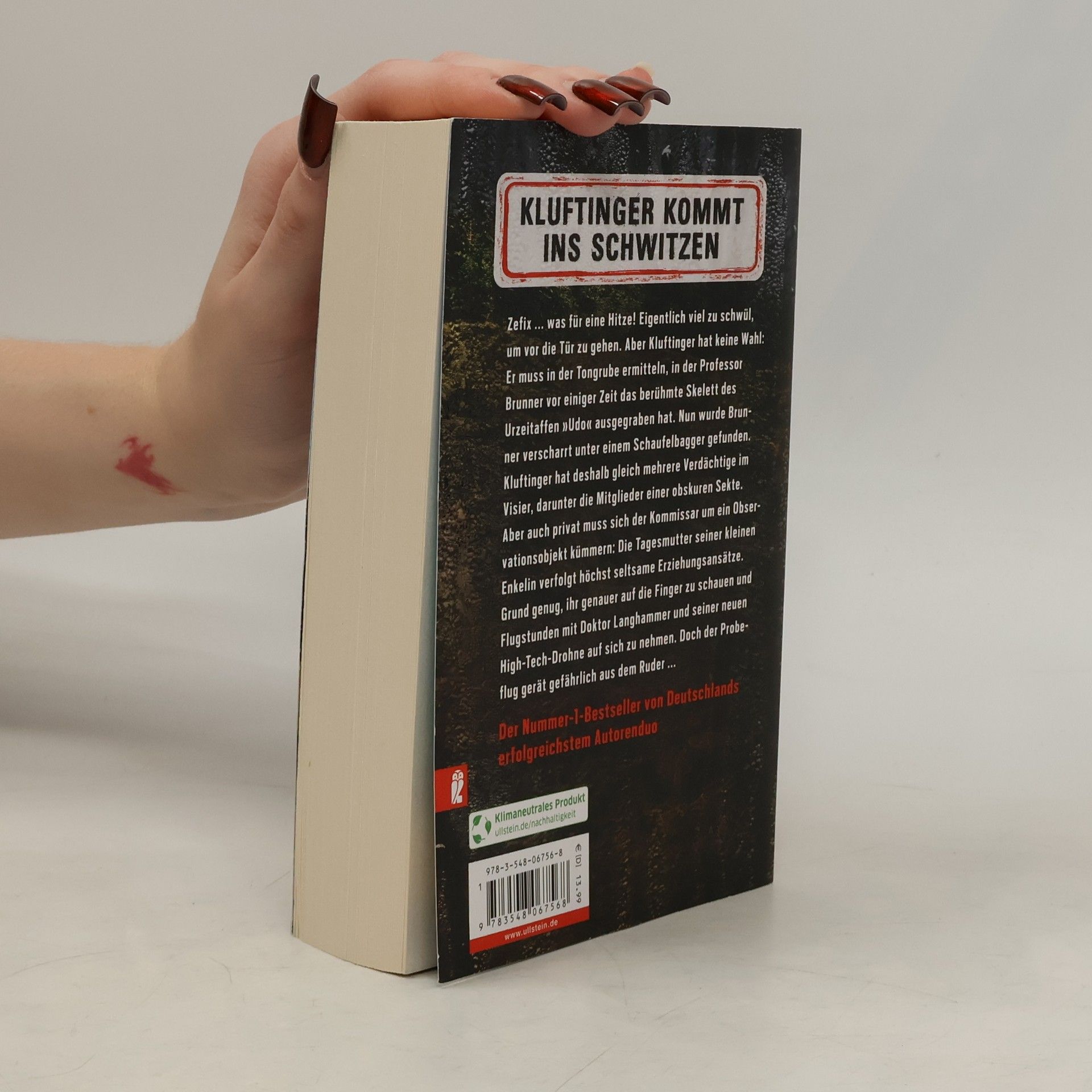 Kluftinger kommt ins Schwitzen Zefix ... was für eine Hitze! Eigentlich viel zu schwül, um vor die Tür zu gehen. Aber Kluftinger hat keine Wahl: Er muss in der Tongrube ermitteln, in der Professor Brunner vor einiger Zeit das berühmte Skelett des Urzeitaffen „Udo“ ausgegraben hat. Nun wurde Brunner verscharrt unter einem Schaufelbagger gefunden. Der Wissenschaftler, der mit seinem Fund beweisen wollte, dass die Wiege der Menschheit im Allgäu liegt, hatte viele Feinde. Kluftinger hat deshalb gleich mehrere Verdächtige im Visier, darunter die Mitglieder einer obskuren Sekte. Aber auch privat muss sich der Kommissar um ein Observationsobjekt kümmern: Die Tagesmutter seiner kleinen Enkelin verfolgt höchst seltsame Erziehungsansätze. Grund genug, ihr genauer auf die Finger zu schauen und Flugstunden mit Doktor Langhammer und seiner neuen High-Tech-Drohne auf sich zu nehmen. Doch der Probeflug gerät gefährlich aus dem Ruder ...