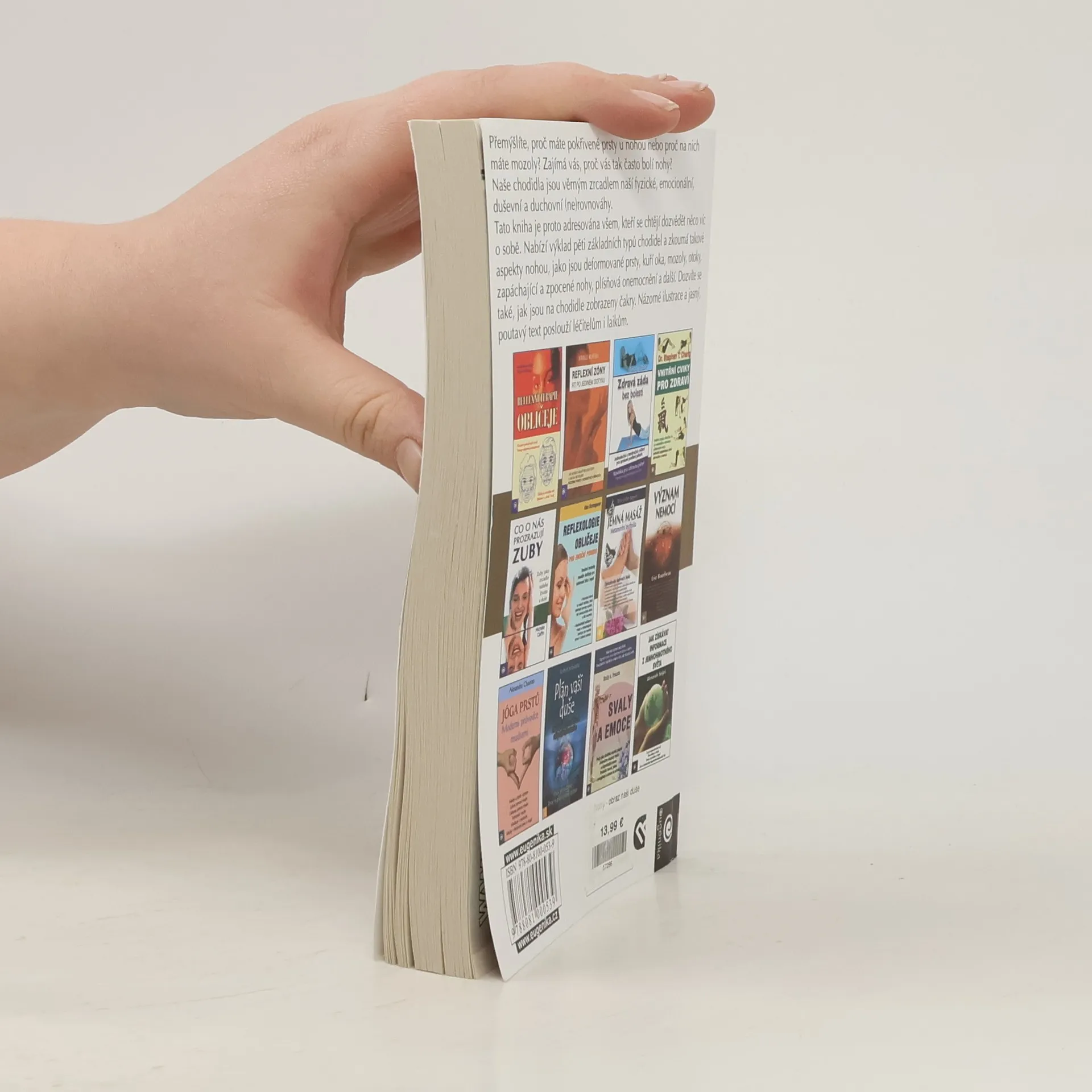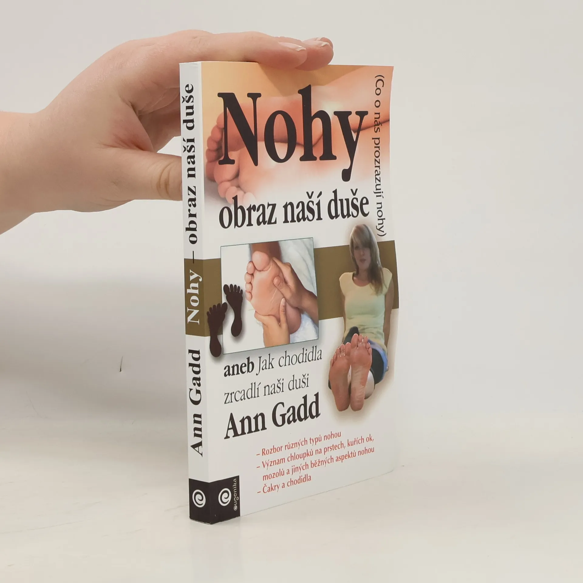 aneb Jak chodidla zrcadlí naši duši Přemýšlíte, proč máte pokřivené prsty u nohou nebo proč na nich máte mozoly? Zajímá vás, proč vás tak často bolí nohy? Naše chodidla jsou věrným zrcadlem naší fyzické, emocionální, duševní a duchovní (ne)rovnováhy. Tato kniha je proto adresována všem, kteří se chtějí dozvědět něco víc o sobě. Nabízí výklad pěti základních typů chodidel a zkoumá takové aspekty nohou, jako jsou deformované prsty, kuří oka, mozoly, otoky, zapáchající a zpocené nohy, plísňová onemocnění a další. Dozvíte se také, jak jsou na chodidle zobrazeny čakry. Názorné ilustrace a jasný, poutavý text poslouží léčitelům i laikům. Rozbor různých typů nohou. Význam chloupků na prstech, kuřích ok, mozolů a jiných běžných aspektů nohou. Čakry a chodidla.