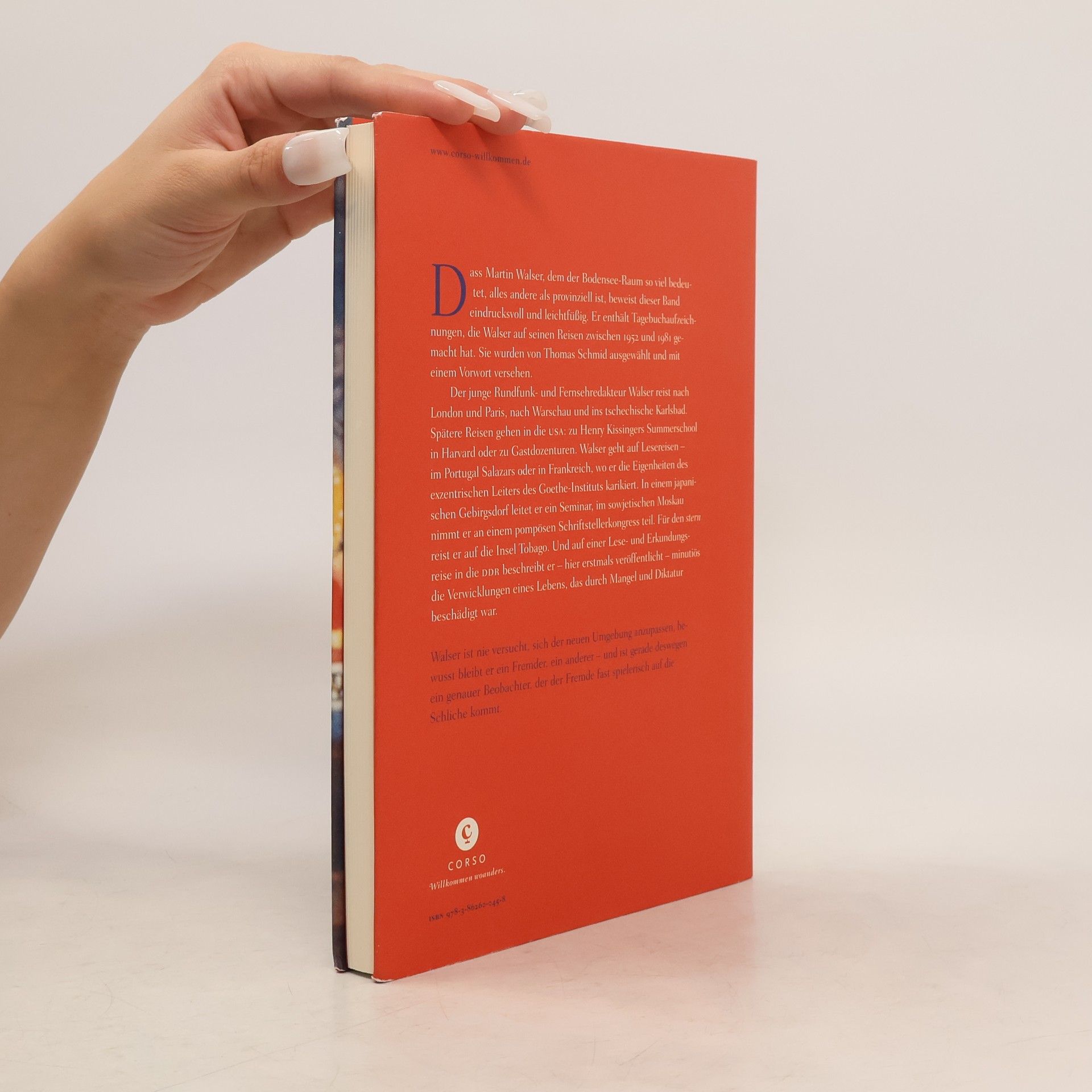 Der Heimatschriftsteller Martin Walser zeigt in diesem Band eindrucksvoll, dass er auch als Reiseschriftsteller glänzt und keineswegs provinziell ist. Er präsentiert Tagebuchaufzeichnungen aus seinen Reisen zwischen 1952 und 1981. Früh zieht es den jungen Rundfunk- und Fernsehredakteur nach London und Paris, aber auch nach Warschau und Karlovy Vary, wo der alte k. u. k-Geist auf den Charme des Sozialismus trifft. Spätere Reisen führen ihn per Schiff und Flugzeug in die USA, etwa zu Henry Kissingers Summerschool in Harvard oder als Gastdozent in Austin, Texas. Walser ist auch auf Lesereisen in Portugal und Frankreich, wo er den exzentrischen Leiter des Goethe-Instituts humorvoll karikiert. In einem japanischen Gebirgsdorf leitet er ein Literaturseminar und nimmt in Moskau an einem pompösen Schriftstellerkongress teil. Er bereist Tobago im Auftrag des stern, dessen Reportage aufgrund ihrer ernsten Töne nicht veröffentlicht wird. Auf einer Lese- und Erkundungsreise in die DDR beschreibt er 1981 präzise die Verwicklungen eines Lebens, das durch Mangel und Diktatur geprägt ist. Walser bleibt ein bewusster Fremder, der die Umgebung genau beobachtet und die Eigenheiten spielerisch ergründet.
