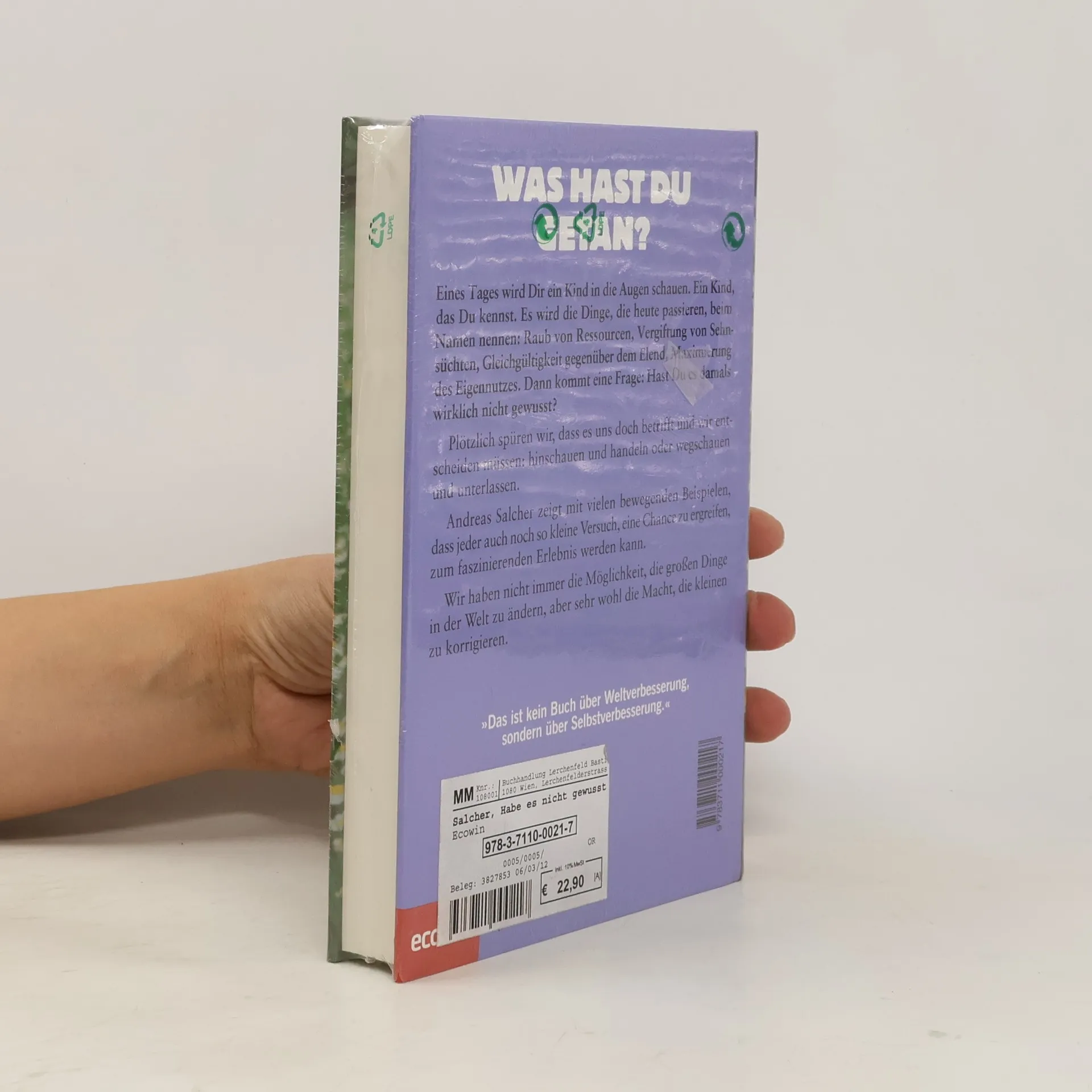 Was hast du getan? Eines Tages wird Dir ein Kind in die Augen schauen. Ein Kind, das Du kennst. Es wird die Dinge, die heute passieren, beim Namen nennen: Raub von Ressourcen, Vergiftung von Sehnsüchten, Gleichgültigkeit gegenüber dem Elend, Maximierung des Eigennutzes. Dann kommt eine Frage: Hast Du es damals wirklich nicht gewusst? Plötzlich spüren wir, dass es uns doch betrifft und wir entscheiden müssen: hinschauen und handeln oder wegschauen und unterlassen. Andreas Salcher zeigt mit vielen bewegenden Beispielen, dass jeder auch noch so kleine Versuch, eine Chance zu ergreifen, zum faszinierenden Erlebnis werden kann. Wir haben nicht immer die Möglichkeit, die großen Dinge in der Welt zu ändern, aber sehr wohl die Macht, die kleinen zu korrigieren. „Das ist kein Buch über Weltverbesserung, sondern über Selbstverbesserung.“