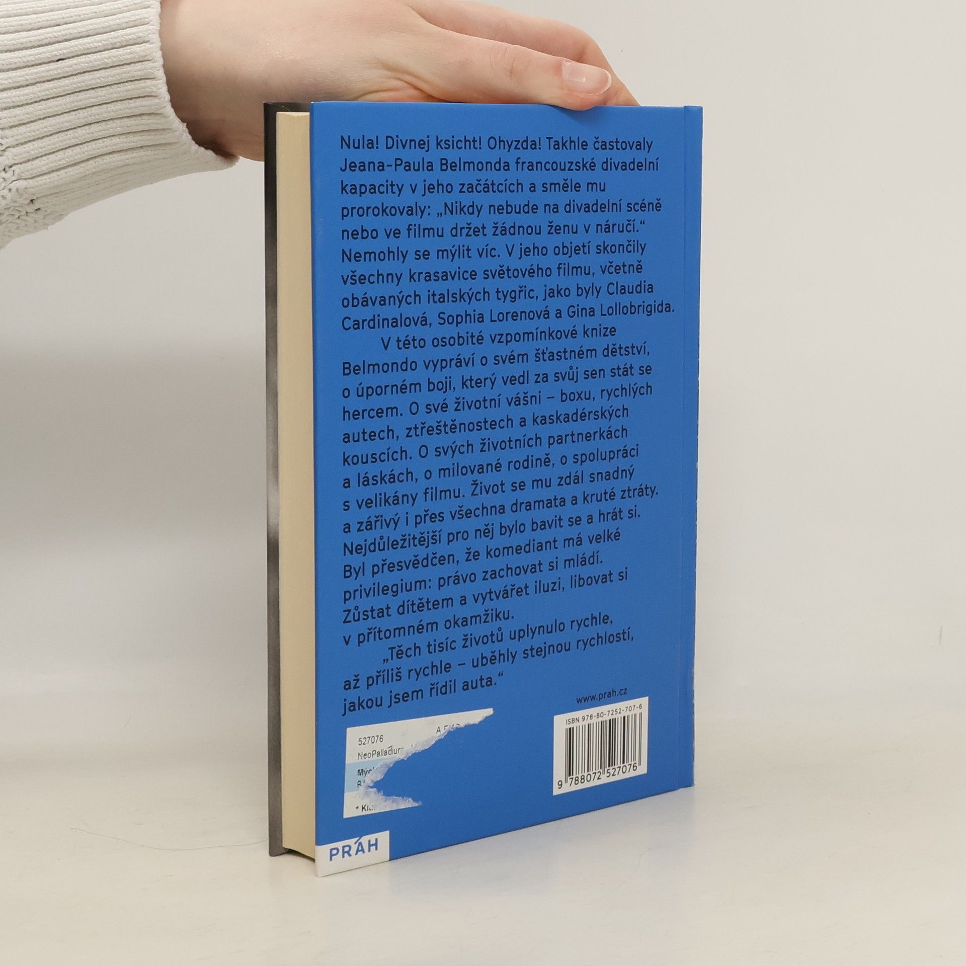 „Těch tisíc životů uplynulo rychle, až příliš rychle – uběhly stejnou rychlostí, jakou jsem řídil auta.“ Víc než jen autobiografie. Vyprávění o výjimečném a šťastném životě. Nula! Divnej ksicht! Ohyzda! Takhle častovali Jeana-Paula Belmonda francouzské divadelní kapacity v jeho začátcích a směle mu prorokovali: „Nikdy nebude na divadelní scéně nebo ve filmu držet žádnou ženu v náručí.“ Nemohli se mýlit víc. Skončily v ní všechny krasavice světového filmu, včetně obávaných italských tygřic, jako byly Claudia Cardinaleová, Sophia Lorenová a Gina Lollobrigida. V této osobité vzpomínkové knize Belmondo vypráví o svém šťastném dětství, o úporném boji, který vedl za svůj sen stát se hercem. O své životní vášni – boxu, rychlý autech, ztřeštěnostech a kaskadérských kouscích. O svých životních partnerkách a láskách, o milované rodině, o spolupráci s velikány filmu. Život se mu zdál snadný a zářivý i přes všechna dramata a kruté ztráty. Nejdůležitější pro něj bylo bavit se a hrát si. Byl přesvědčen, že komediant má velké privilegium: právo zachovat si mládí. Zůstat dítětem a vytvářet iluzi, libovat si v přítomném okamžiku.
