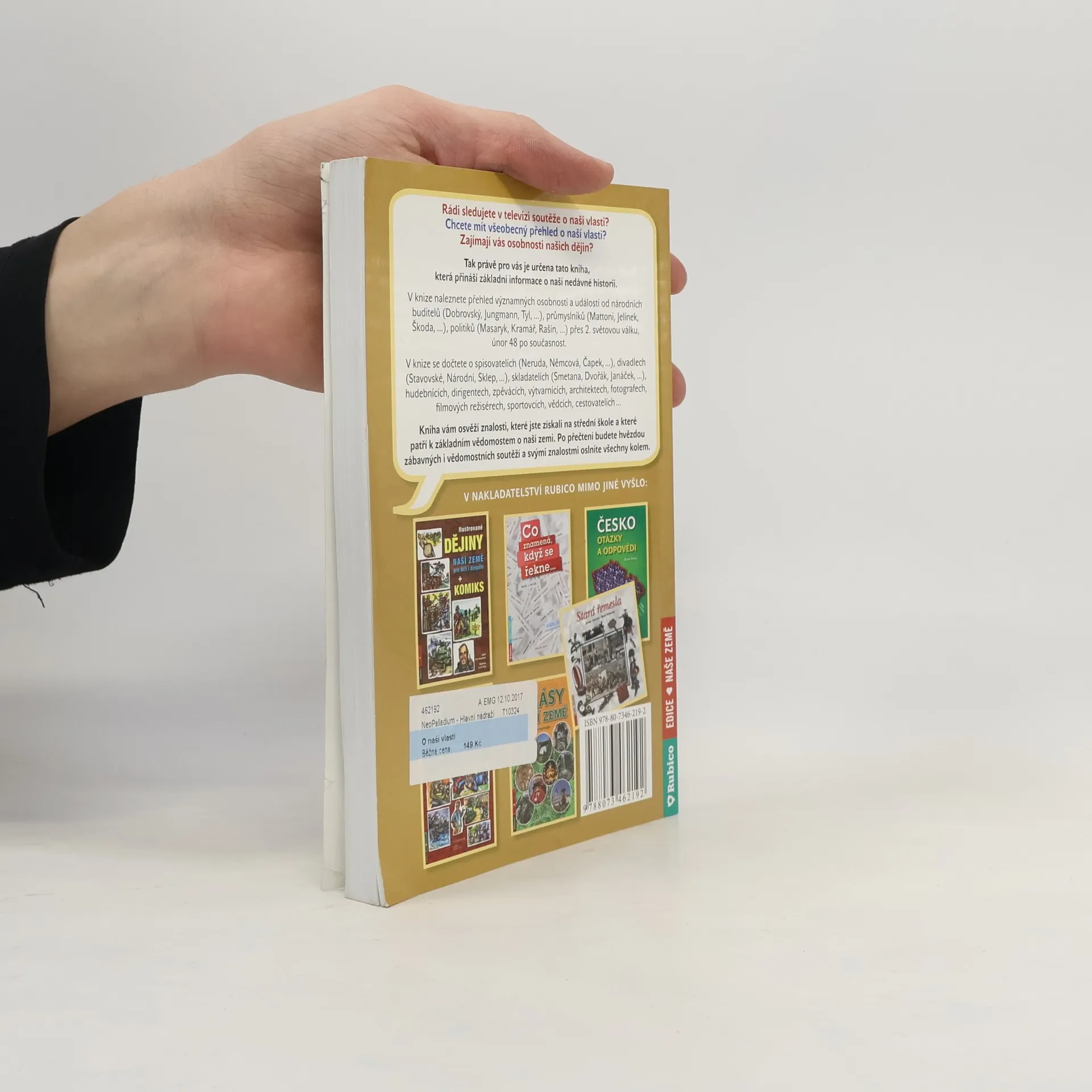 Rádi sledujete v televizi soutěže o naší vlasti? Chcete mít všeobecný přehled o naší vlasti? Zajímají vás osobnosti našich dějin? Tak právě pro vás je určena tato kniha, která přináší základní informace o naší nedávné historii. V knize naleznete přehled významných osobností a událostí od národních buditelů (Dobrovský, Jungmann, Tyl, …), průmyslníků (Mattoni, Jelínek, Škoda, …), politiků (Masaryk, Kramář, Rašín, …), přes 2. světovou válku, únor 48, po současnost. V knize se dočtete o spisovatelích (Neruda, Němcová, Čapek, …), divadlech (Stavovské, Národní, Sklep, …), skladatelích (Smetana, Dvořák, Janáček, …), muzikantech, dirigentech, zpěvácích, výtvarnících, architektech, fotografech, filmových režisérech, sportovcích, vědcích, cestovatelích … Kniha vám osvěží znalosti, které jste získali na střední škole a které patří k základním vědomostem o naší zemi. Po přečtení budete hvězdou zábavných i vědomostních soutěží a svými znalostmi oslníte všechny kolem.