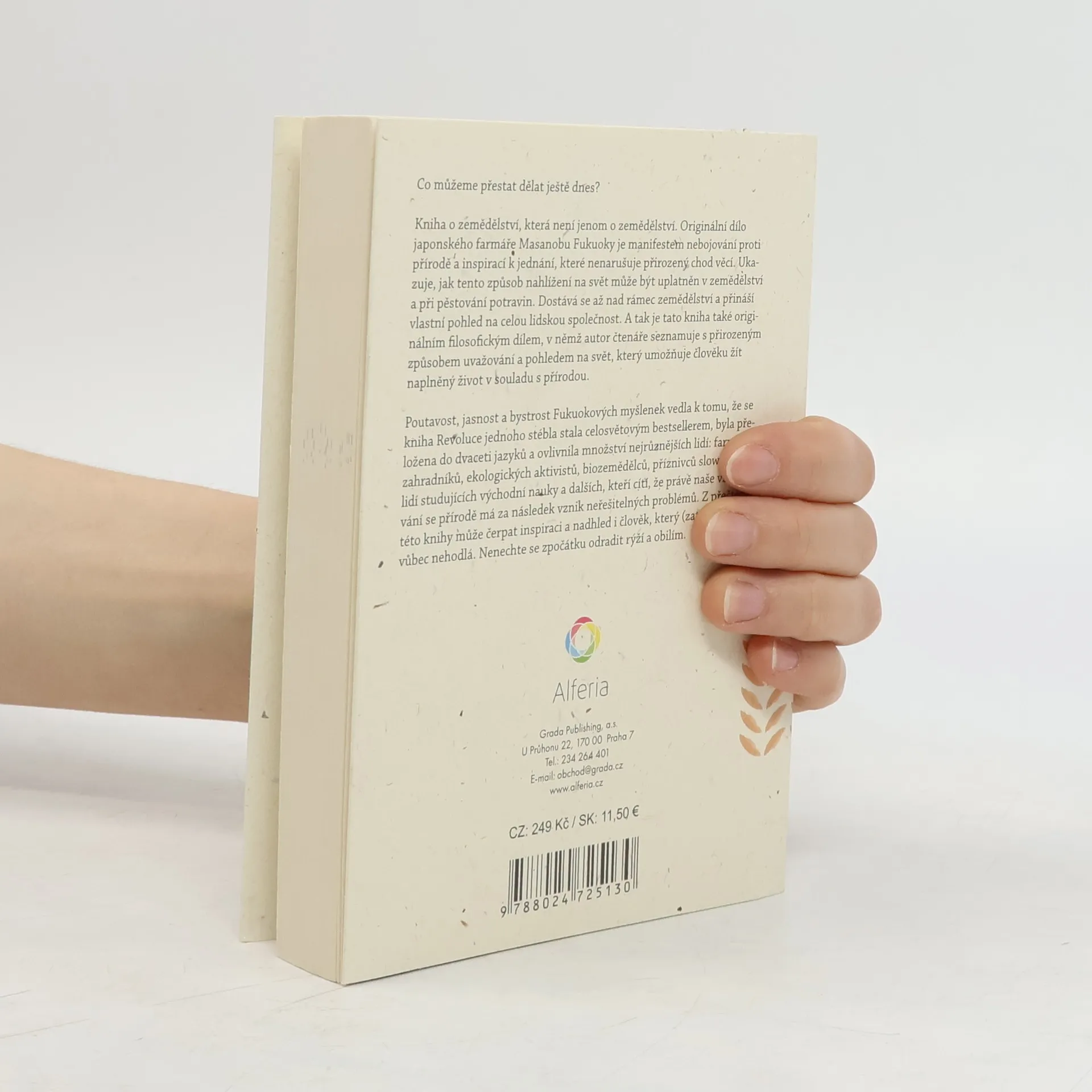 Kniha o zemědělství, která není jenom o zemědělství. Originální dílo japonského farmáře Masanobuy Fukuoky je manifestem nebojování proti přírodě a inspirací k jednání, které nenarušuje přirozený chod věcí. Ukazuje, jak tento způsob nahlížení na svět může být uplatněn v zemědělství a při pěstování potravin. Dostává se až nad rámec zemědělství a přináší vlastní pohled na celou lidskou společnost. A tak je tato kniha také originálním filosofickým dílem, v němž autor čtenáře seznamuje s přirozeným způsobem uvažování a pohledem na svět, který umožňuje člověku žít naplněný život v souladu s přírodou. Poutavost, jasnost a bystrost Fukuokových myšlenek vedla k tomu, že se kniha Revoluce jednoho stébla stala celosvětovým bestsellerem, byla přeložena do 20 jazyků a ovlivnila množství nejrůznějších lidí: farmářů, zahradníků, ekologických aktivistů, biozemědělců, příznivců slow food, lidí studujících východní nauky a dalších, kteří cítí, že právě naše vzdalování se přírodě má za následek vznik neřešitelných problémů. Z přečtení této knihy může čerpat inspiraci a nadhled i člověk, který (zatím) farmařit vůbec nehodlá. Nenechte se zpočátku odradit rýží a obilím.