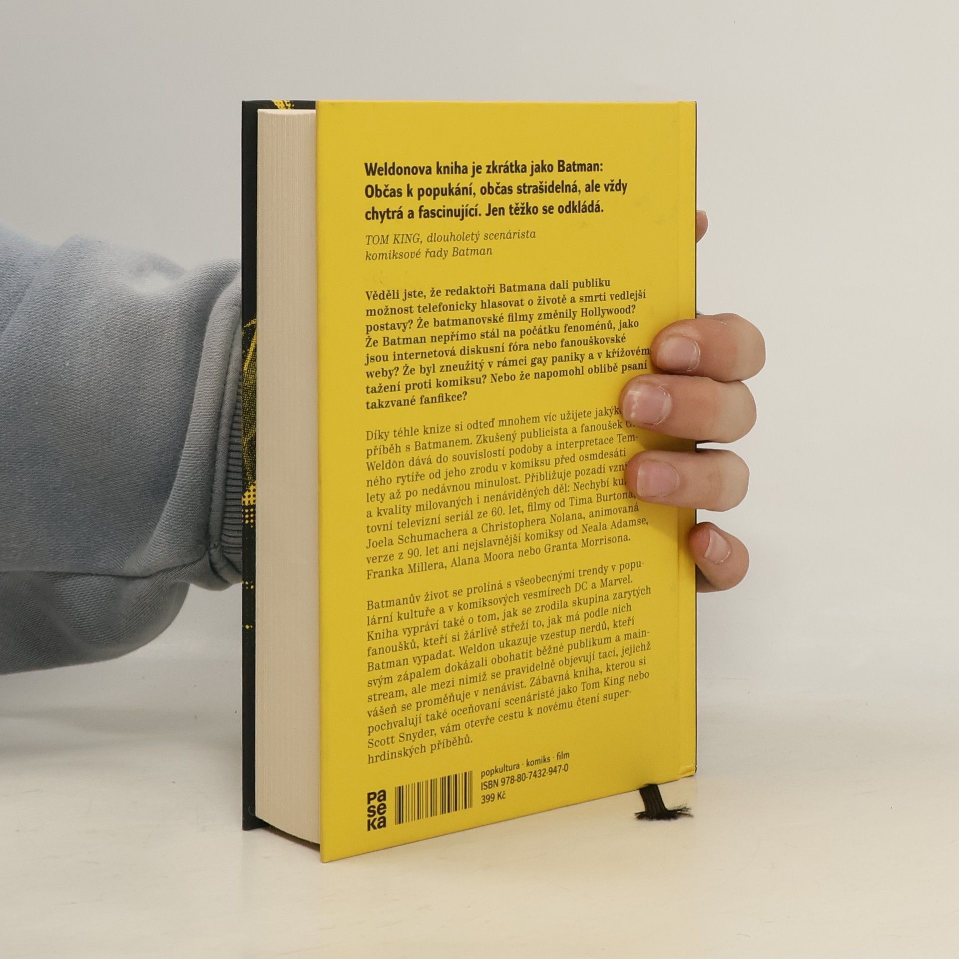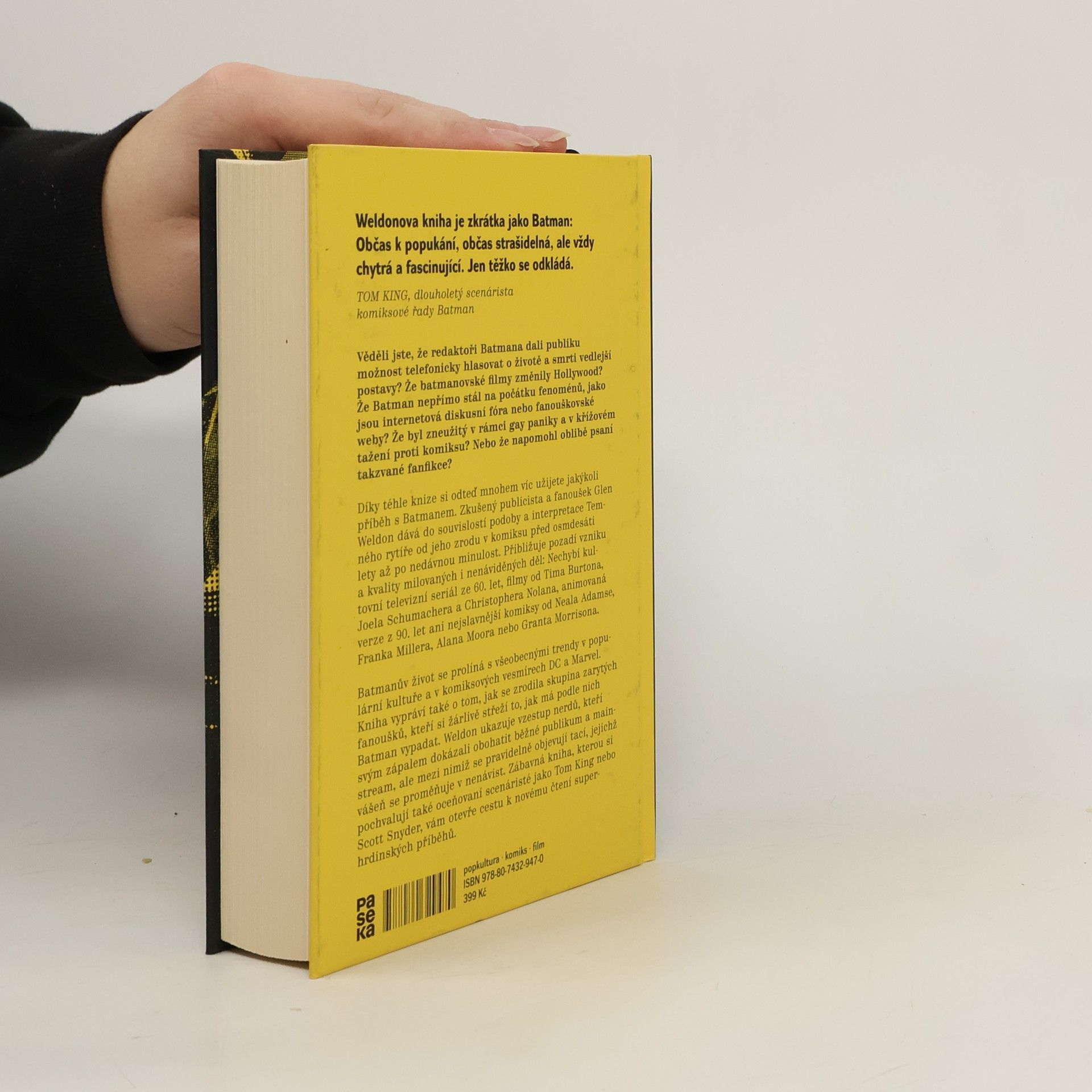 Historie Batmana a zrod nerdů. Tahle kniha ukrývá víc překvapení než Batmanův opasek. Věděli jste, že redaktoři Batmana dali publiku možnost telefonicky hlasovat o životě a smrti vedlejší postavy? Že filmy s Batmanem navždy změnily hollywoodský marketing? Že nepřímo stál na počátku fenoménů, jako jsou internetová diskusní fóra nebo fanouškovské weby, a že napomohl oblibě psaní takzvané fanfikce? Zkušený publicista a fanoušek Glen Weldon dává do souvislostí podoby a interpretace Temného rytíře od jeho zrodu v komiksu před 80 lety až po nedávnou minulost. Přibližuje pozadí vzniku a kvality milovaných i nenáviděných děl: Nechybí televizní seriál ze 60. let, filmy od Tima Burtona, Joela Schumachera a Christophera Nolana, animovaná verze z 90. let ani nejslavnější komiksy od Neala Adamse, Franka Millera, Alana Moora nebo Granta Morrisona. Batmanův život na papíře i mimo něj se prolíná se vznikem kultury zarytých fanoušků, kteří si žárlivě střeží to, jak má podle nich Batman vypadat a koho má reprezentovat. Weldon ukazuje vzestup nerdů, kteří svým zápalem dokázali obohatit běžné publikum a mainstream, ale mezi nimiž se pravidelně objevují tací, jejichž vášeň se proměňuje v nenávist. Objevná kniha, kterou si pochvalují také oceňovaní scenáristé jako Tom King nebo Scott Snyder, vám otevře cestu k novému čtení Batmanových příběhů.