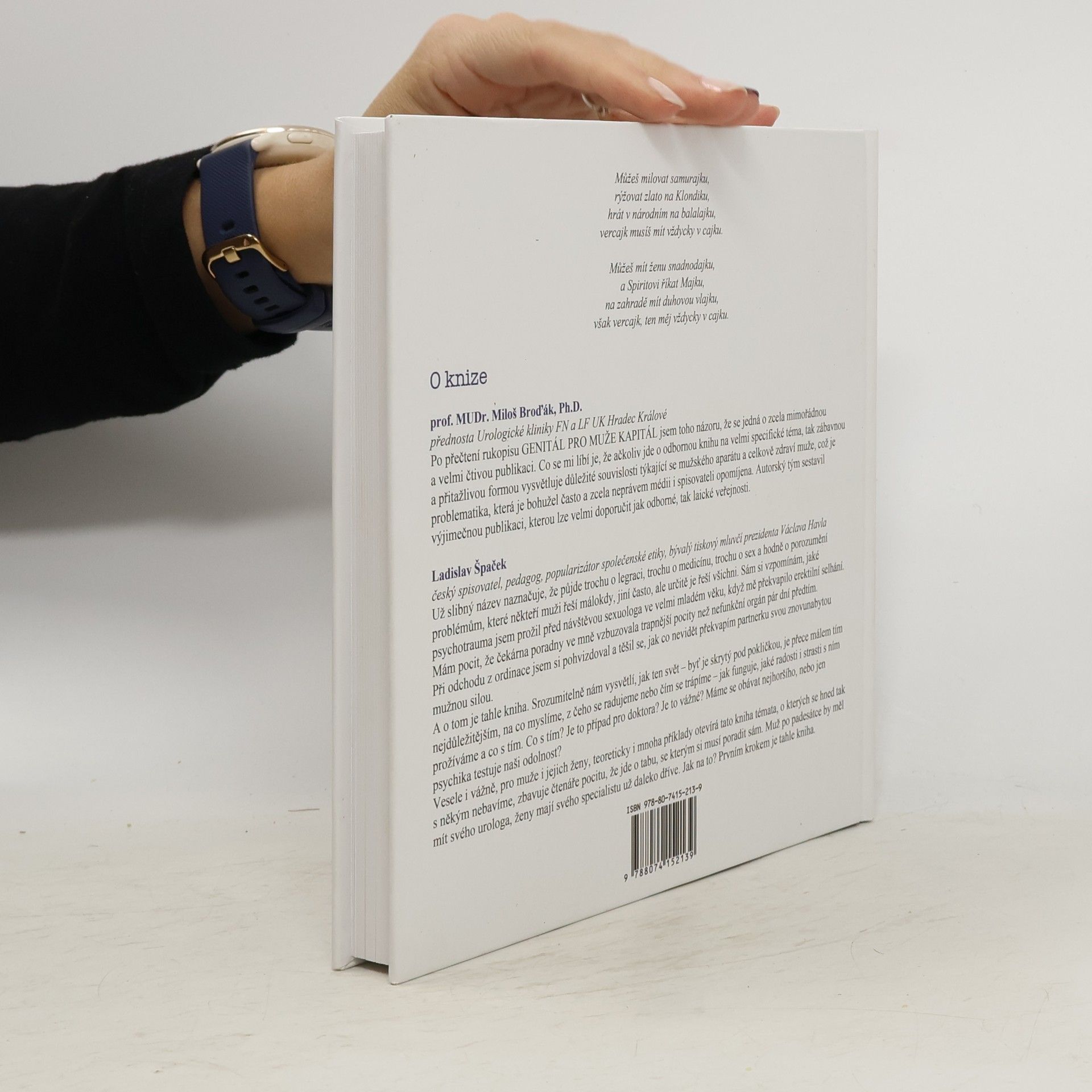 Kniha se zabývá zdravím muže, z pohledu urologa, androloga a psychologa. Podává přehled nejčastějších zdravotních i psychologických problémů , které přicházejí s určitým věkem muže a zaměřuje se na jejich léčbu a prevenci. Je určená všem mužům, odborníkům, laikům ( mužům ) a jejich ženám. Věkově zaměřena spíše na mužskou populaci 40+ , rádi bychom však, aby si knihu koupily/ četly i ženy, které s muži žijí. Jak už název napovídá, hlavním tématem knihy je „mužský genitál“ z toho nejširšího i nejintimnějšího pohledu. V dnešní době, kdy na internetu můžete najít odpověď téměř na jakoukoliv otázku a zároveň si k ní přečíst vášnivé diskuse laických „rádoby-odborníků“, je těžké vyznat se v tom, co je správný výklad toho kterého problému. Pokud jste navíc muž s choulostivým urologickým či andrologickým problémem, často se ve virtuálním prostředí dovíte i to, co zrovna nechcete. Autorské kvarteto, ve složení lékařů z oboru a psycholožky, připravilo publikaci, která čtenáři zodpoví nejzákladnější a nejpalčivější otázky týkající se mužského zdraví. Jednotlivá témata jsou připravena s odbornou pečlivostí a přehlednou, ucelenou formou shrnují problém a nabízí možnosti jeho řešení. Přes veškerý výčet závažných problémů a chorob, je kniha psaná čtivou „light“ formou, srozumitelnou i pro laika. Vše je pak doplněno beletrickými, mnohdy úsměvnými, povídkami z ordinací urologů, které dodávají knize lehkost, humor a nadhled.