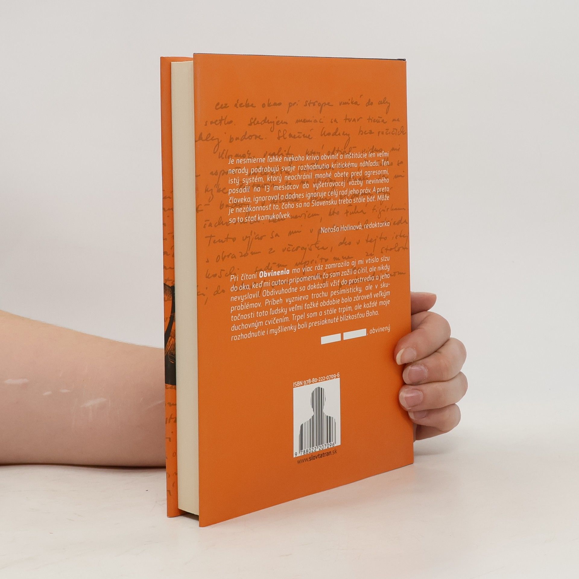 Žijeme v spoločnosti, v ktorej sa podľa posledných odhadov každoročne rieši viac ako 500 prípadov sexuálneho zneužívania a domáceho násilia. Okrem vysokého čísla znepokojuje aj to, že nezanedbateľná časť obvinení sa ukáže ako vykonštruovaná a neopodstatnená a naopak, mnohé opodstatnené prípady sa zľahčujú a pred súd sa nikdy nedostanú. Vladimír Otčenáš, hlavný hrdina knihy Obvinenie, je bežný občan Slovenskej republiky. Má ženu, dve deti a prácu, ktorá ho baví. Pre svoju rodinu svojpomocne postavil rodinný dom na pozemku svokrovcov. So ženou a jej rodinou má drobné nezhody, ale je presvedčený, že ich má každý a že sa časom upravia. Jeho žena však jedného dňa podá na manžela trestné oznámenie za sexuálne zneužívanie dcér a spraví mu zo života peklo. Nemá veľa dôkazov, ale pomáha jej matka, skorumpovaný justičný systém, aparát psychológov, nekompetentných štátnych úradníkov a hlavne predsudky. Počas 13 mesiacov, ktoré Vladimír Otčenáš strávil vo väzbe, príde o rodinu, majetok a s podlomeným zdravím sa ocitne na samom dne spoločnosti. Román je inšpirovaný skutočnými udalosťami a denníkovou formou zachytáva zápas človeka, ktorý sa aj v pekle všednosti snaží nestratiť ľudskosť a nezanevrieť na spoločnosť napriek tomu, že v jeho prípade fatálne zlyhala.
