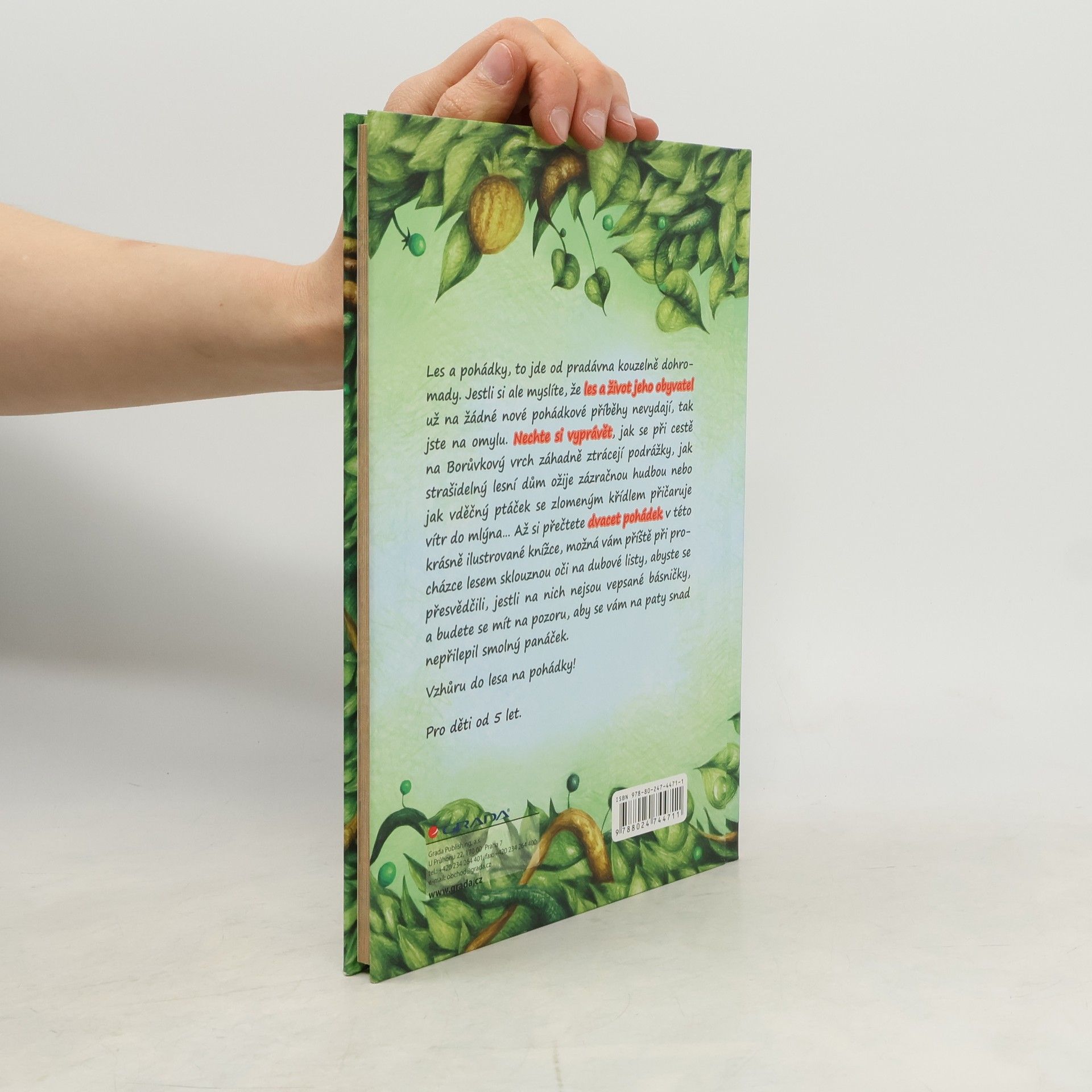Nechte si vyprávět, jak se při cestě na Borůvkový vrch záhadně ztrácejí podrážky, jak strašidelný lesní dům ožije zázračnou hudbou nebo jak vděčný ptáček se zlomeným křídlem přičaruje vítr do mlýna... Až si přečtete dvacet pohádek v této krásně ilustrované knížce, možná vám příště při procházce lesem sklouznou oči na dubové listy, abyste se přesvědčili, jestli na nich nejsou vepsané básničky, a budete se mít na pozoru, aby se vám na paty snad nepřilepil smolný panáček. Pro děti od 5 let.
