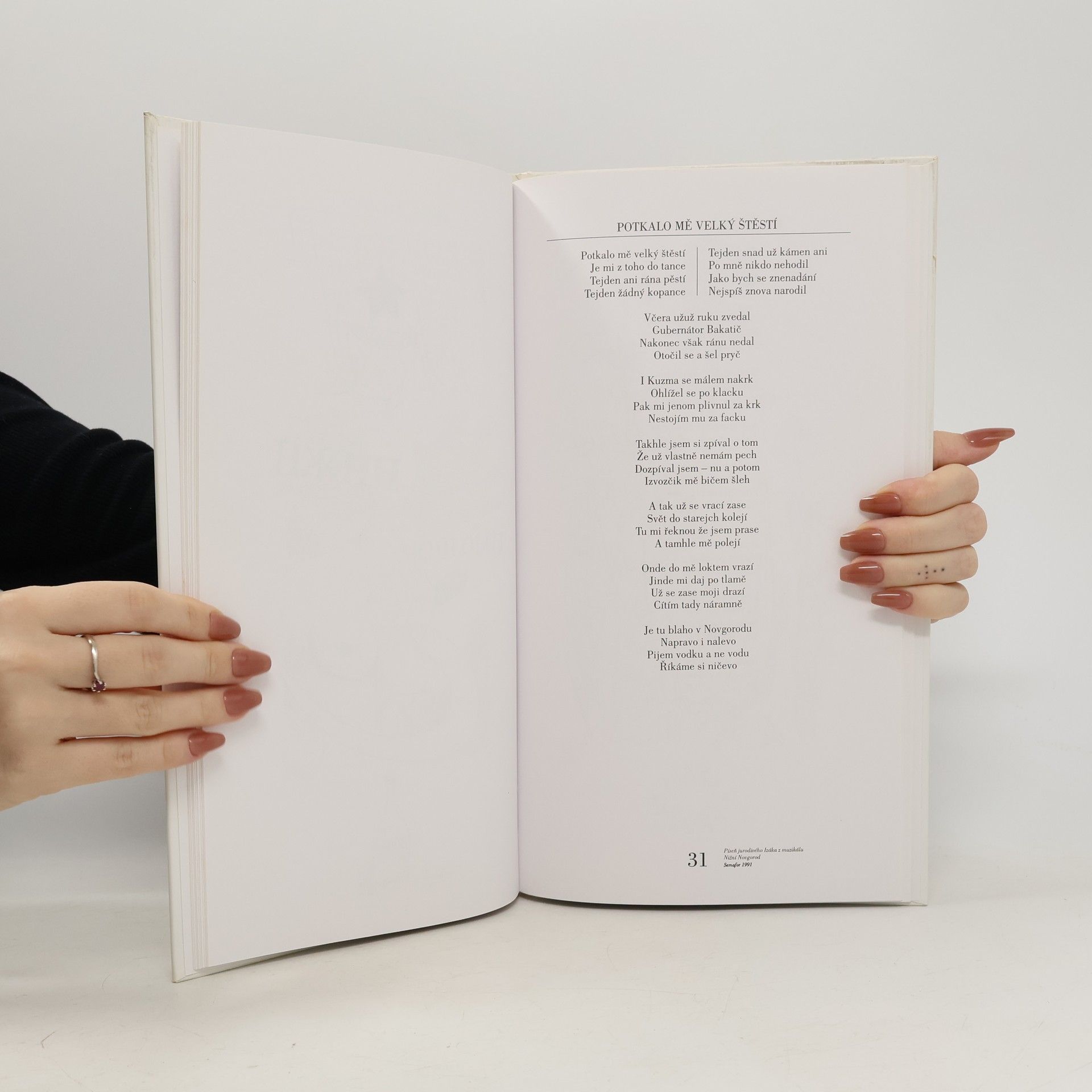 Výběr z textů s kresbami autora. Texty písní z nových - přesněji polistopadových - her Jiřího Suchého, které autor uvedl v Semaforu, doplňují ilustrace výtvarníka a grafika Jiřího Suchého