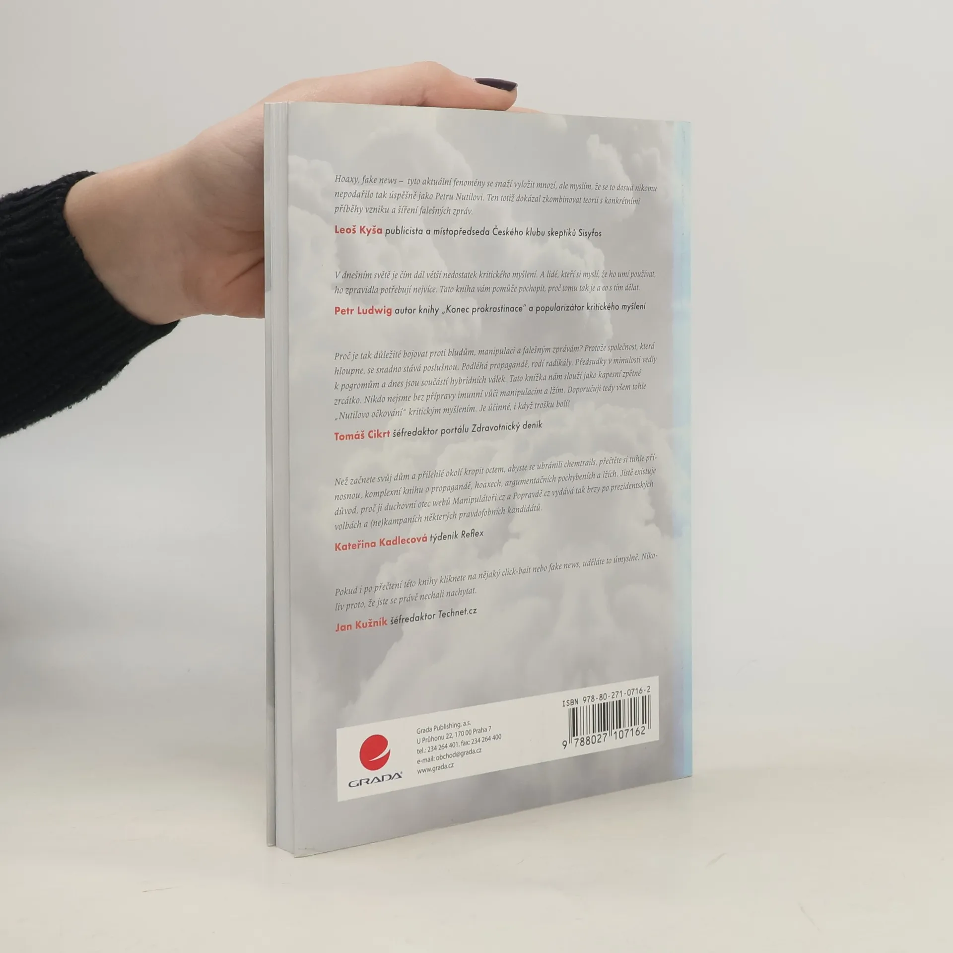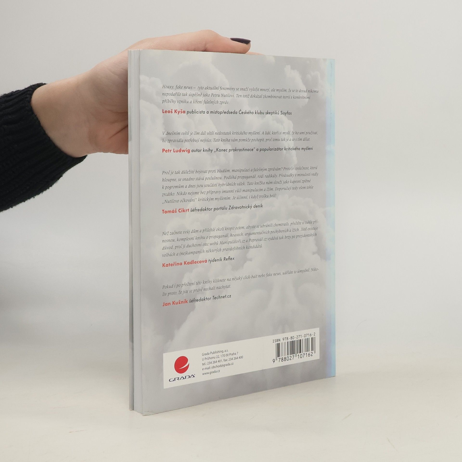 - Jak jsme manipulováni a nevíme o tom? - Co jsou to hoaxy? - Ukazují média svět takový, jaký skutečně je? - Proč nám politici lžou? - Co je to mediální gramotnost? - Proč je potřeba kritické myšlení? - A jak si s námi zahrává mozek? To jsou jen některé z aktuálních otázek, na které najdete odpovědi v této knize. Jejím autorem je spoluzakladatel webu manipulatori.cz, který se snaží podporovat nezávislé a kritické myšlení a odkrývat mediální lži. V první části knihy odhalíte zákonitosti našeho chování a rozhodování. Zjistíte, proč naše přání tak často formují budoucnost, pochopíte, jak nás ovlivňuje naše vlastní iracionalita, proč podléháme skupinové hlouposti a jak snadno se dopouštíme myšlenkových chyb. Druhá část knihy se věnuje žhavé současnosti. Zaměřuje se na běžně užívané argumentační fauly a na odhalení manipulativních a propagandistických postupů v politice i médiích. Poznáte zákulisí mediálního průmyslu a výroby zpráv i techniky, jak námi média mohou manipulovat. A v neposlední řadě porozumíte tomu, jak odhalovat falešné zprávy, poznat pravdu od lži a nepodlehnout konspiračnímu myšlení.