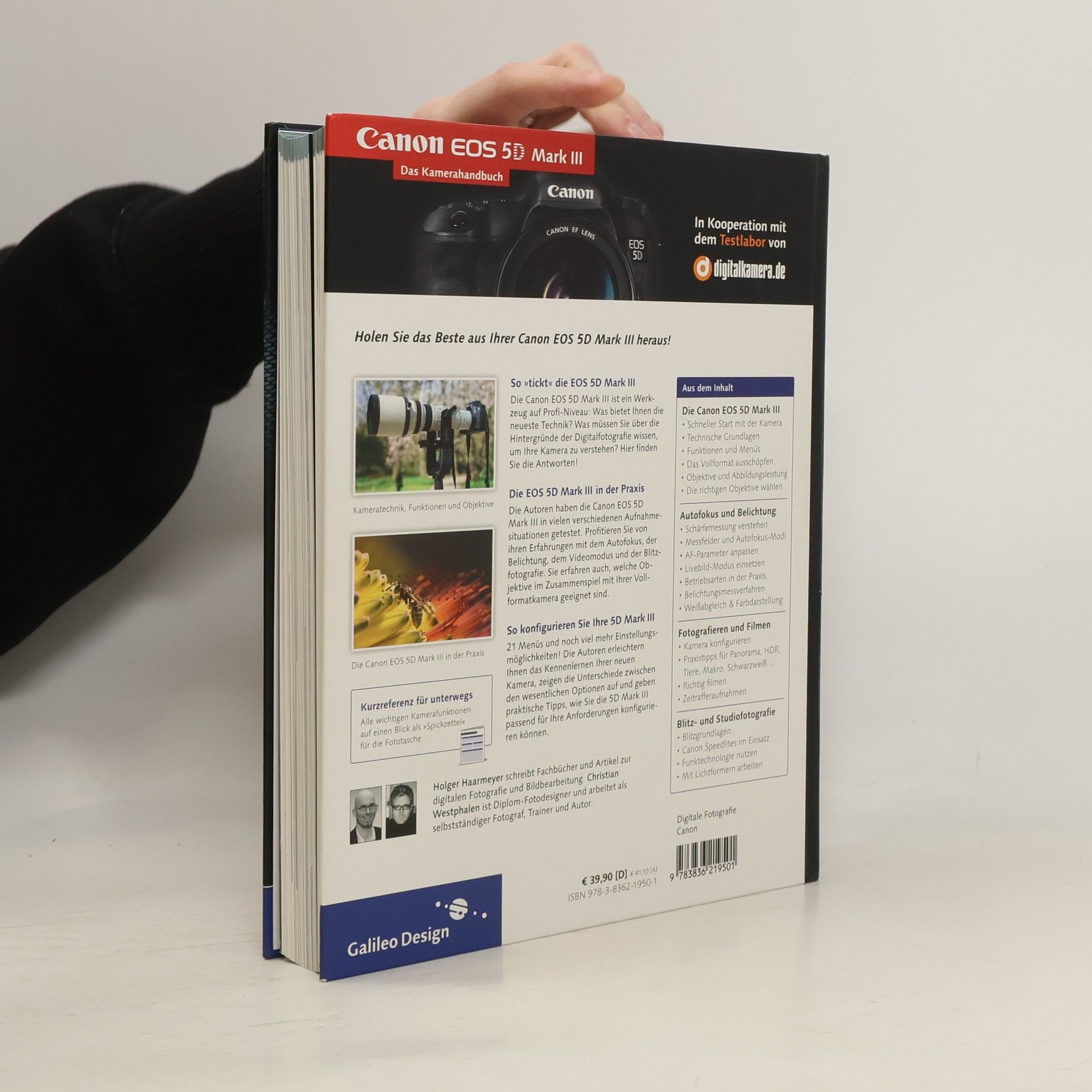 Machen Sie das Beste aus Ihrer Canon EOS 5D Mark III! Mit diesem umfassenden Buch erfahren Sie alles über die Technik und den praktischen Einsatz Ihrer Vollformatkamera. Sie lernen detailliert, wie Sie den Autofokus der EOS 5D Mark III richtig nutzen, die Belichtung steuern, mit der Kamera filmen sowie mit Blitz- und Studiolicht umgehen. Sie entdecken die passenden Objektive und sinnvolles Zubehör. Und nicht zuletzt erfahren Sie, welche Erkenntnisse Holger Haarmeyer und Christian Westphalen beim praktischen Einsatz der EOS 5D Mark III gewonnen haben: von der Porträt- und Naturfotografie über die Nachtfotografie bis zum Filmen. Zahlreiche Konfigurationstipps, die die Autoren aus ihrer Praxis abgeleitet haben, erleichtern Ihnen den Start mit der EOS 5D Mark III. Ein ausführlicher Anhang zeigt Ihnen alle Tasten, Menüs und die Bedienung im Überblick. Inklusive Kurzreferenz für unterwegs: Alle wichtigen Kamerafunktionen auf einen Blick als „Spickzettel“ für die Fototasche. Damit Sie Ihre Kamera im Griff haben: - Die Canon EOS 5D Mark III kennenlernen - Autofokus und Schärfe - Belichtung - Filmen - Blitz- und Studiolicht - Objektive und Zubehör - Individuelle Anpassungen - Die Canon EOS 5D Mark III in der Praxis - Anhang: Bedienung, Tasten & Menüs, Infoteil, Glossar Galileo Press heißt jetzt Rheinwerk Verlag.