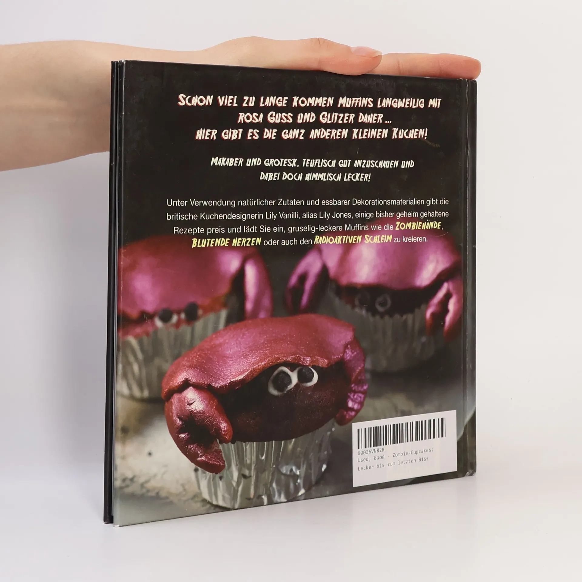 Schon viel zu lange kommen Cupcakes langweilig mit rosa Guss und Glitzer daher. Hier gibt es die ganz anderen Muffins! Makaber und grotesk, teuflisch gut anzuschauen und dabei doch himmlisch lecker! Unter Verwendung natürlicher Zutaten und essbarer Dekorationsmaterialien gibt die britische Kuchendesignerin, Lily Vanilli, alias Lily Jones, einige bisher geheimgehaltene Rezepte preis und lädt Sie ein, gruselig-leckere Cupcakes wie z. G. die „Zombiehände“, „Blutende Herzen“ oder auch den „Radioaktiven Schleim“ zu kreieren.