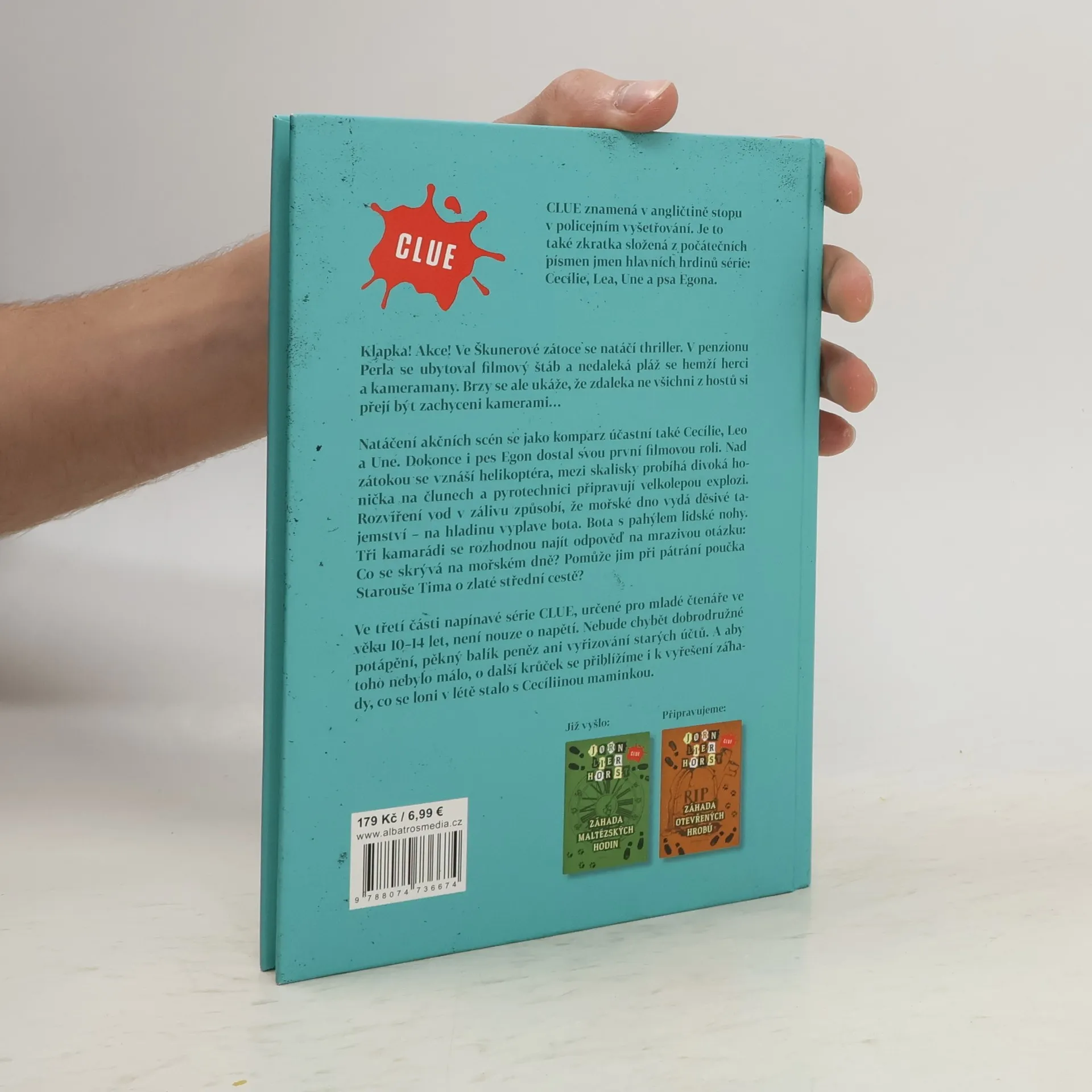 Ve Škunerové zátoce se natáčí thriller. V penzionu Perla se ubytoval filmový štáb a pláž se hemží herci. Natáčení akčních scén se jako komparz účastní také Cecílie, Leo, Une a dokonce i pes Egon. Nad zátokou se vznáší helikoptéra, mezi ostrůvky probíhá divoká honička na člunech a pyrotechnici připravují velkolepou explozi. Ta zvíří vody zálivu tak důkladně, že mořské dno vydá děsivé tajemství – na hladinu vyplave bota. Bota se zbytkem lidské nohy… Ve třetí části série CLUE není nouze o napětí. Nechybí dramatické potápění, spousta peněz a vyřizovaní starých účtů. A aby toho nebylo málo, o další krůček se přiblížíme i k vyřešení záhady, co se stalo loni v létě s Cecíliinou maminkou.
